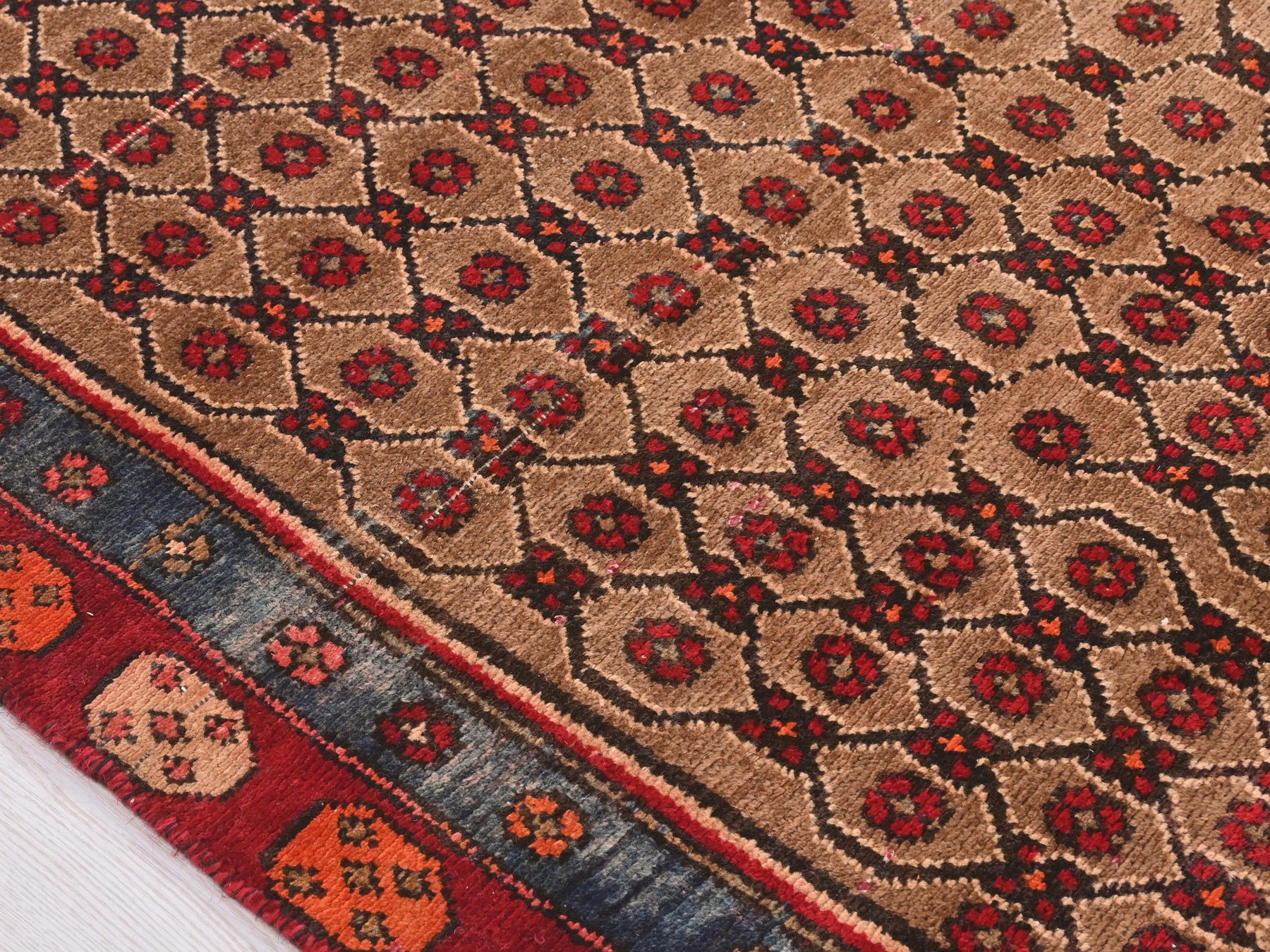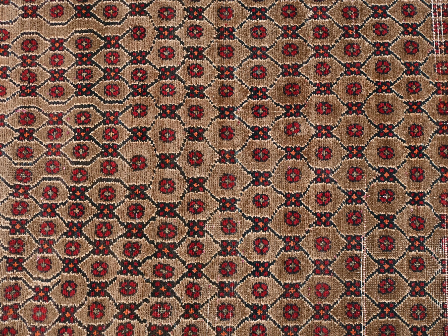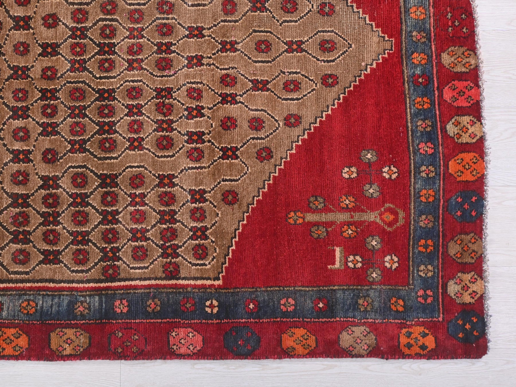 This is a hand-knotted, one-of-a-kind vintage rug. Due to the nature of this piece, there may be slight imperfections in its wear, shape, dimensions, and color. All of our rugs are professionally cleaned and repaired.