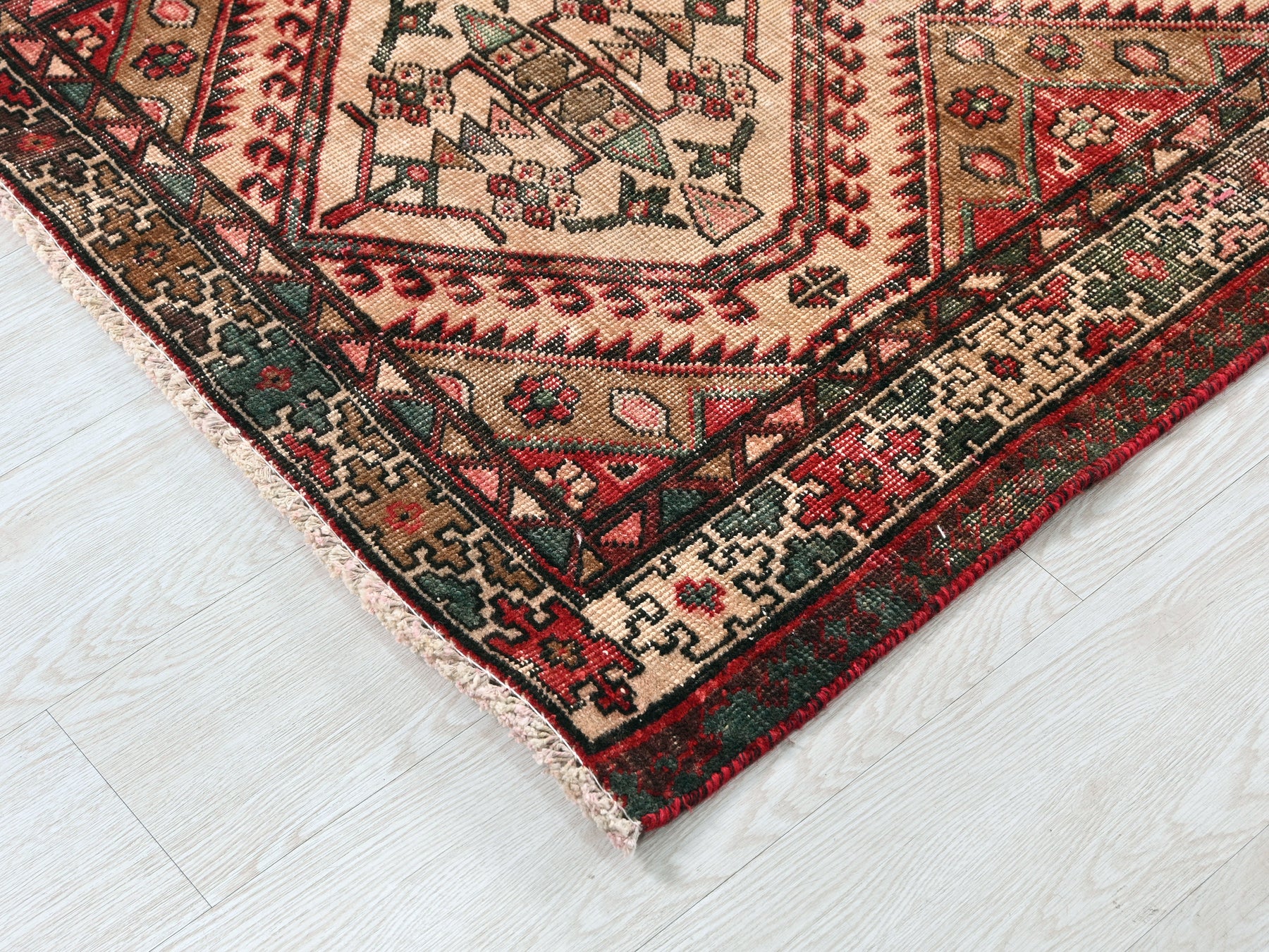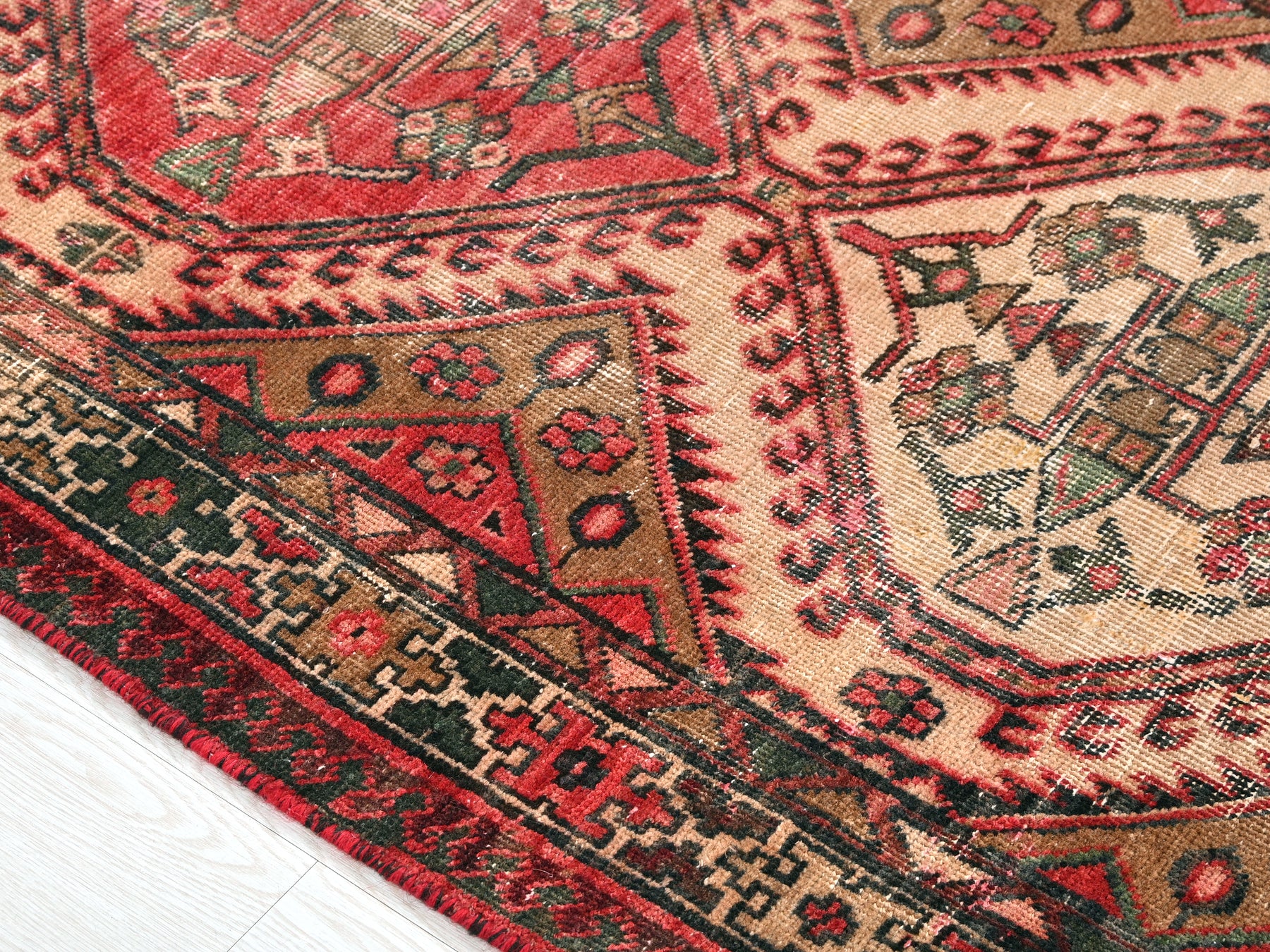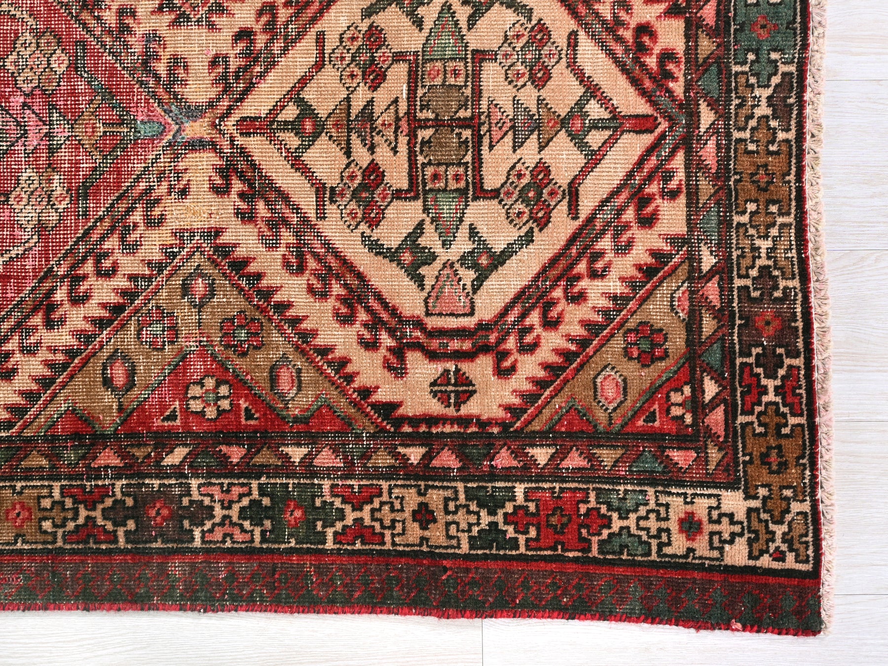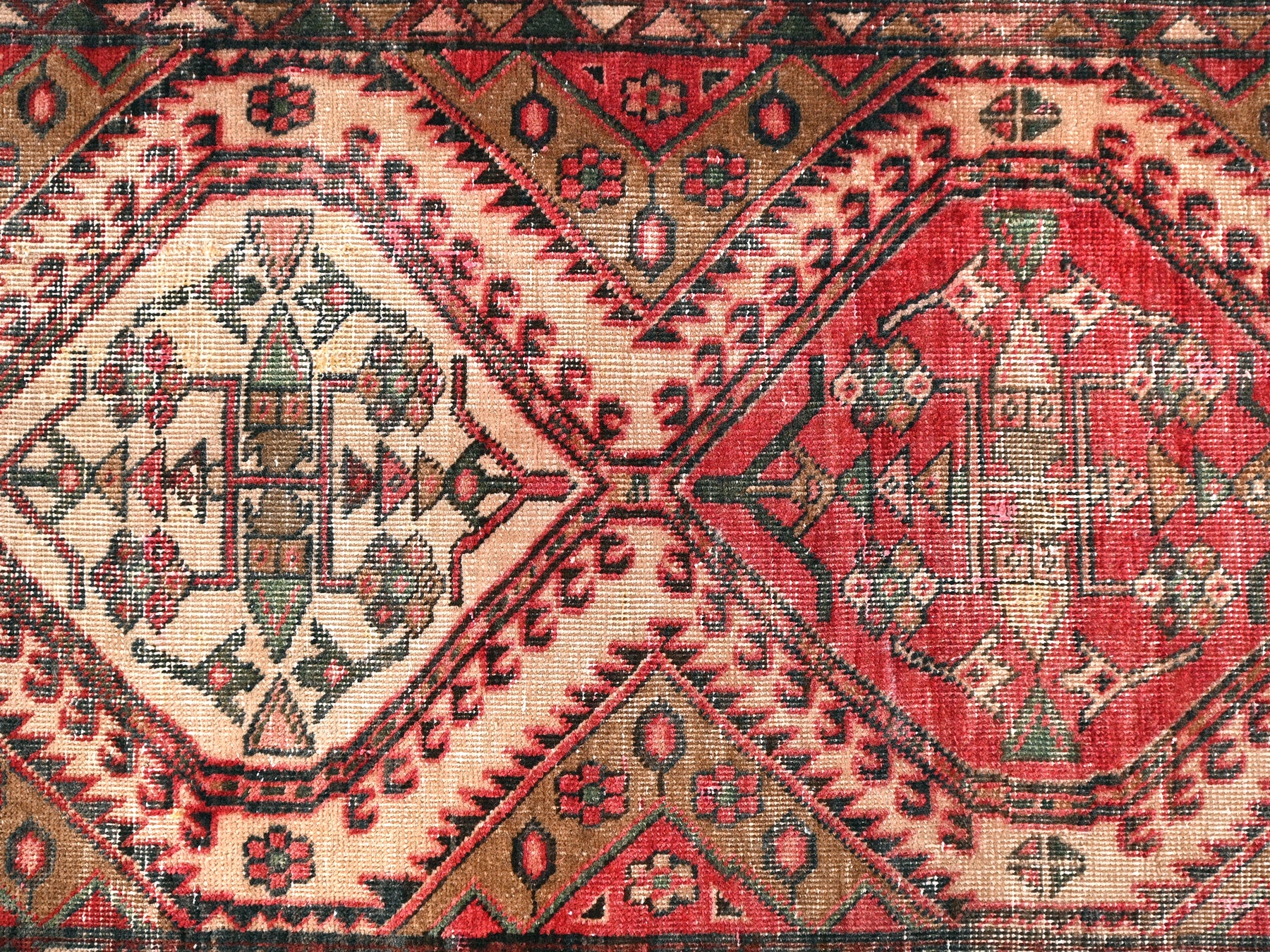 This is a hand-knotted, one-of-a-kind vintage rug. Due to the nature of this piece, there may be slight imperfections in its wear, shape, dimensions, and color. All of our rugs are professionally cleaned and repaired.