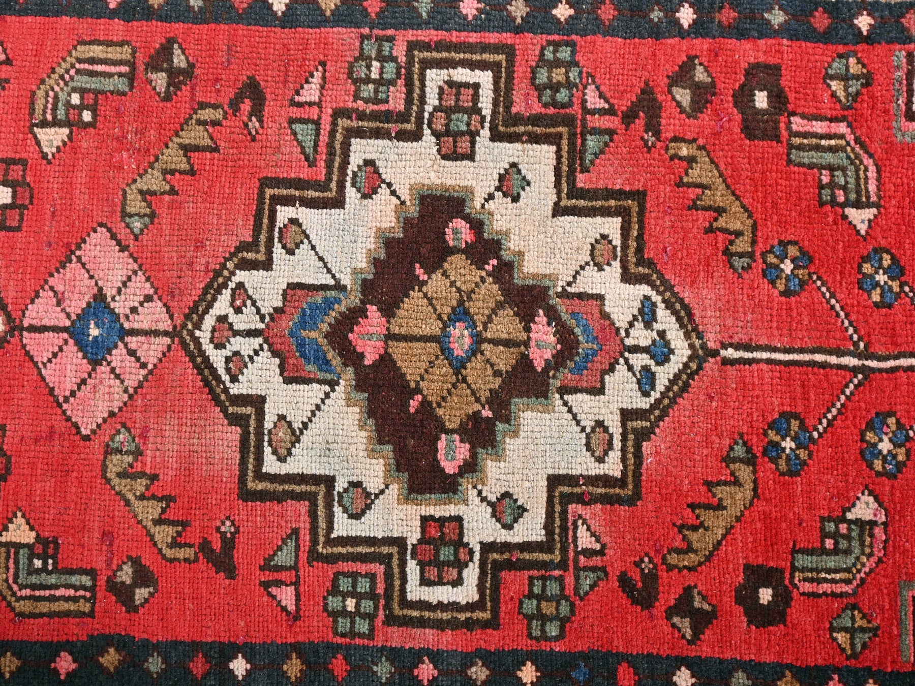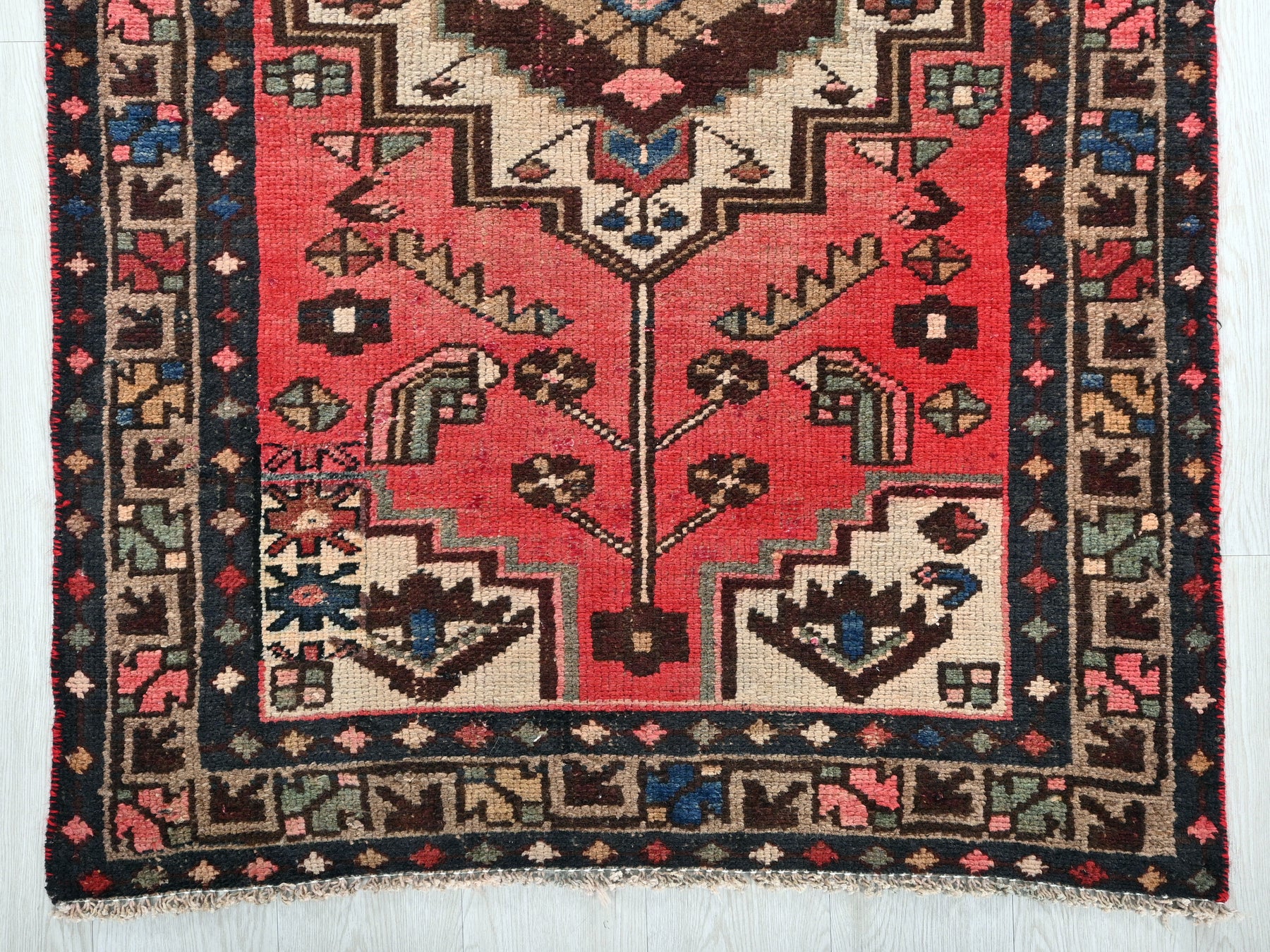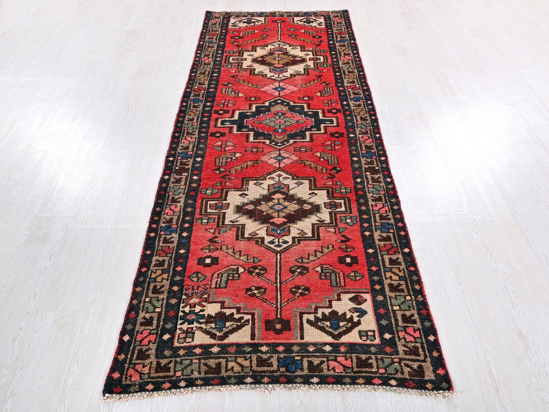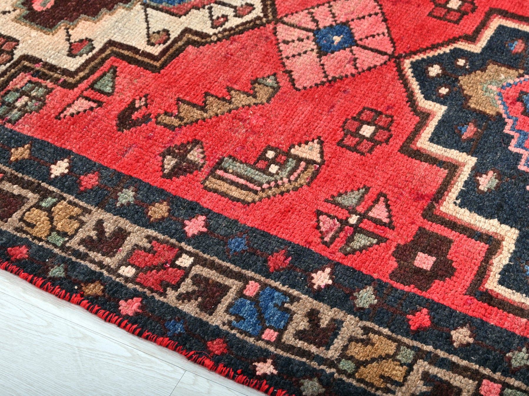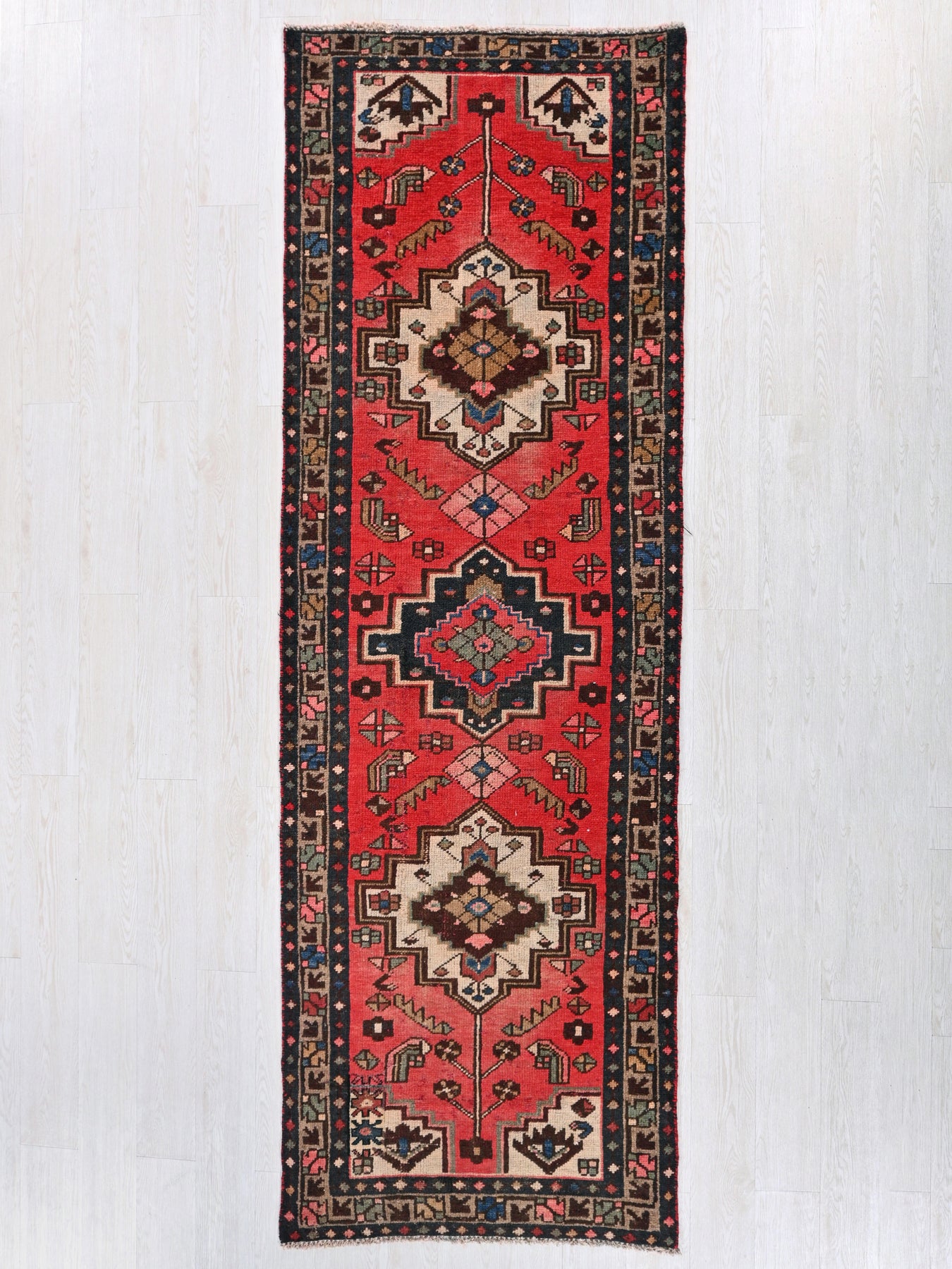 This is a hand-knotted, one-of-a-kind vintage rug. Due to the nature of this piece, there may be slight imperfections in its wear, shape, dimensions, and color. All of our rugs are professionally cleaned and repaired.