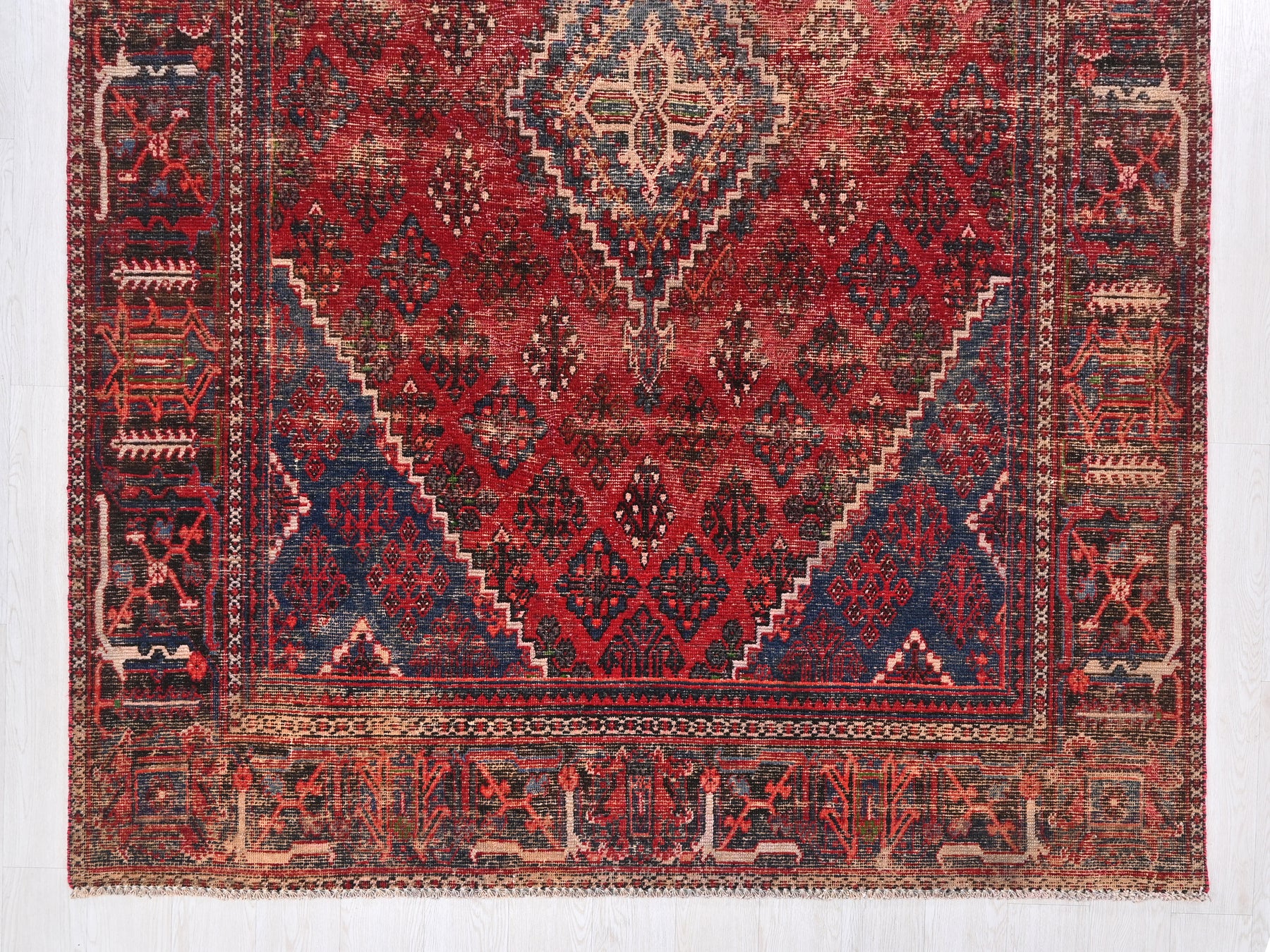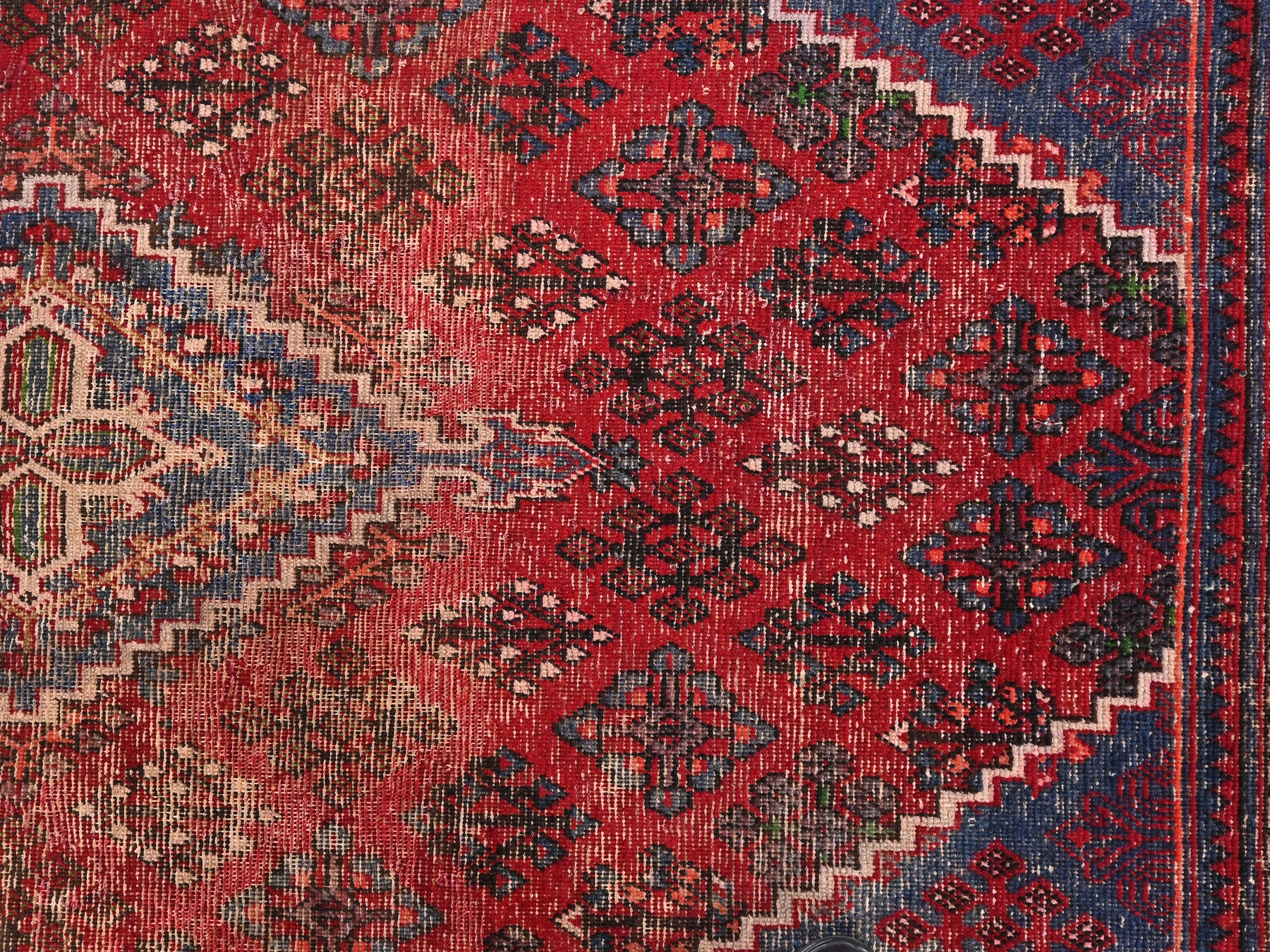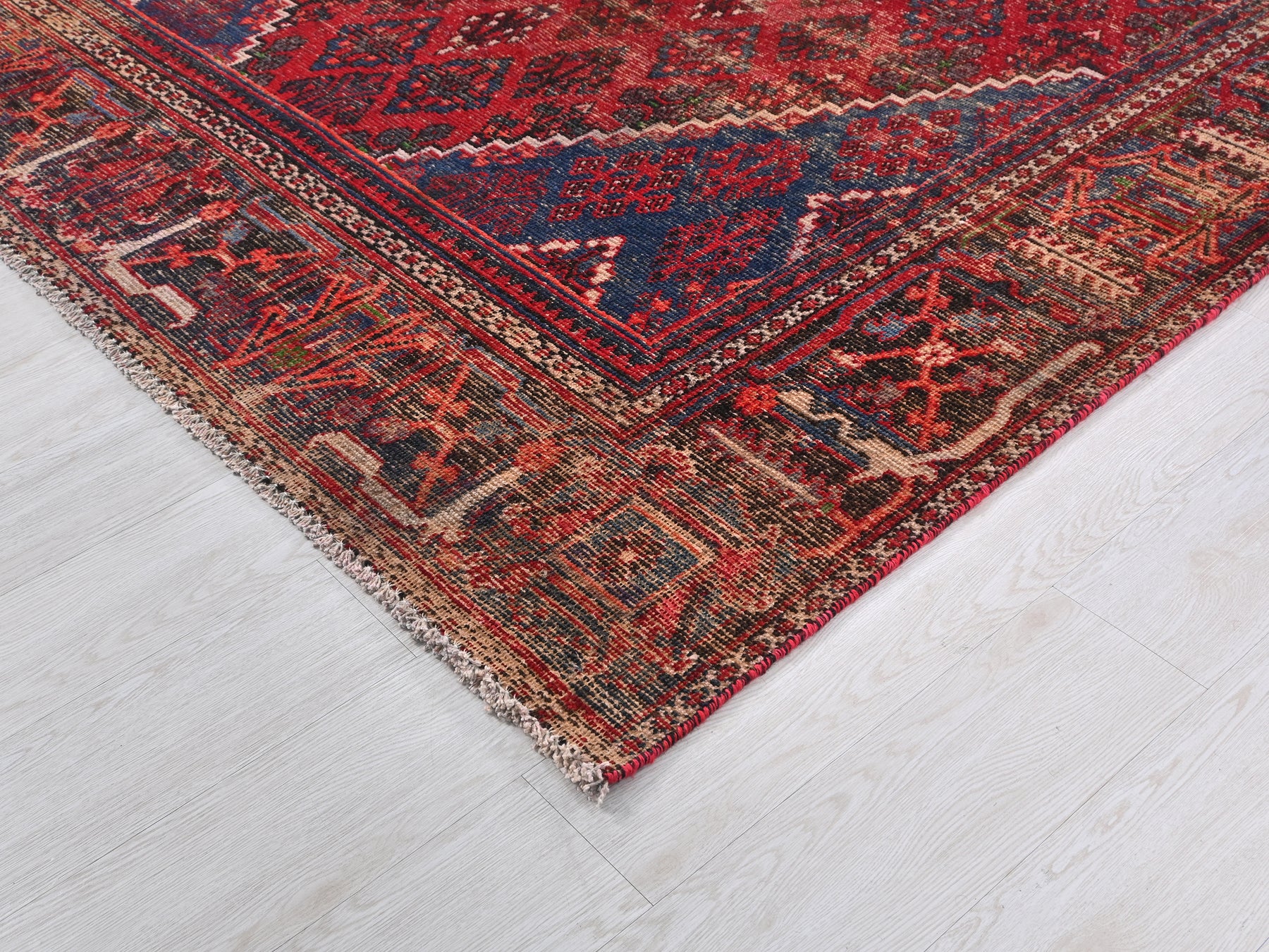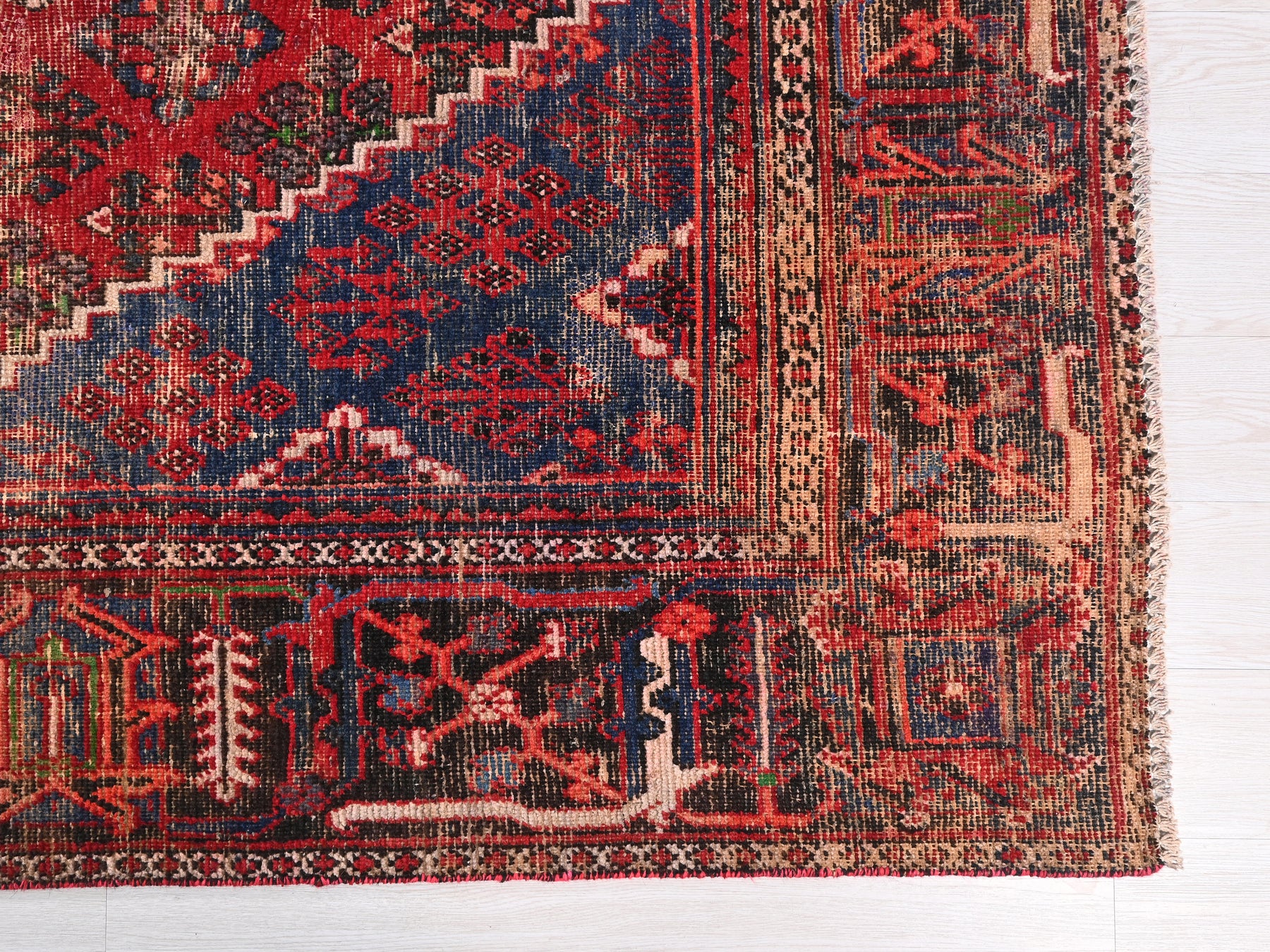 This is a hand-knotted, one-of-a-kind vintage rug. Due to the nature of this piece, there may be slight imperfections in its wear, shape, dimensions, and color. All of our rugs are professionally cleaned and repaired.