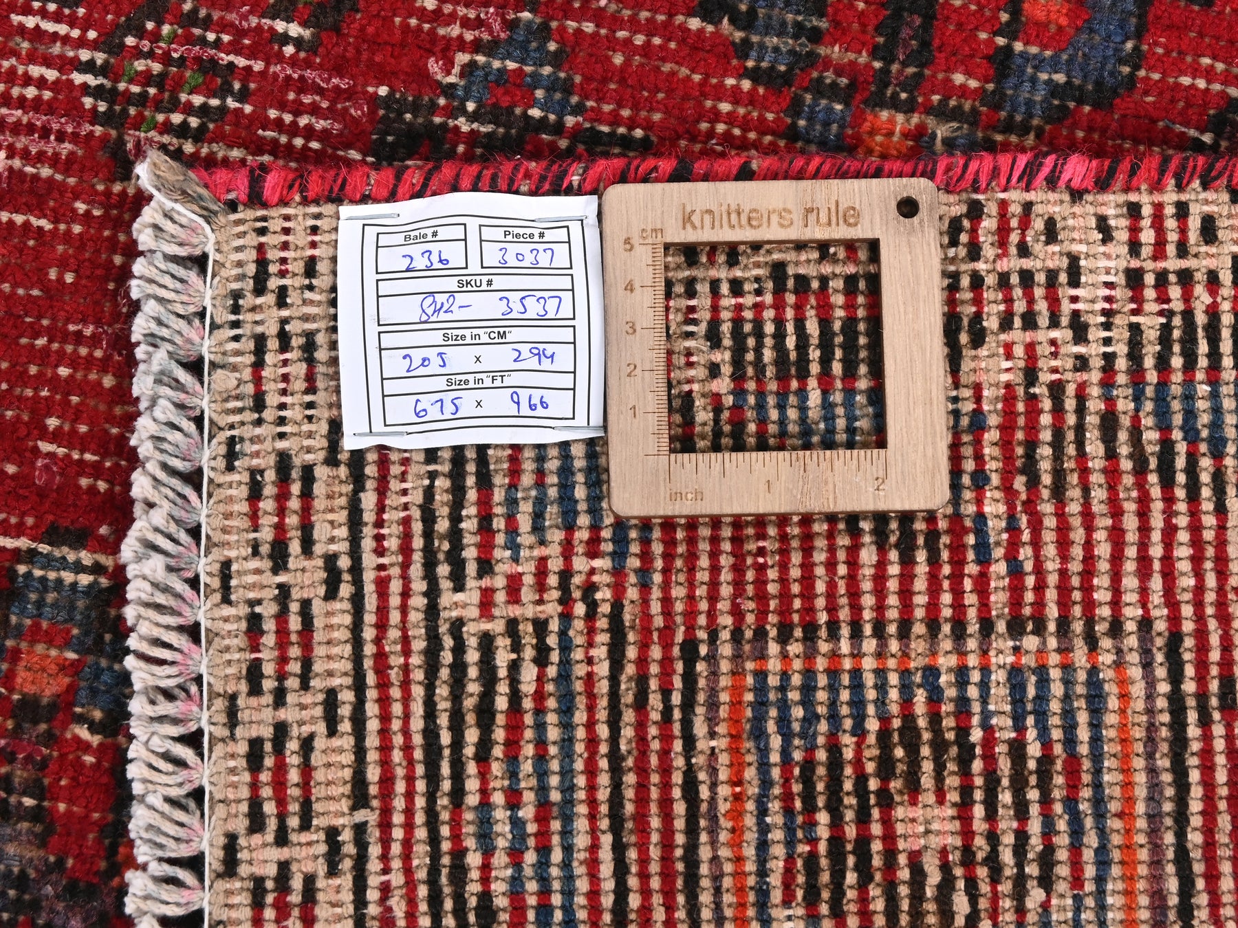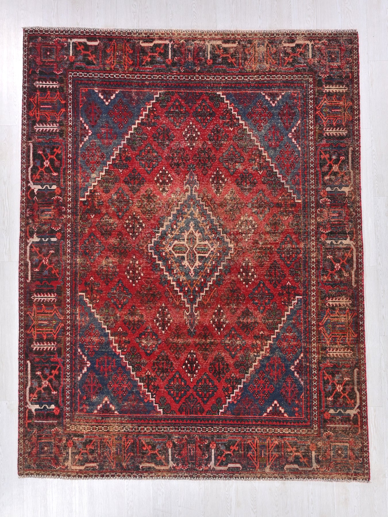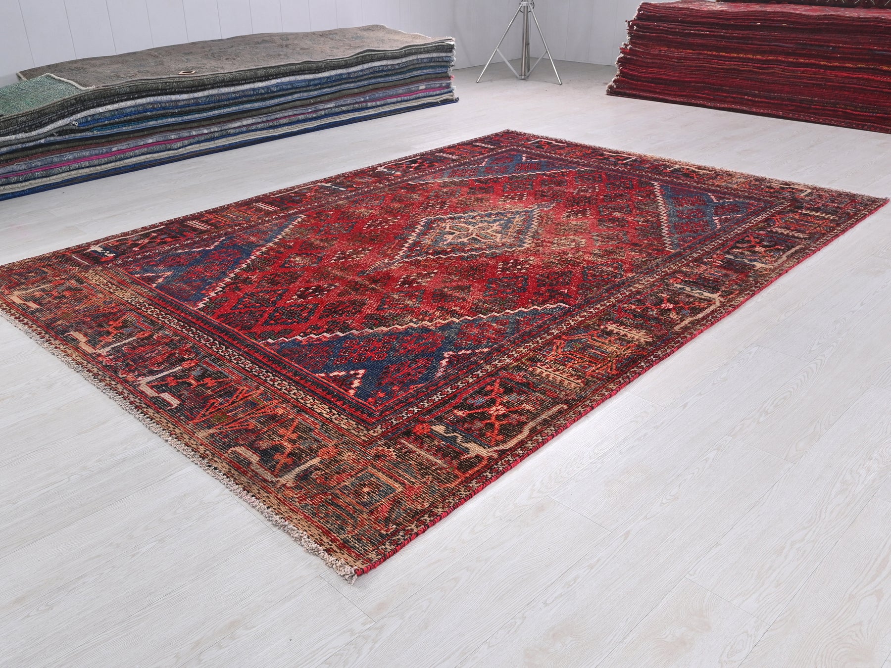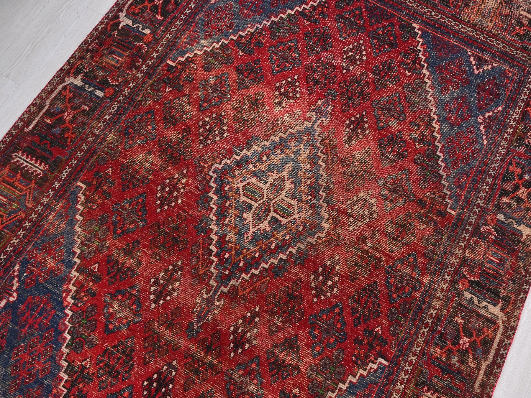 This is a hand-knotted, one-of-a-kind vintage rug. Due to the nature of this piece, there may be slight imperfections in its wear, shape, dimensions, and color. All of our rugs are professionally cleaned and repaired.