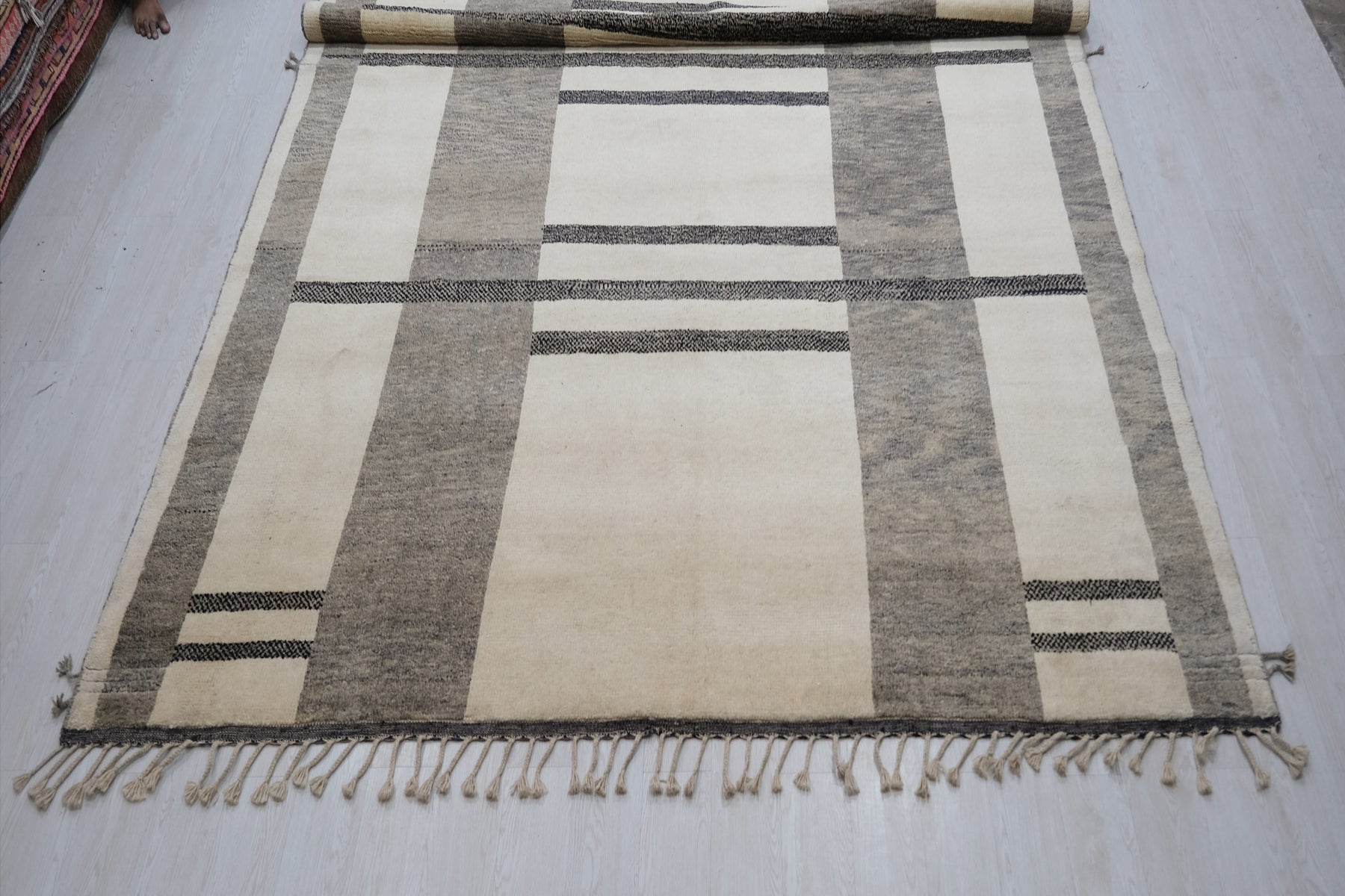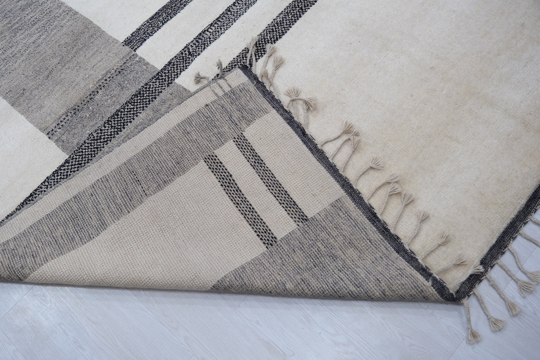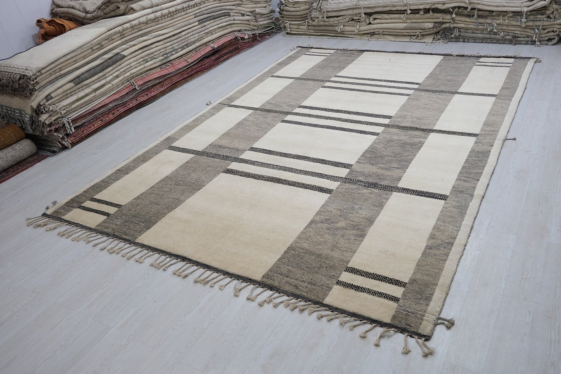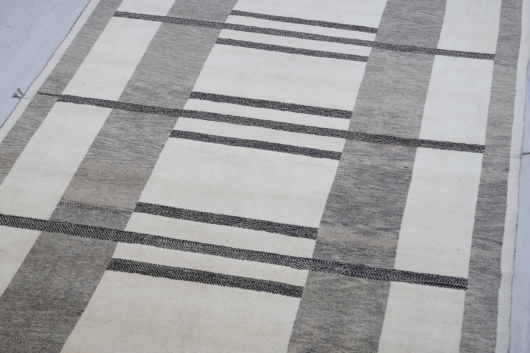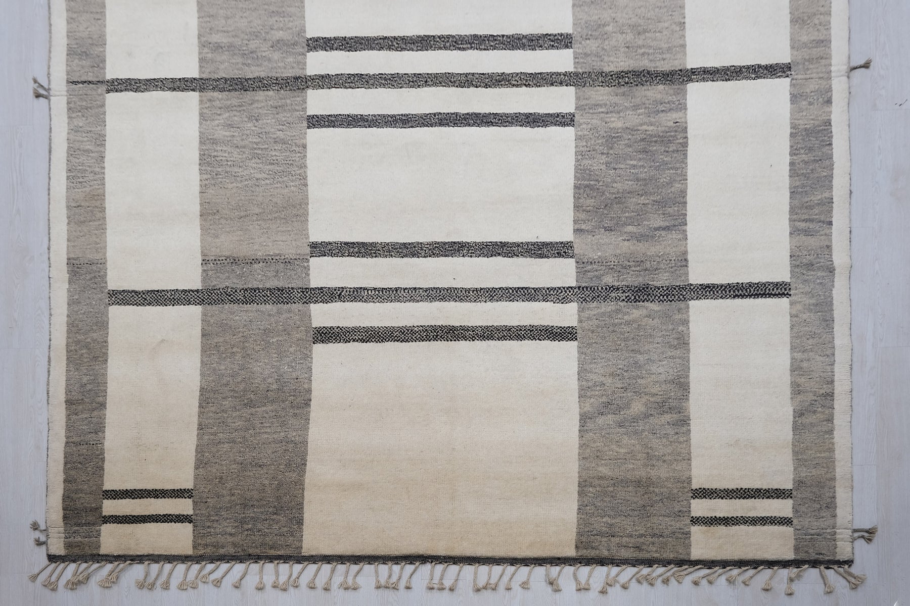 Moroccan Area RugDimensions: 9'1" x 12'0"Colors: Champagne, Black, GreyYear of Origin: Circa 1960Material: WoolPile: Low/MediumRug No: MOR2403