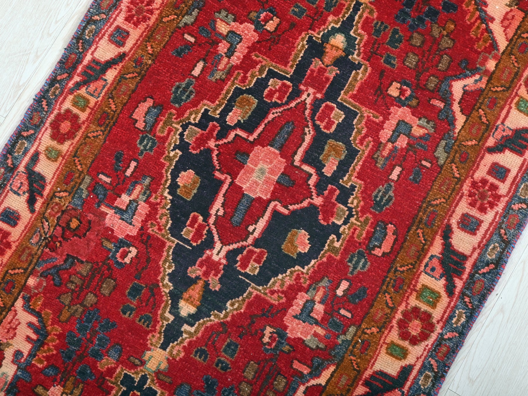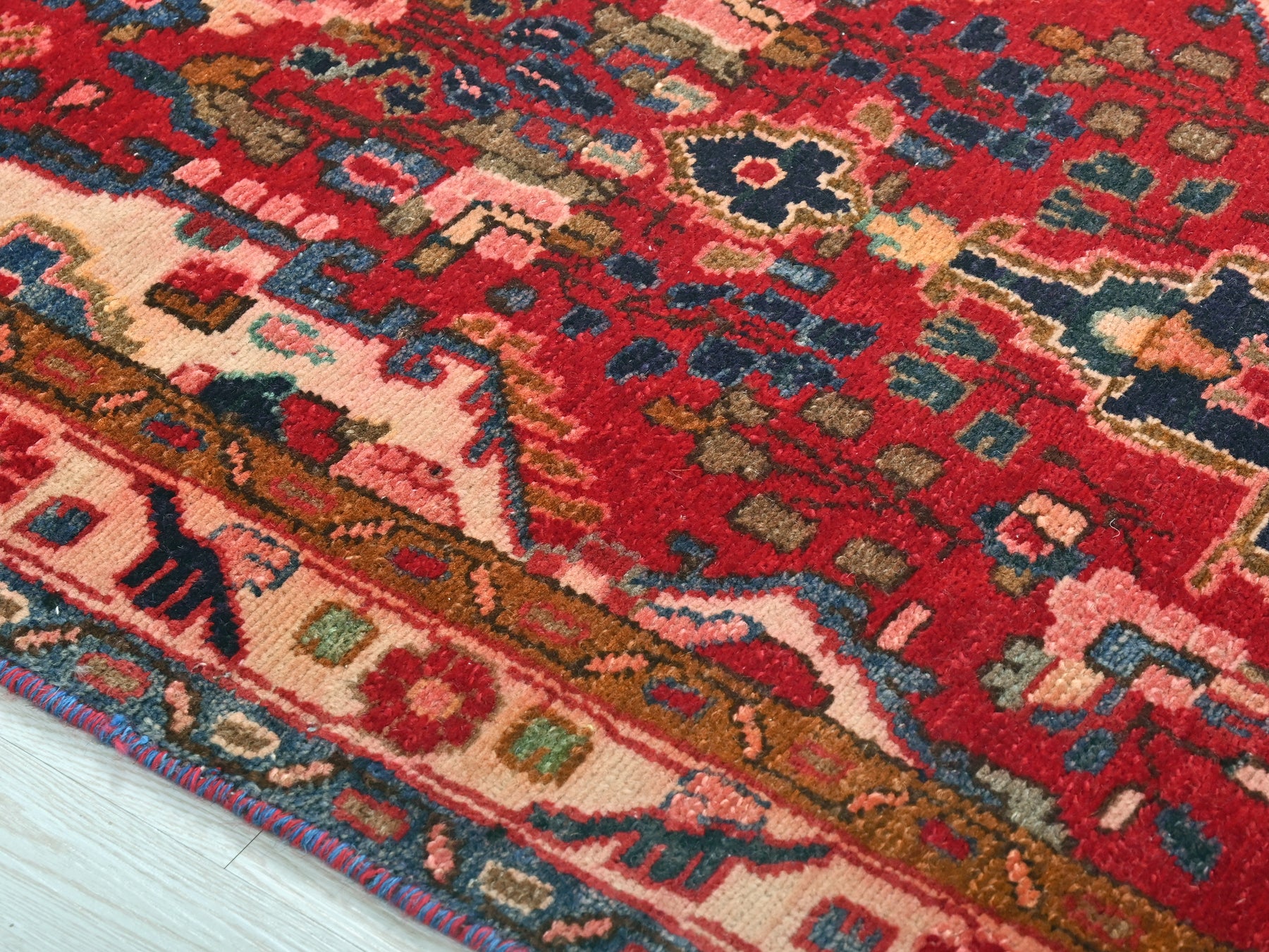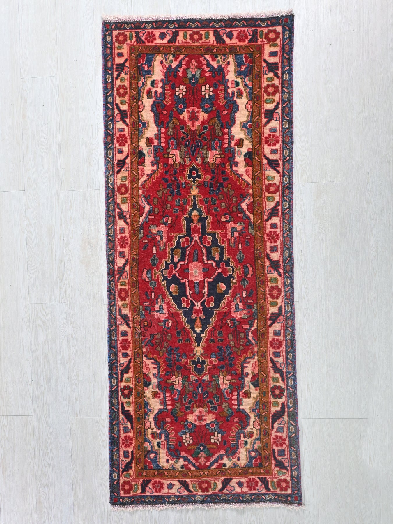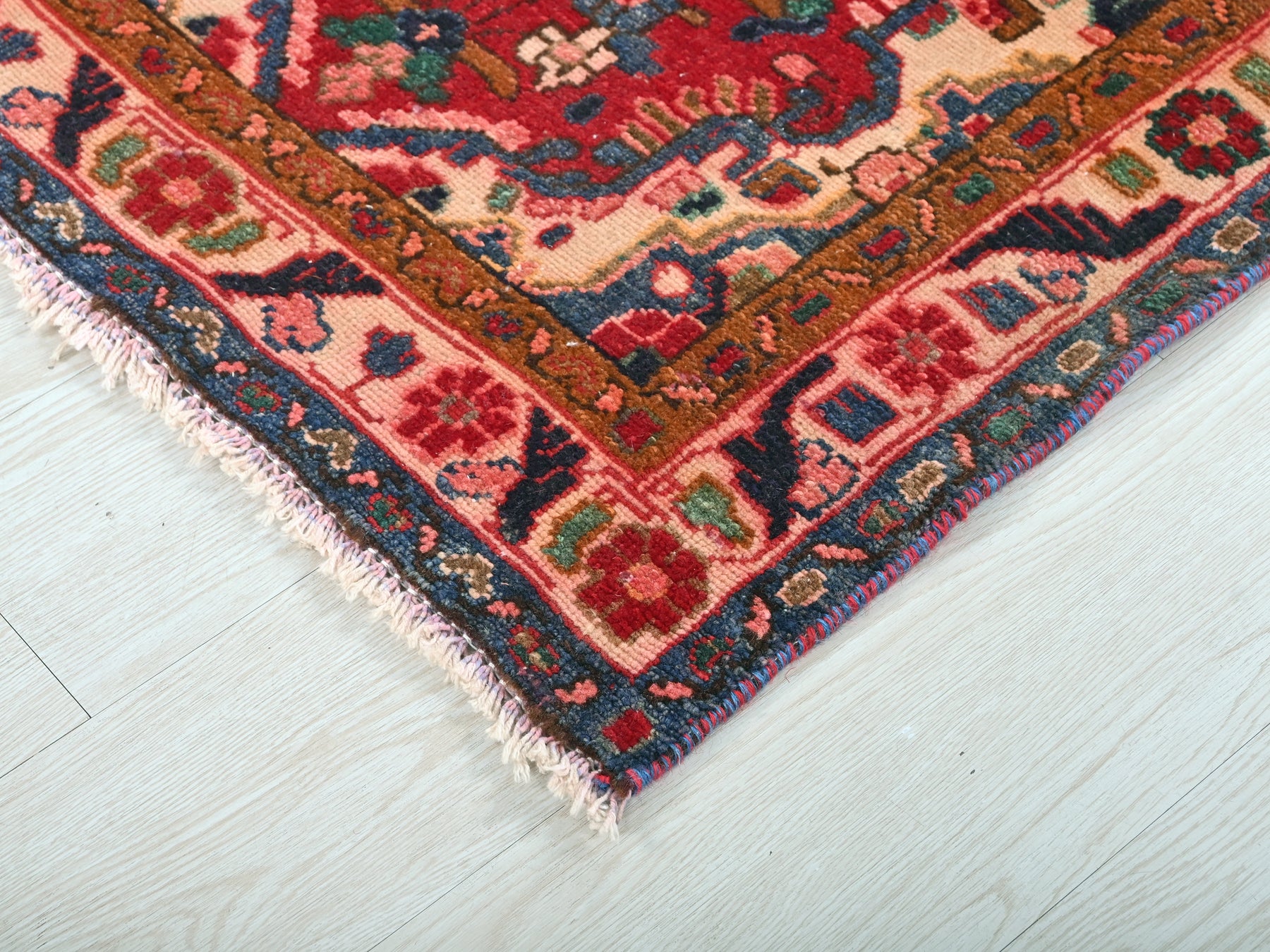 This is a hand-knotted, one-of-a-kind vintage rug. Due to the nature of this piece, there may be slight imperfections in its wear, shape, dimensions, and color. All of our rugs are professionally cleaned and repaired.