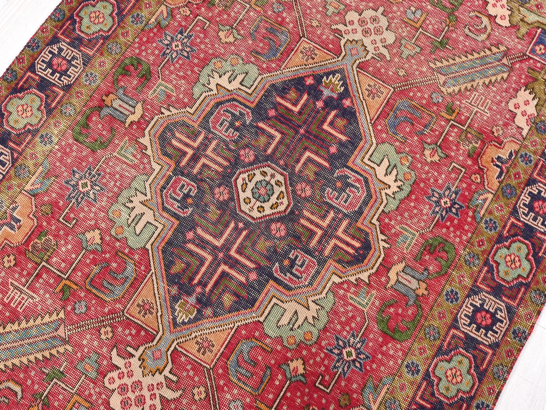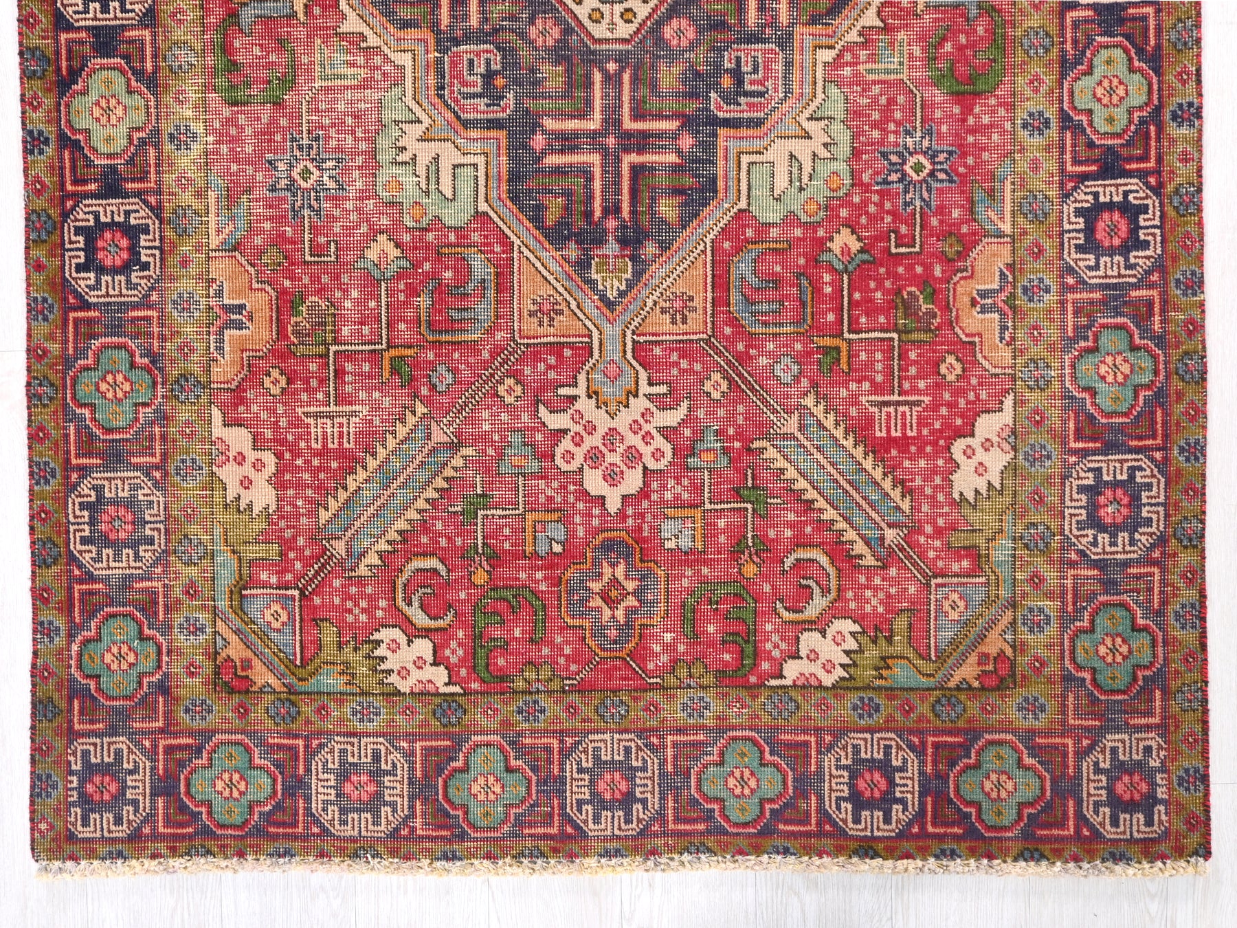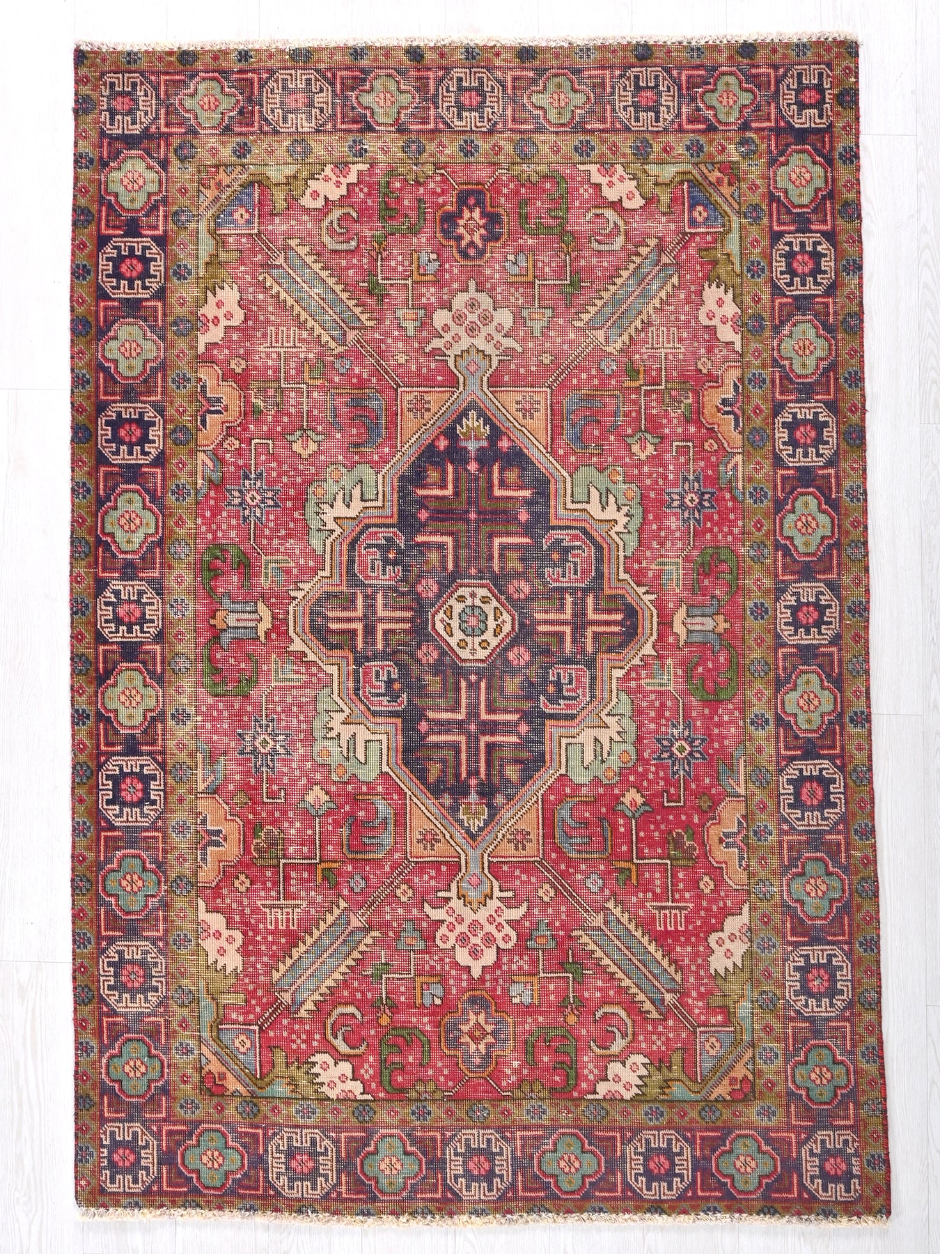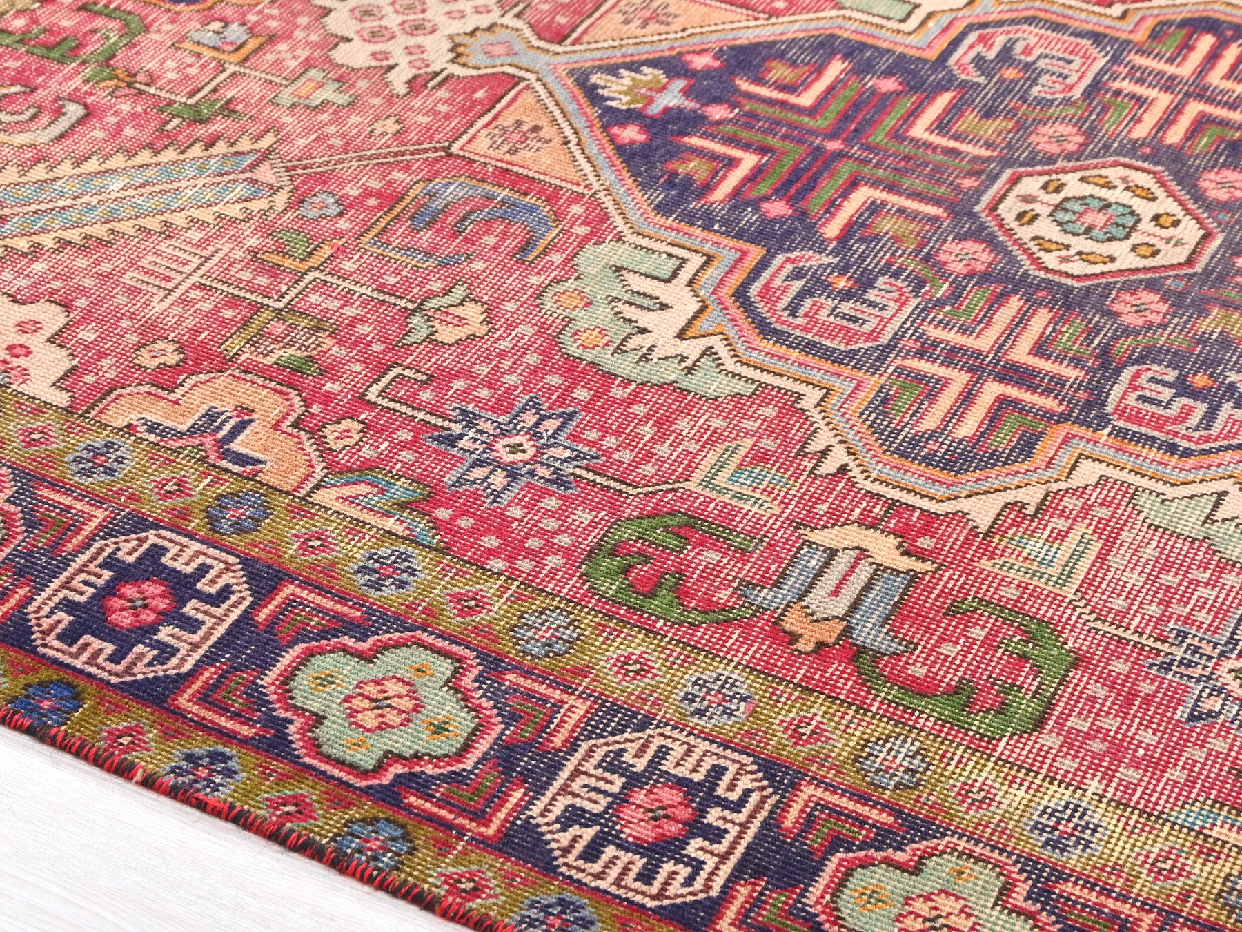 This is a hand-knotted, one-of-a-kind vintage rug. Due to the nature of this piece, there may be slight imperfections in its wear, shape, dimensions, and color. All of our rugs are professionally cleaned and repaired.