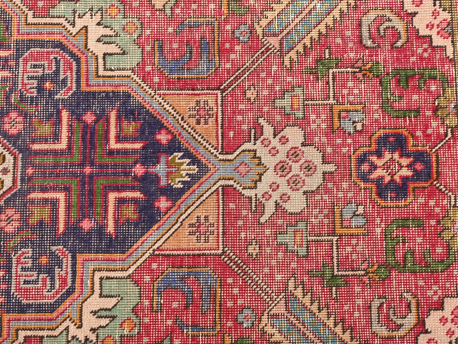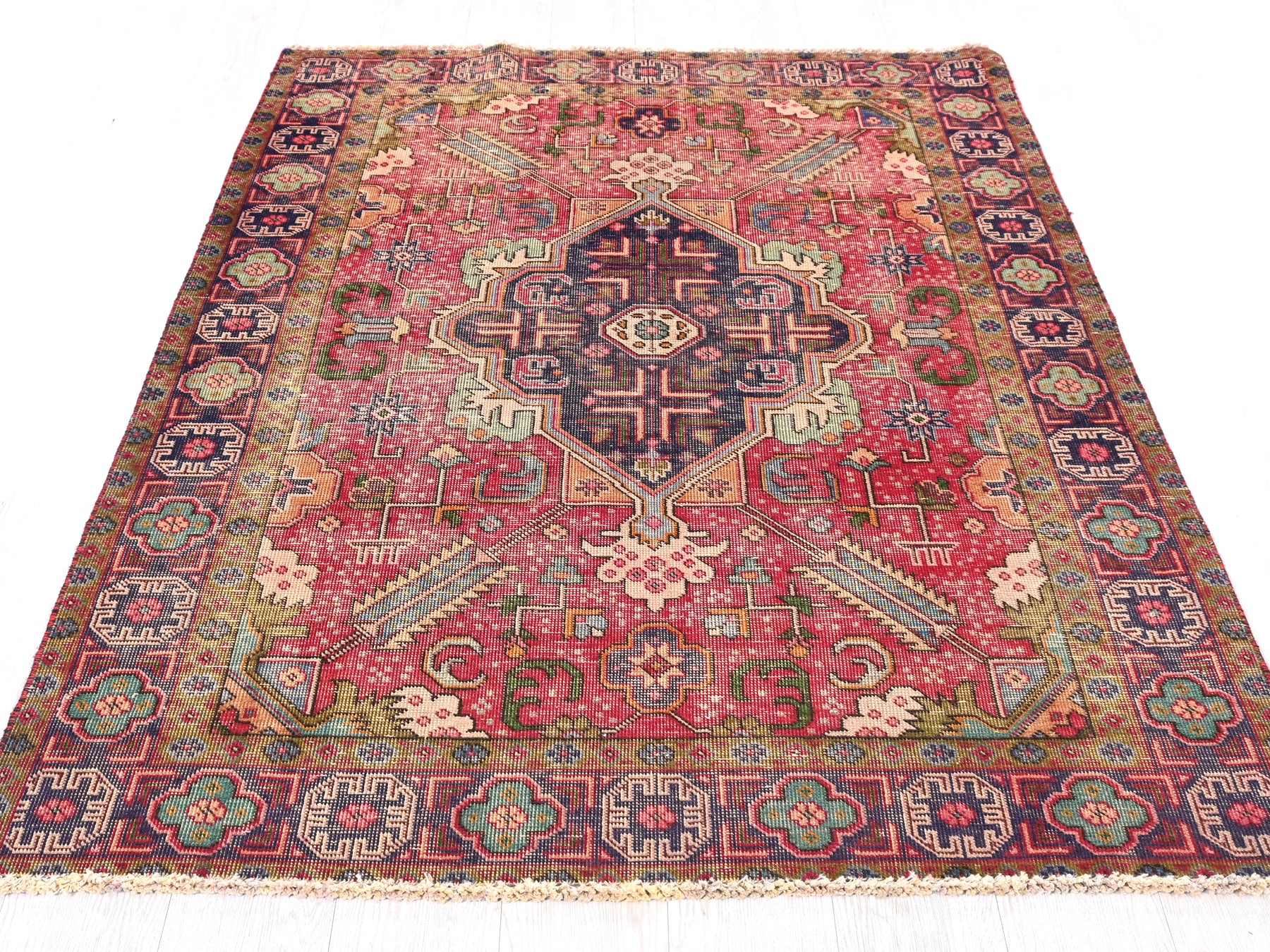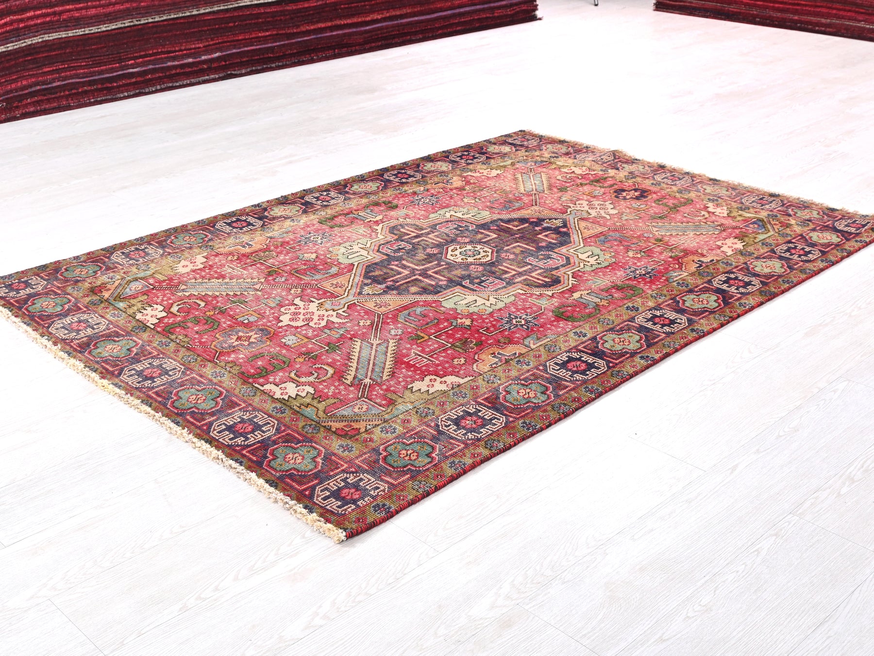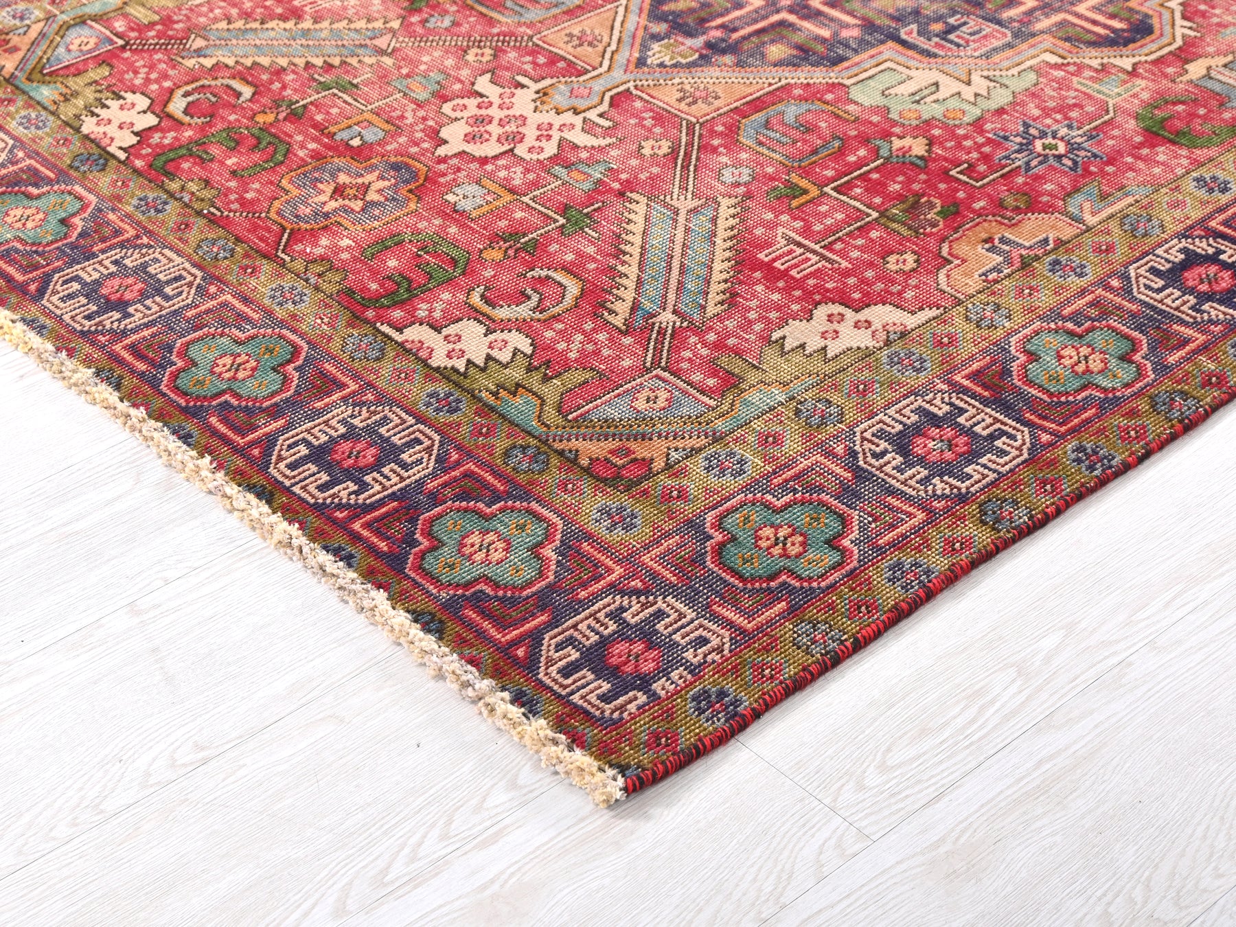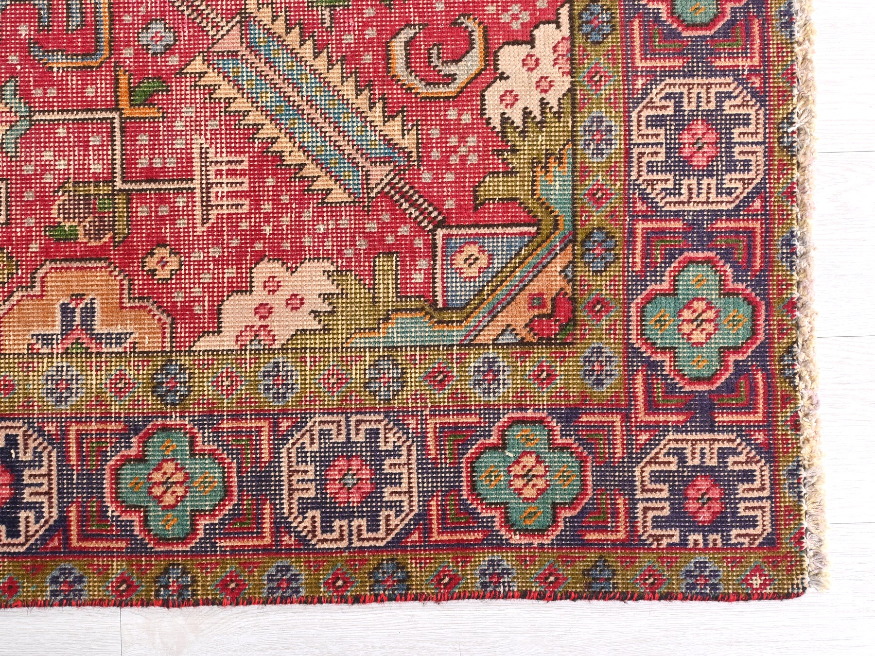 This is a hand-knotted, one-of-a-kind vintage rug. Due to the nature of this piece, there may be slight imperfections in its wear, shape, dimensions, and color. All of our rugs are professionally cleaned and repaired.