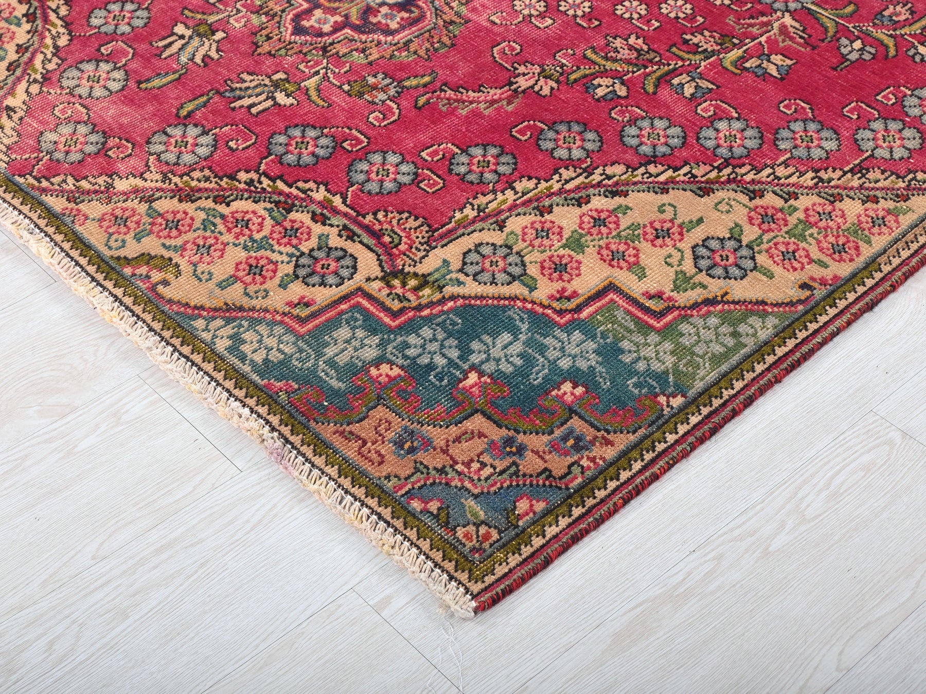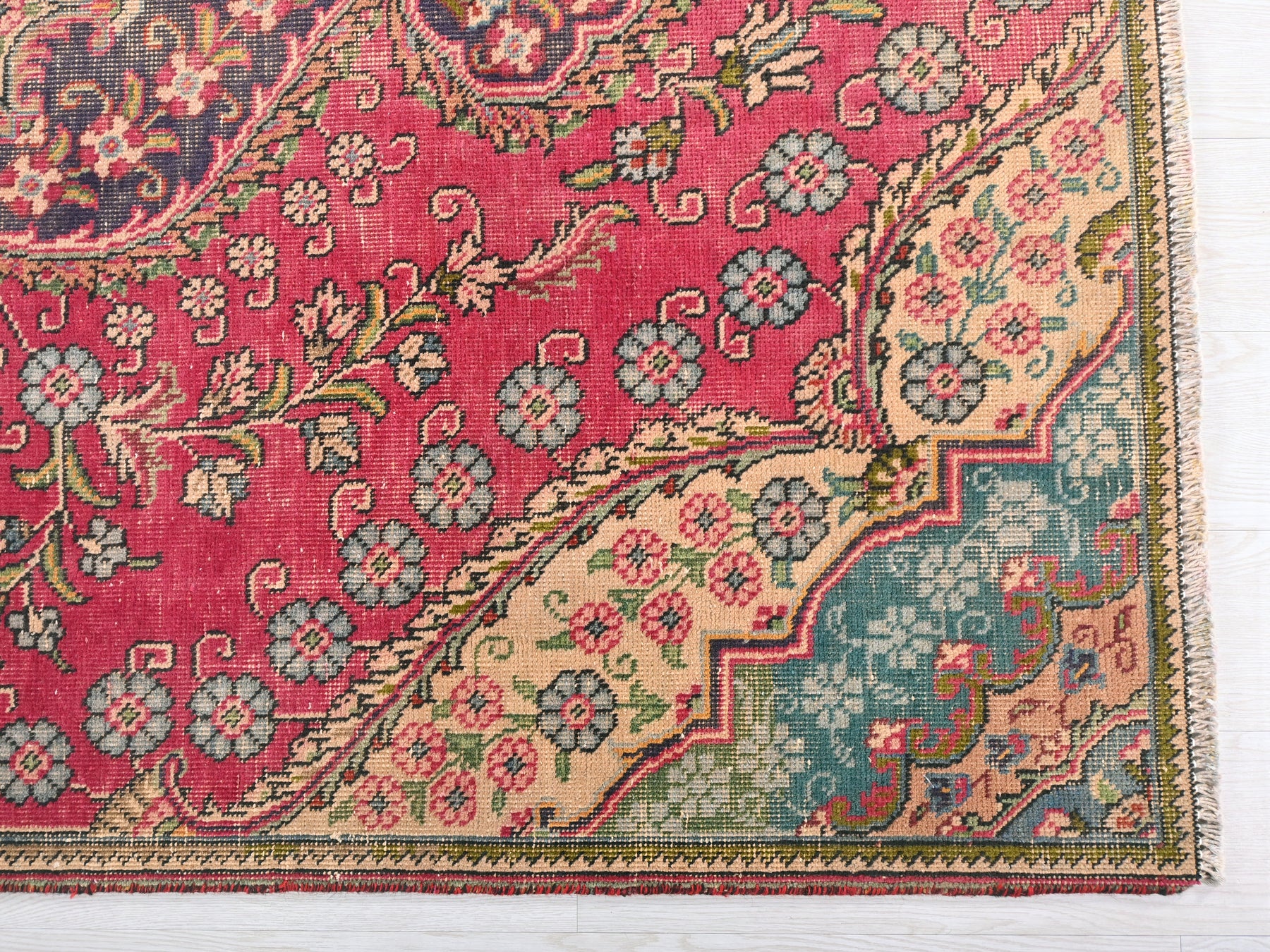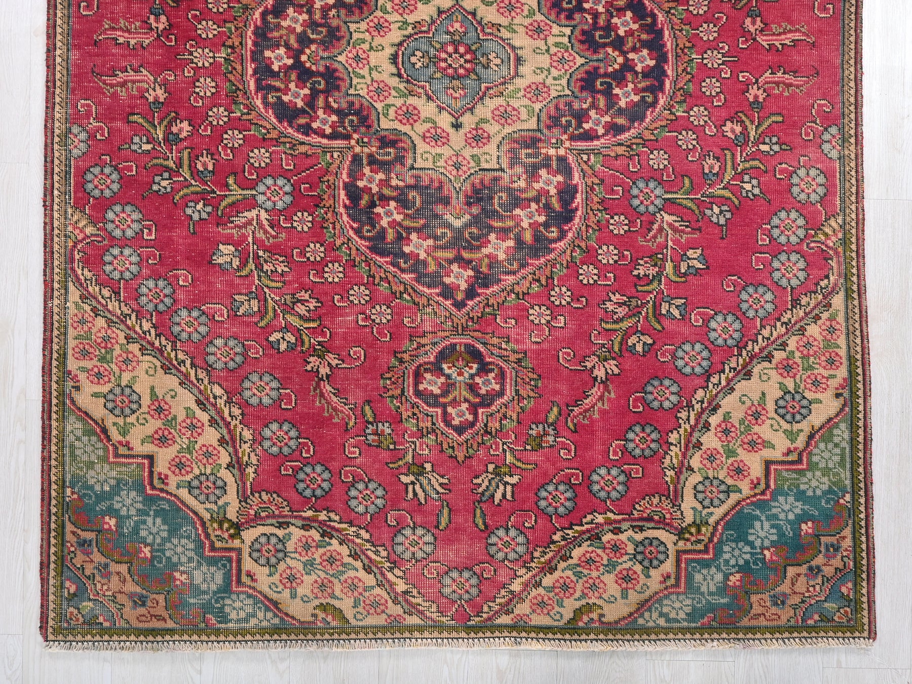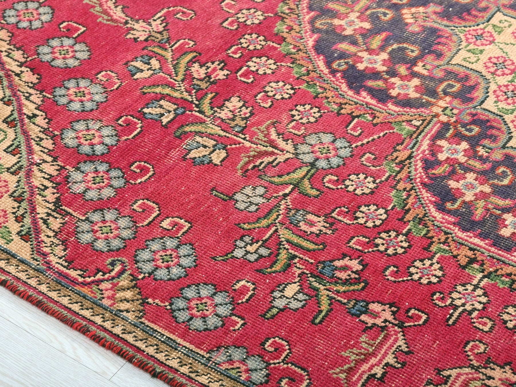 This is a hand-knotted, one-of-a-kind vintage rug. Due to the nature of this piece, there may be slight imperfections in its wear, shape, dimensions, and color. All of our rugs are professionally cleaned and repaired.