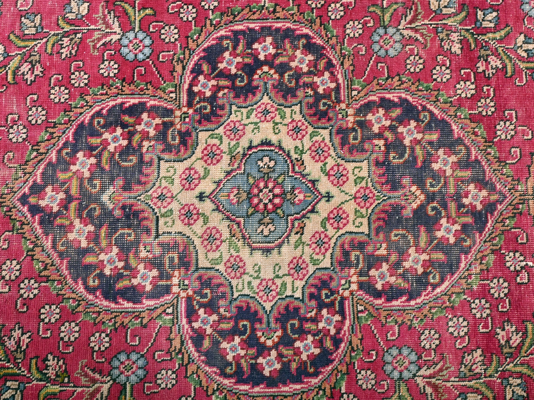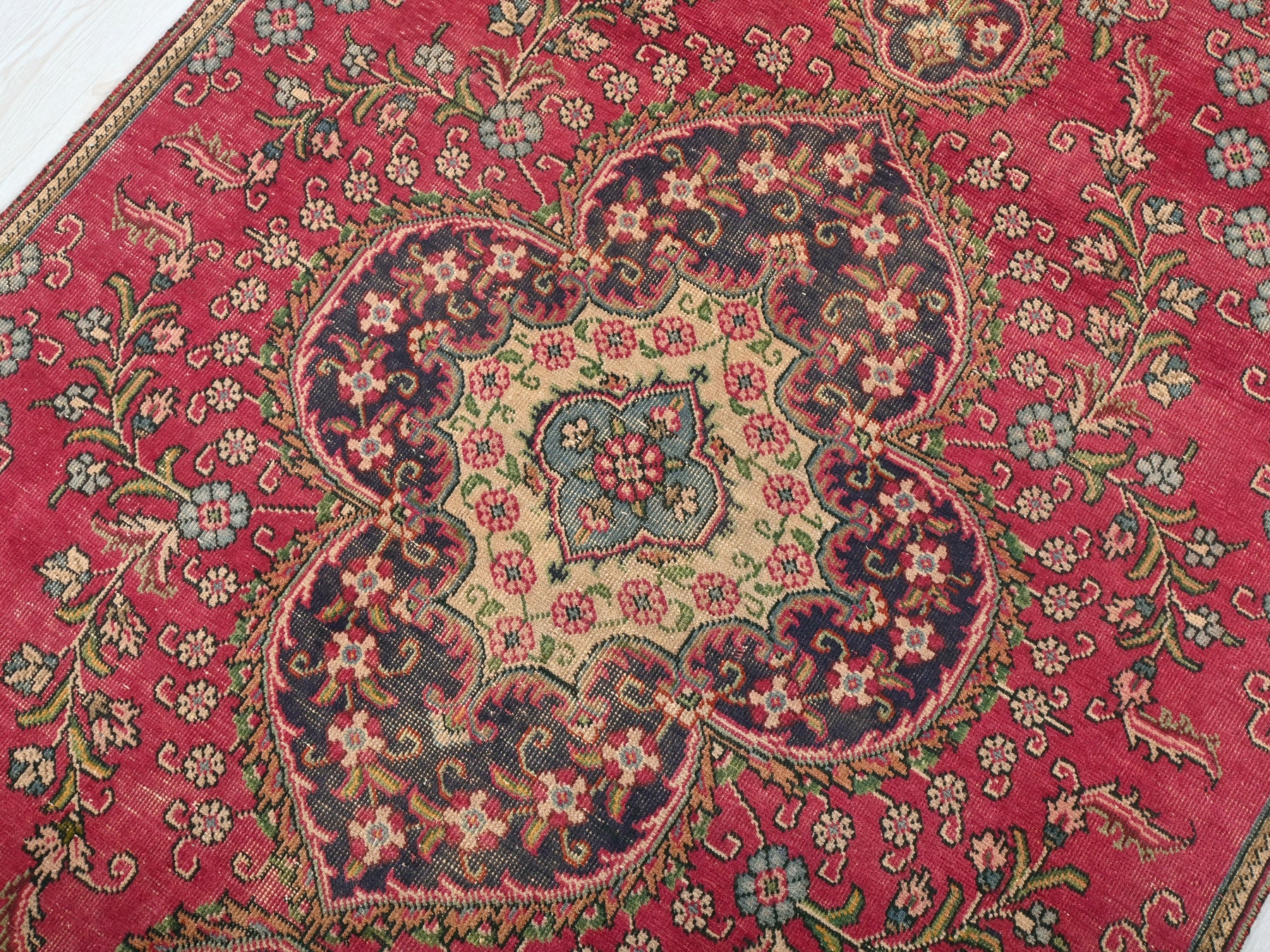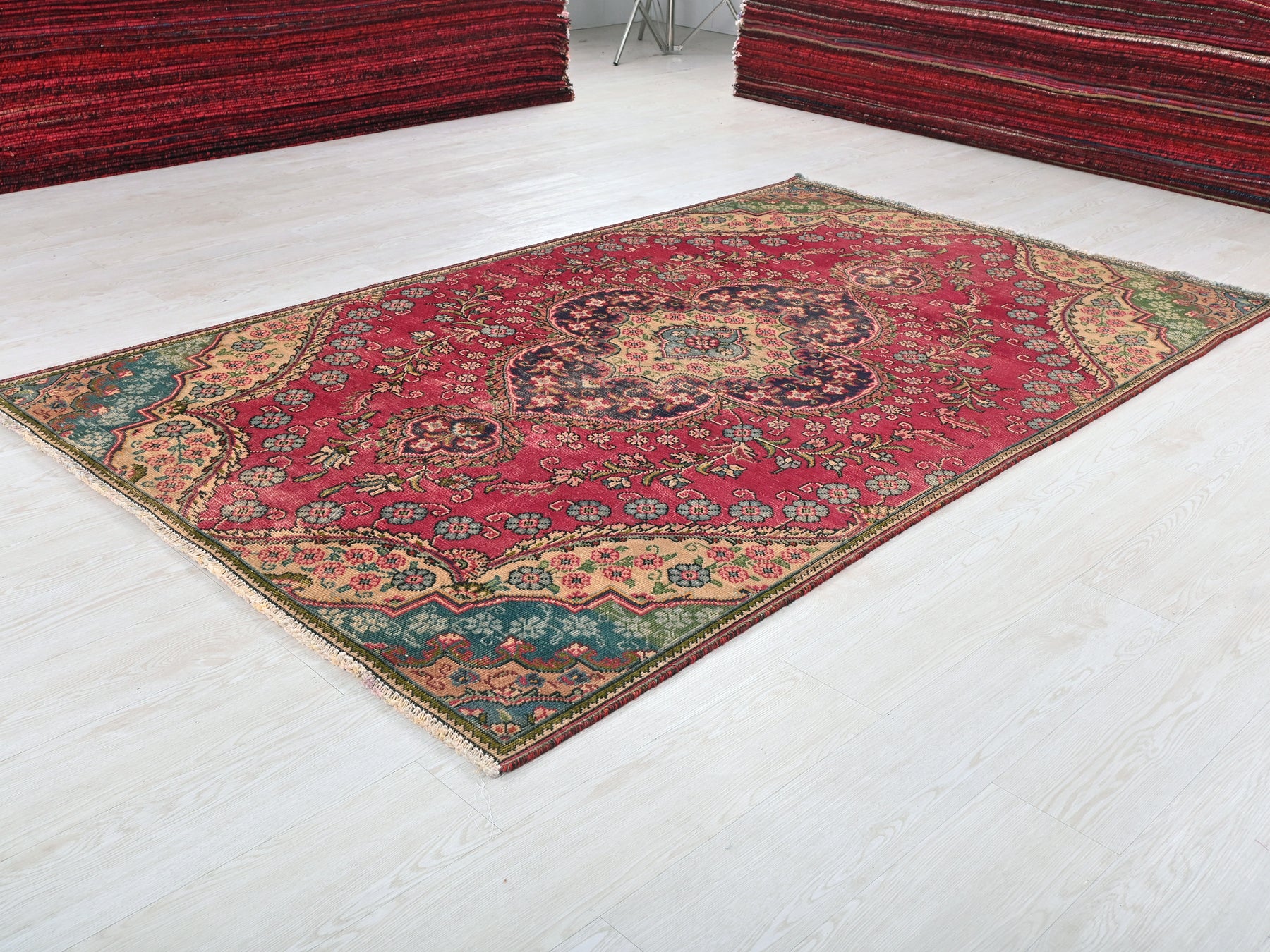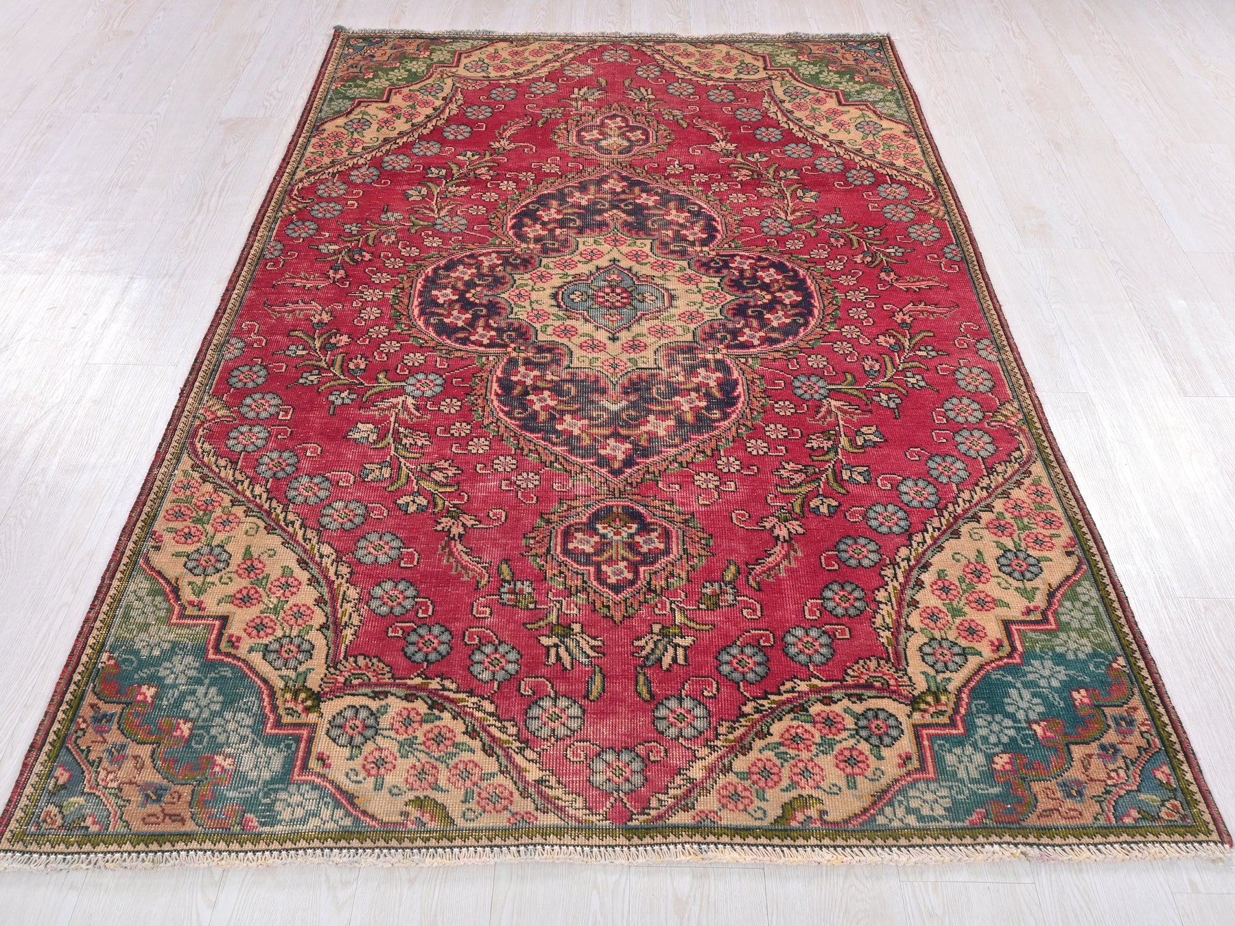 This is a hand-knotted, one-of-a-kind vintage rug. Due to the nature of this piece, there may be slight imperfections in its wear, shape, dimensions, and color. All of our rugs are professionally cleaned and repaired.