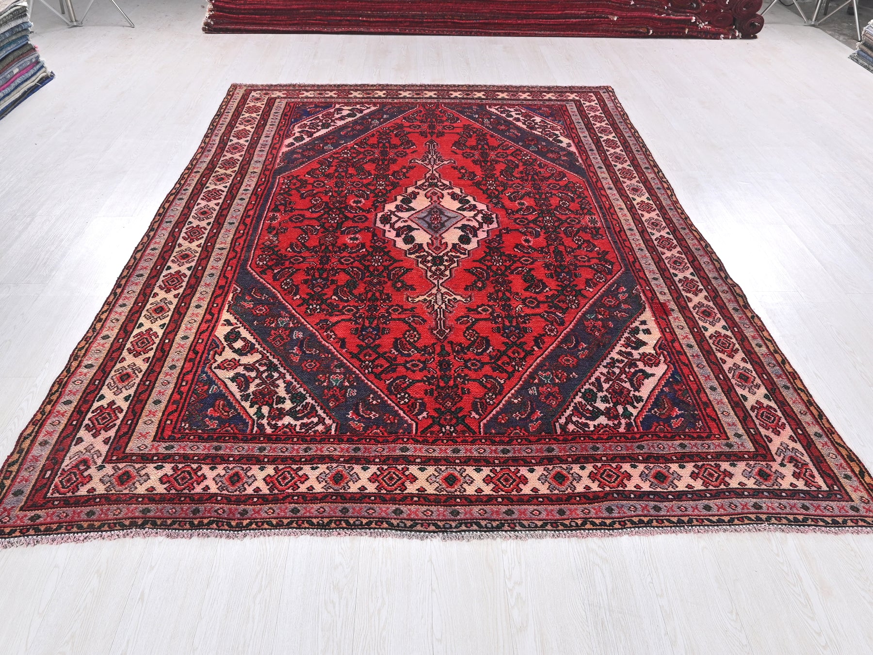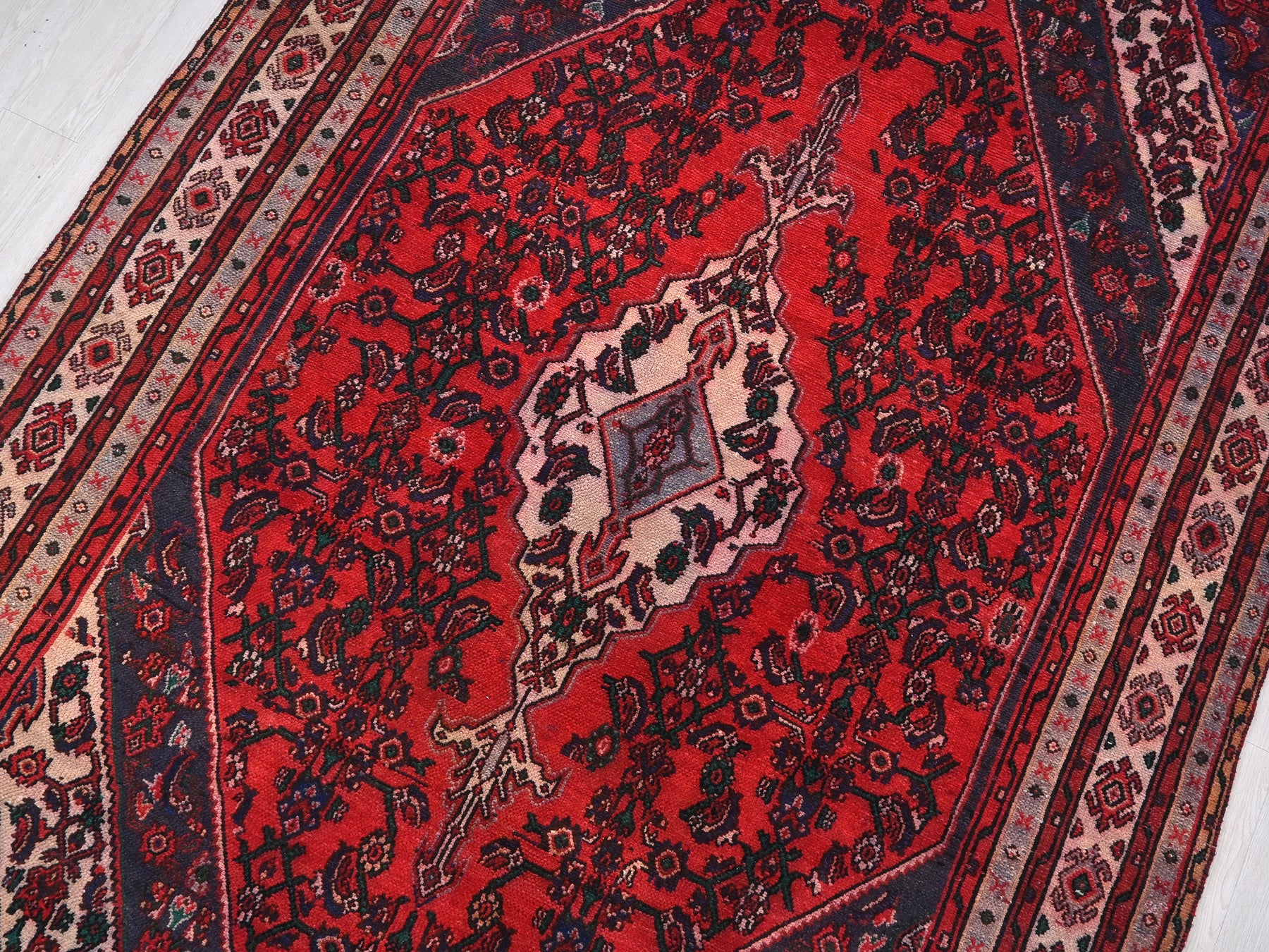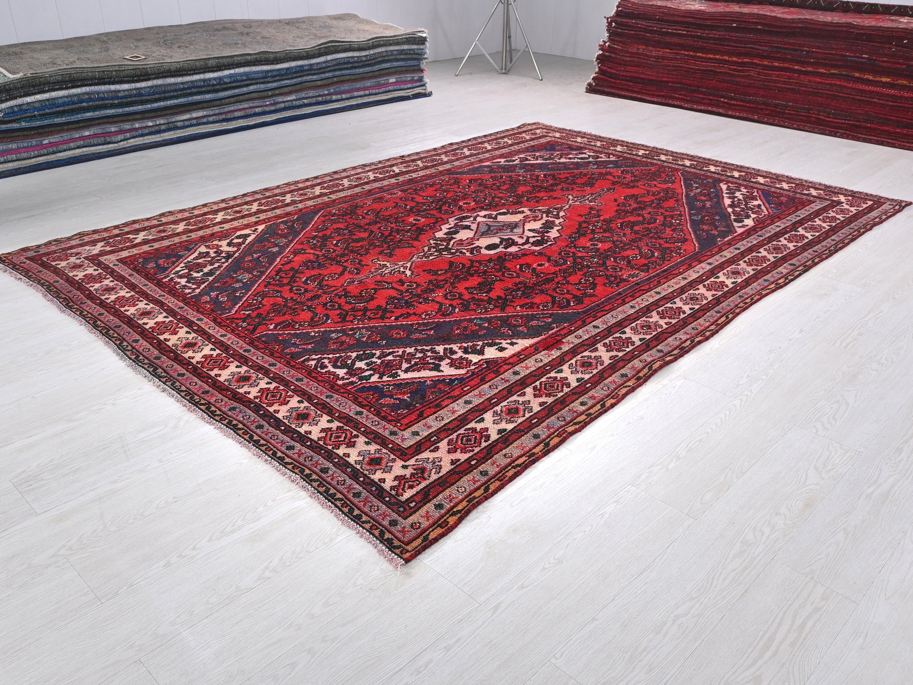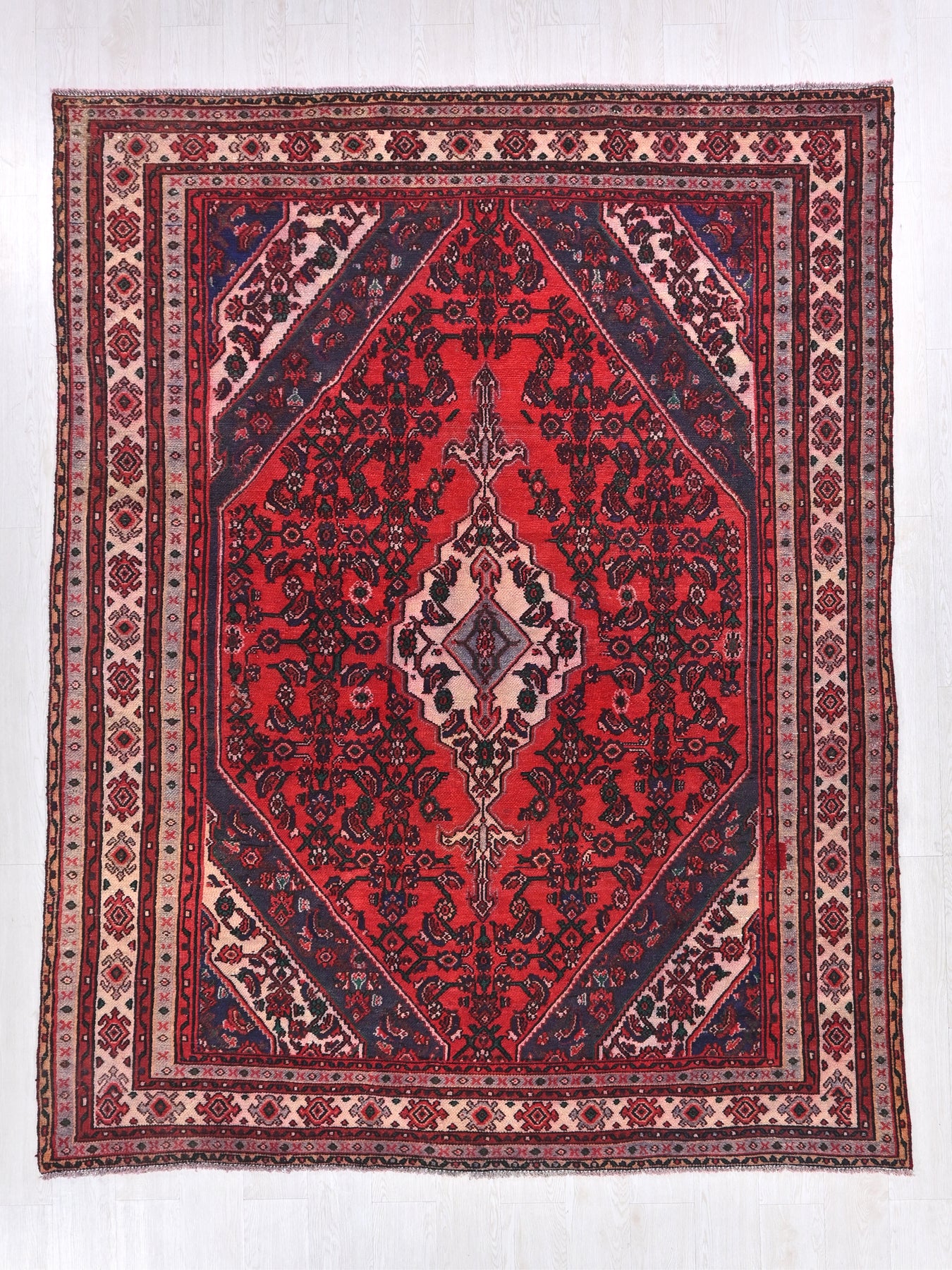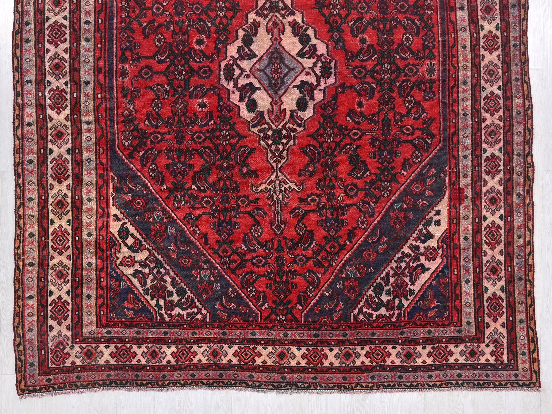 This is a hand-knotted, one-of-a-kind vintage rug. Due to the nature of this piece, there may be slight imperfections in its wear, shape, dimensions, and color. All of our rugs are professionally cleaned and repaired.