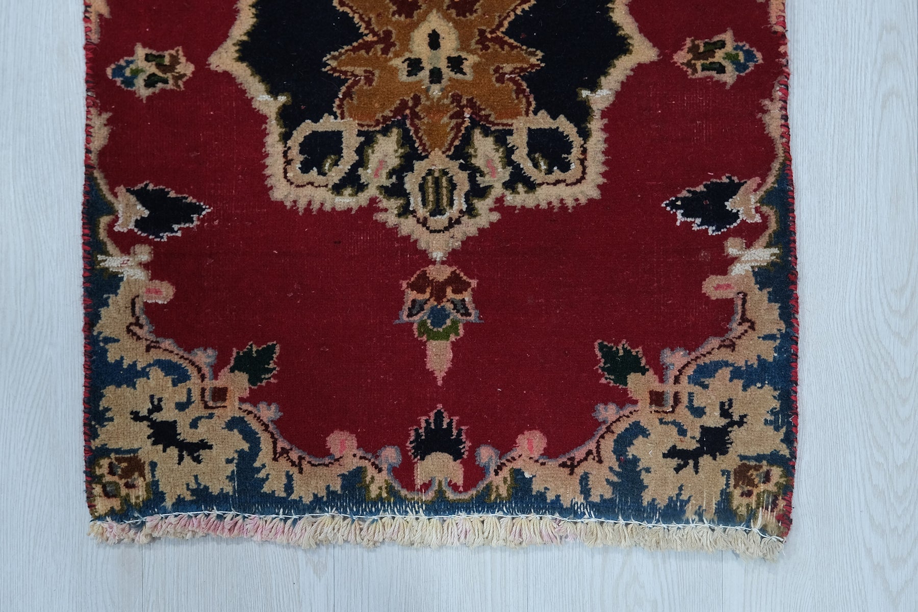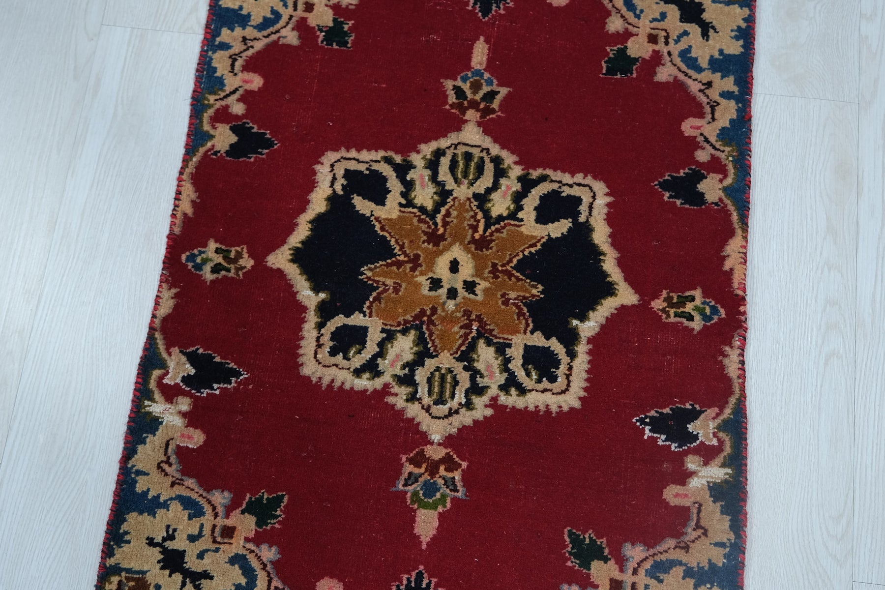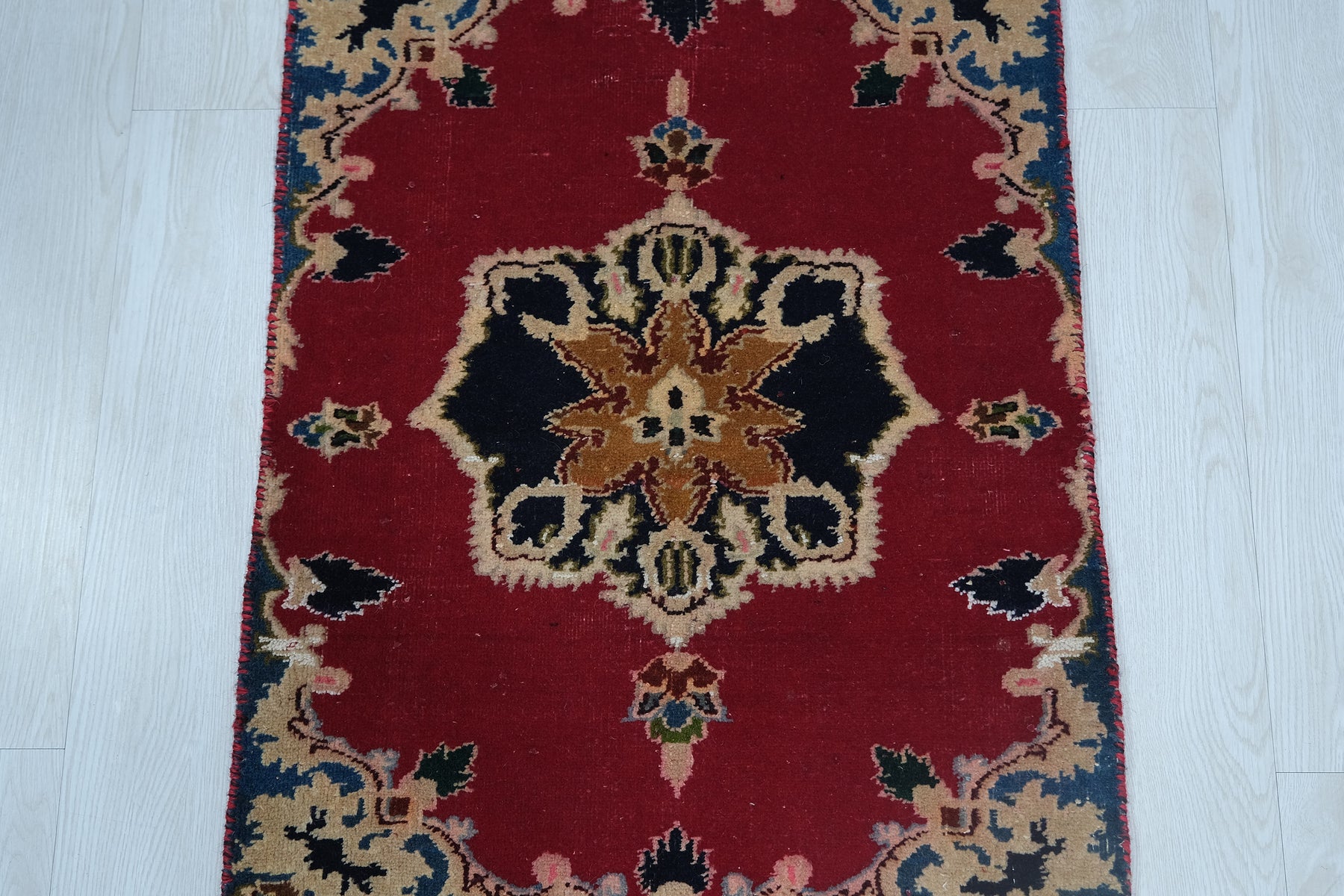This is a hand-knotted, one-of-a-kind vintage rug. Due to the nature of this piece, there may be slight imperfections in its wear, shape, dimensions, and color. All of our rugs are professionally cleaned and repaired.
