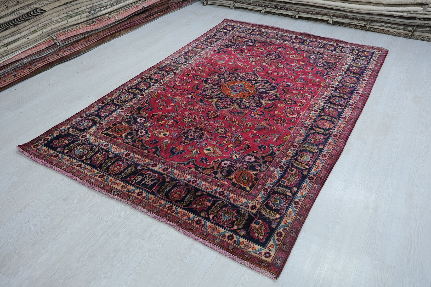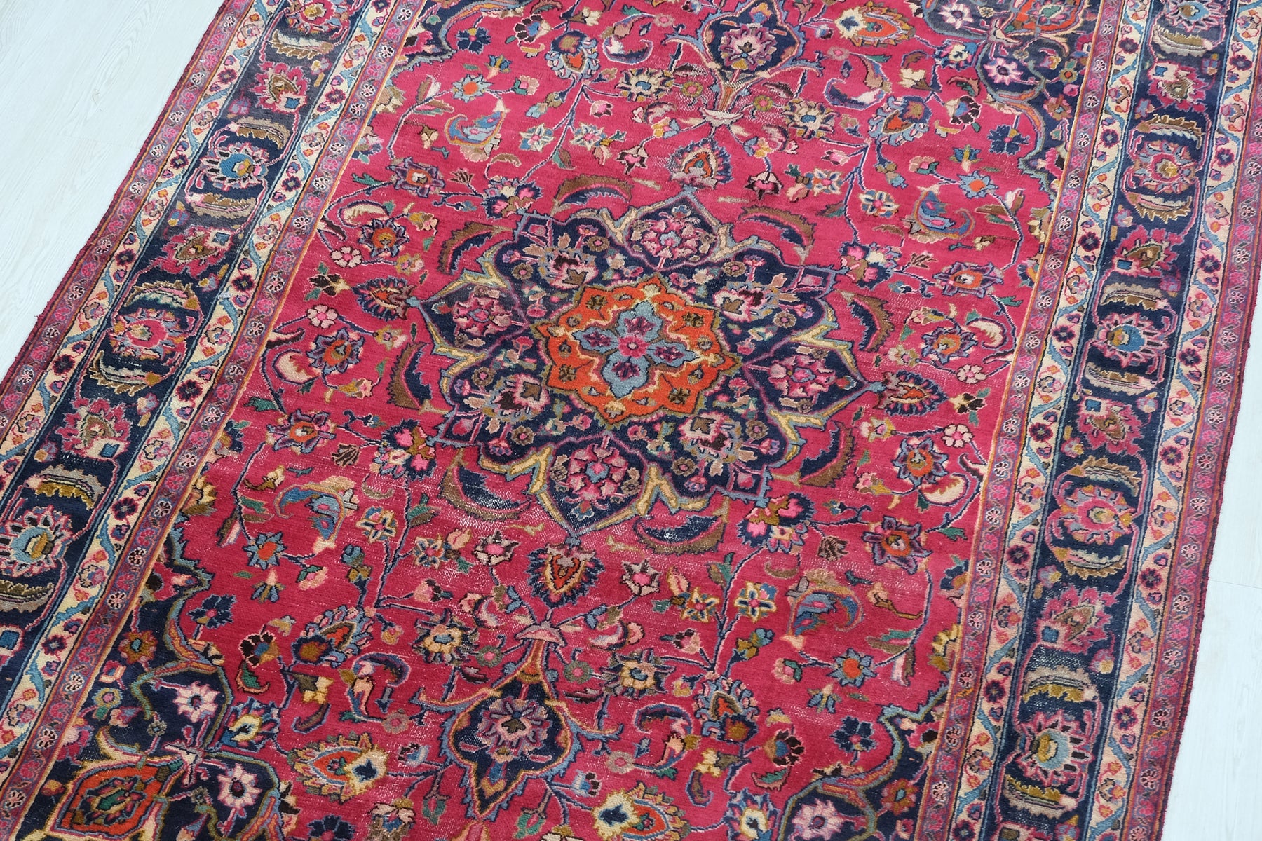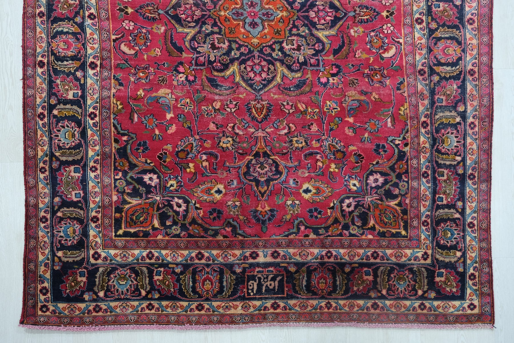This is a hand-knotted, one-of-a-kind vintage rug. Due to the nature of this piece, there may be slight imperfections in its wear, shape, dimensions, and color. All of our rugs are professionally cleaned and repaired.