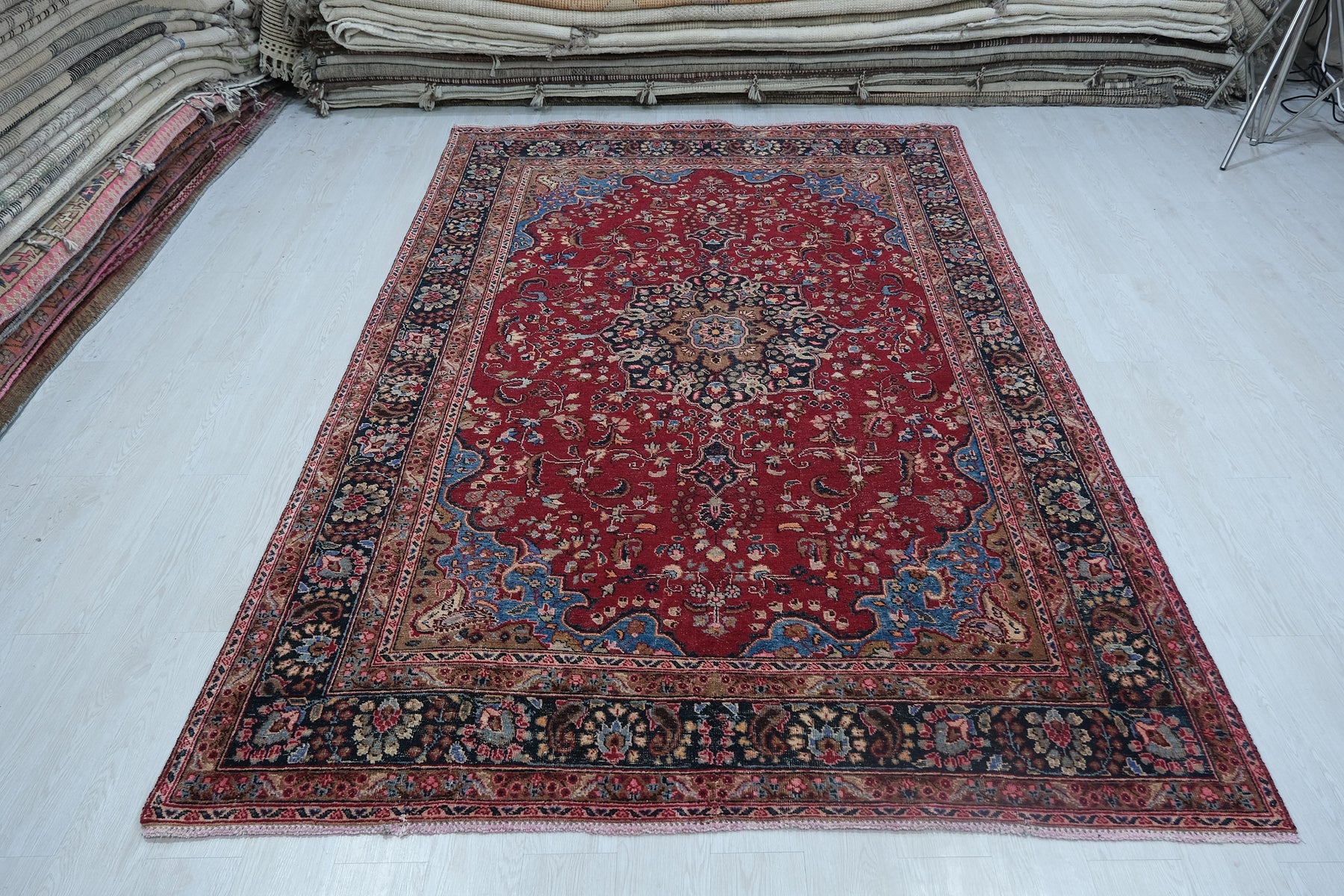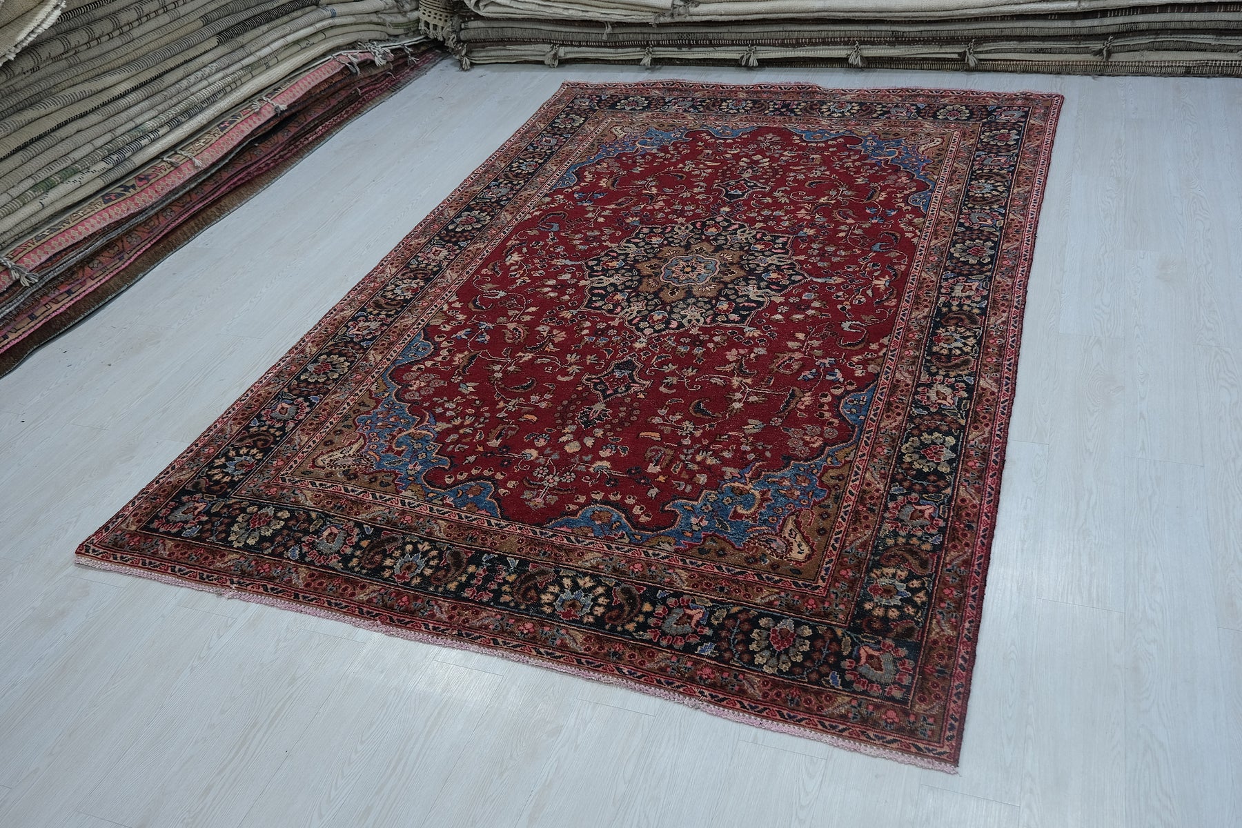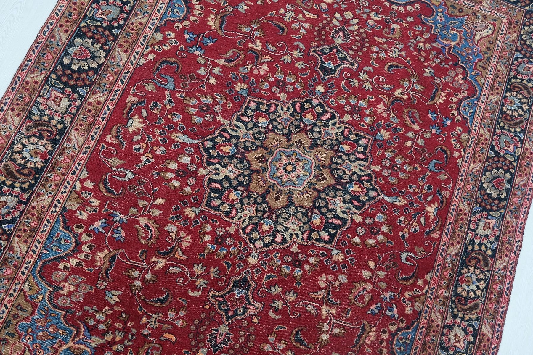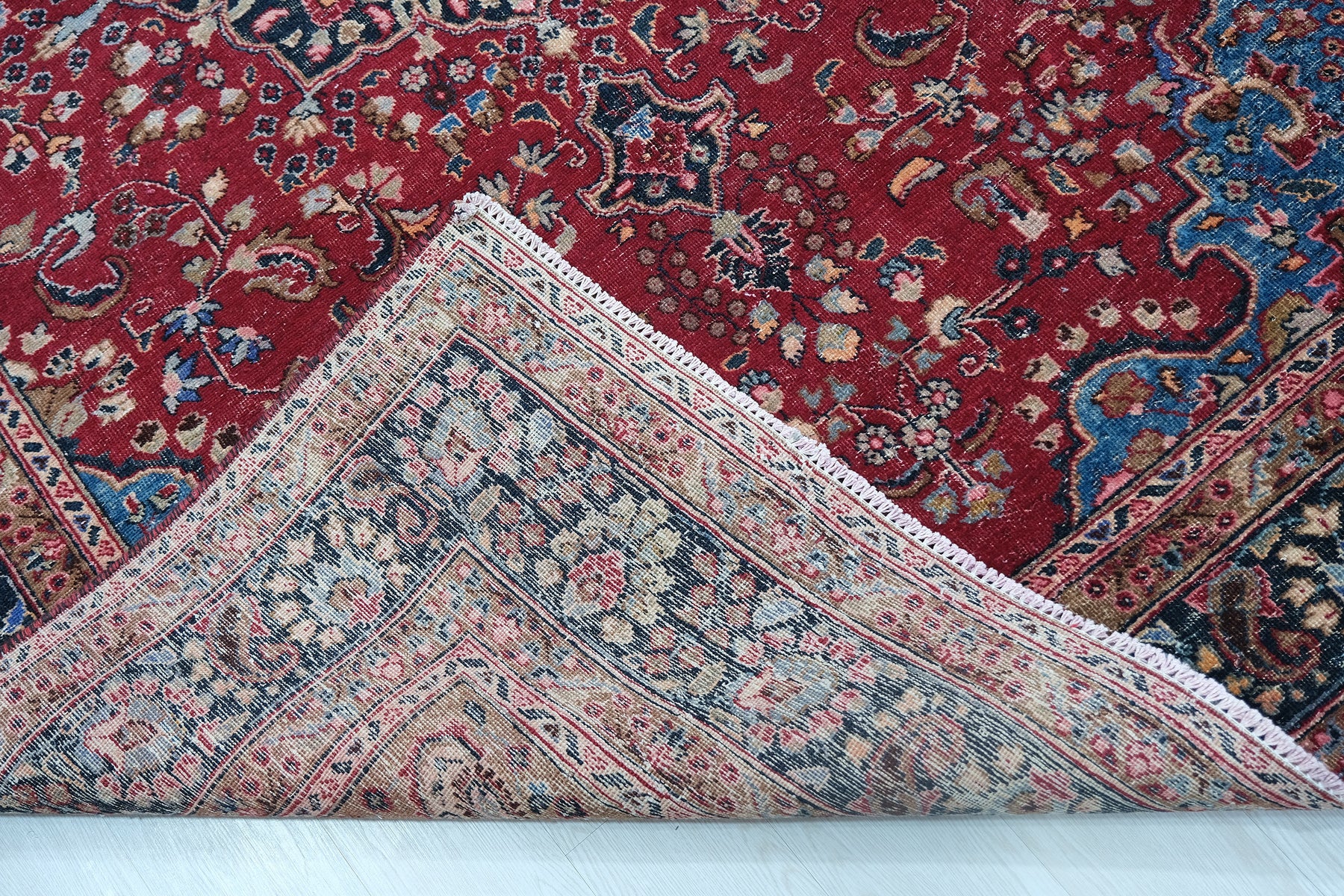 This is a hand-knotted, one-of-a-kind vintage rug. Due to the nature of this piece, there may be slight imperfections in its wear, shape, dimensions, and color. All of our rugs are professionally cleaned and repaired.