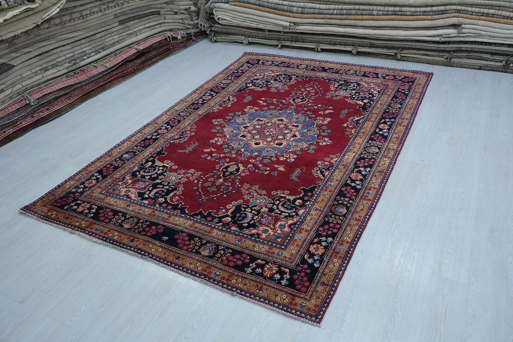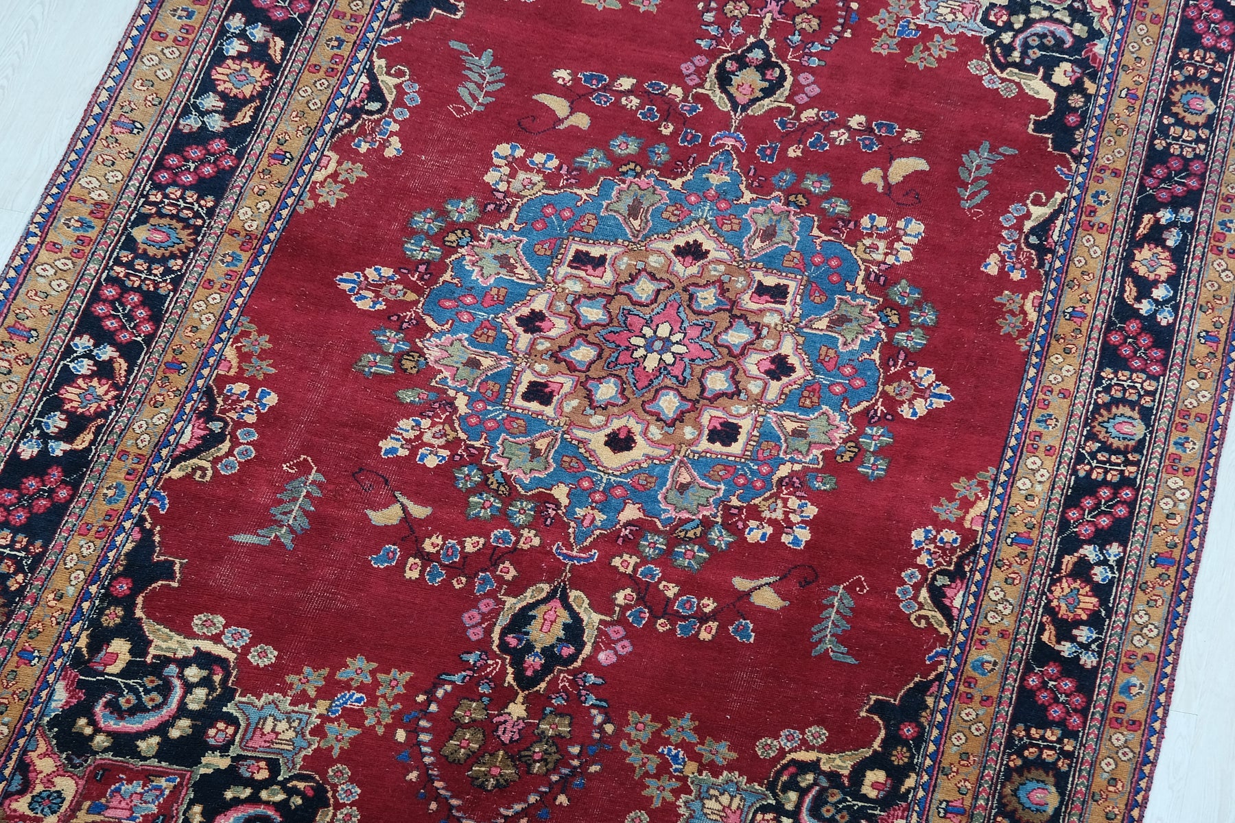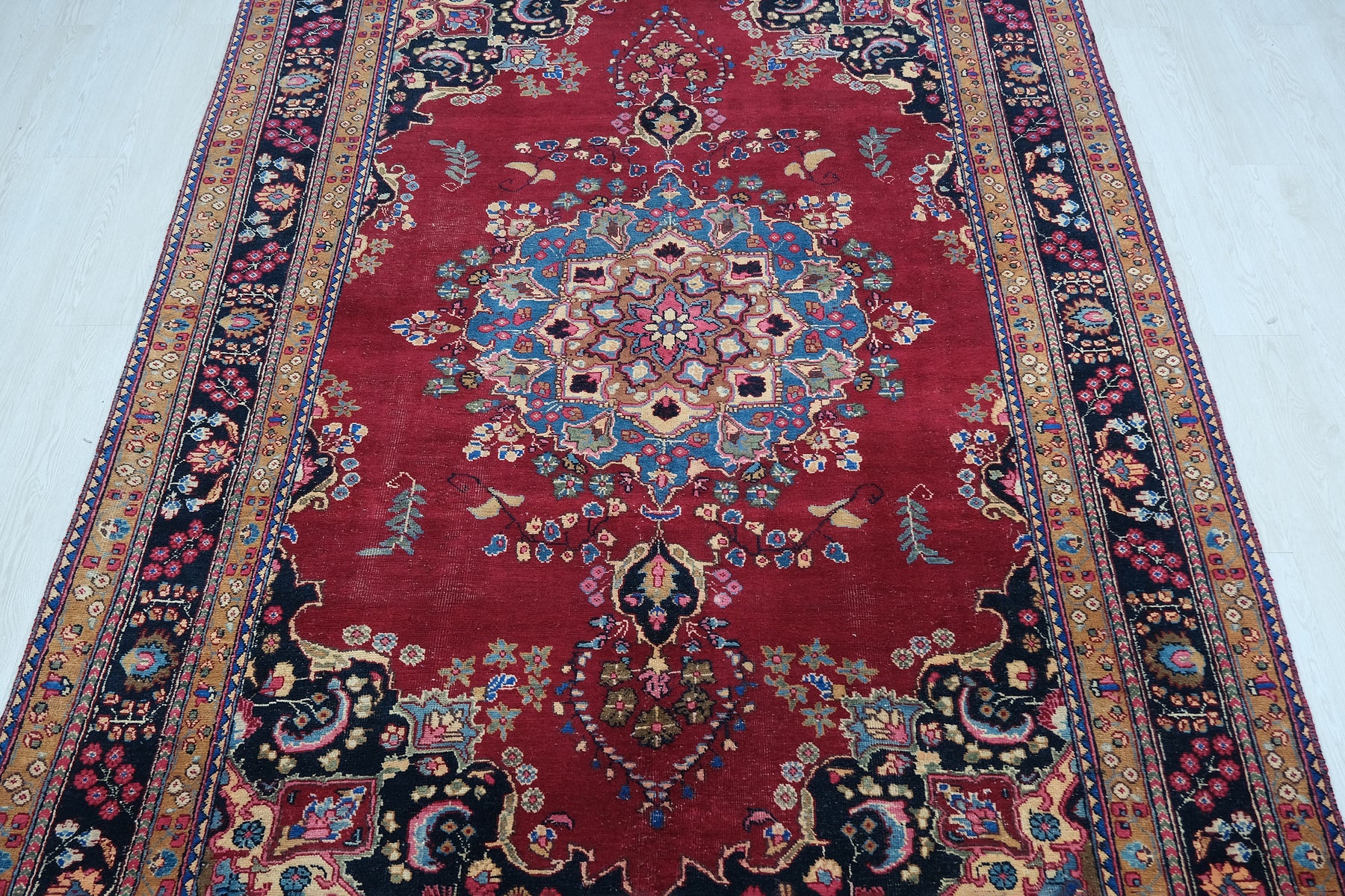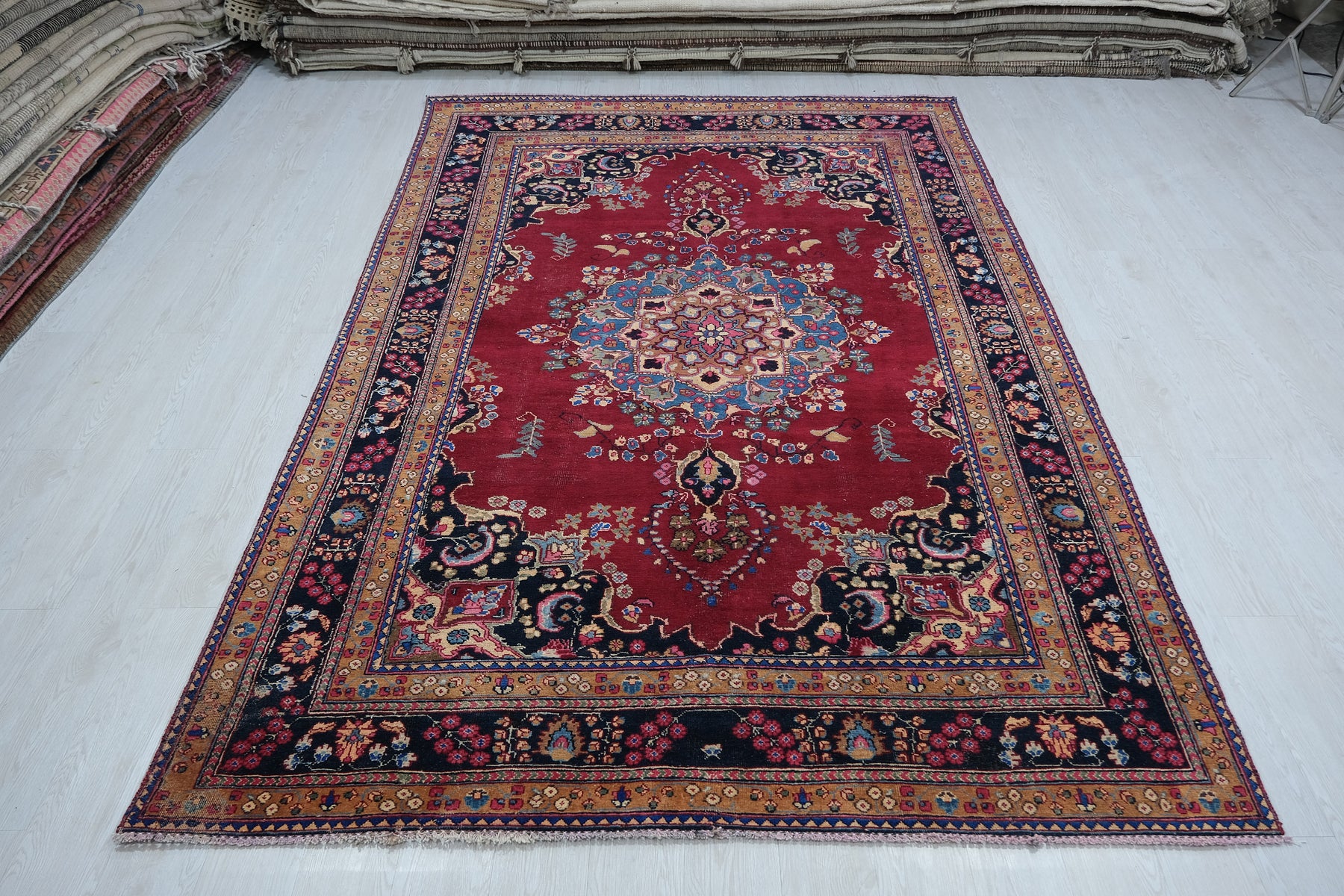 This is a hand-knotted, one-of-a-kind vintage rug. Due to the nature of this piece, there may be slight imperfections in its wear, shape, dimensions, and color. All of our rugs are professionally cleaned and repaired.