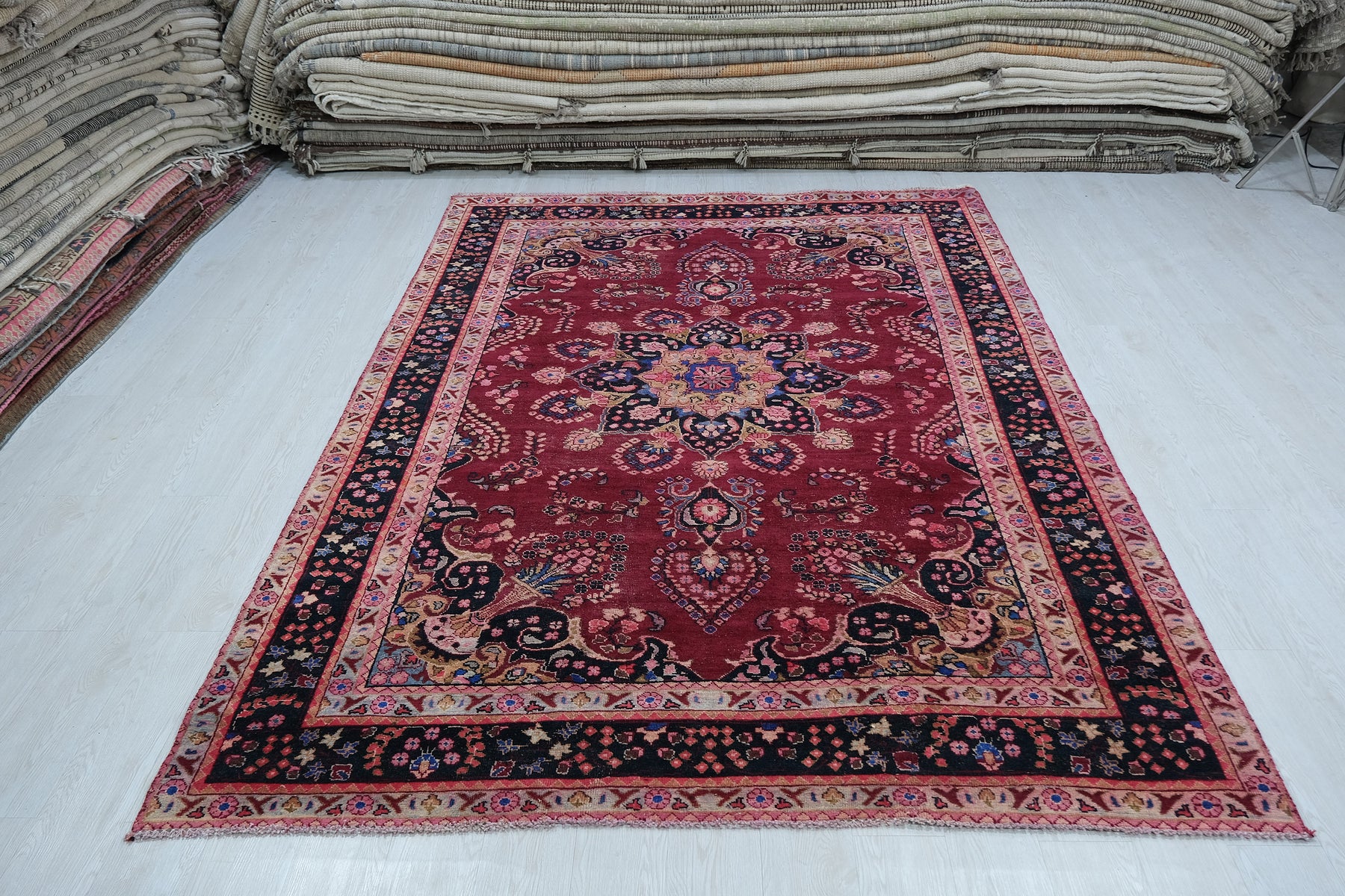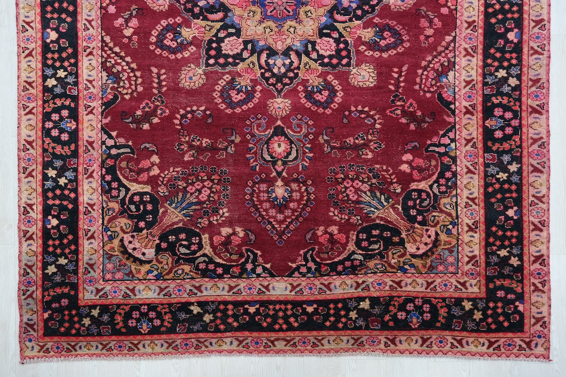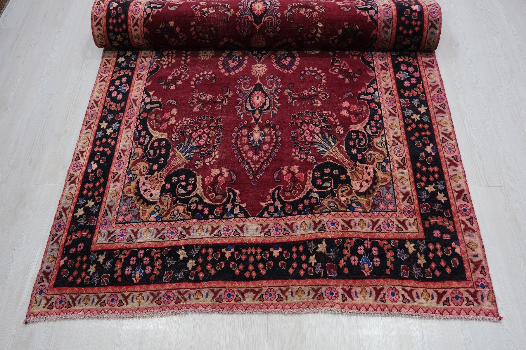 This is a hand-knotted, one-of-a-kind vintage rug. Due to the nature of this piece, there may be slight imperfections in its wear, shape, dimensions, and color. All of our rugs are professionally cleaned and repaired.