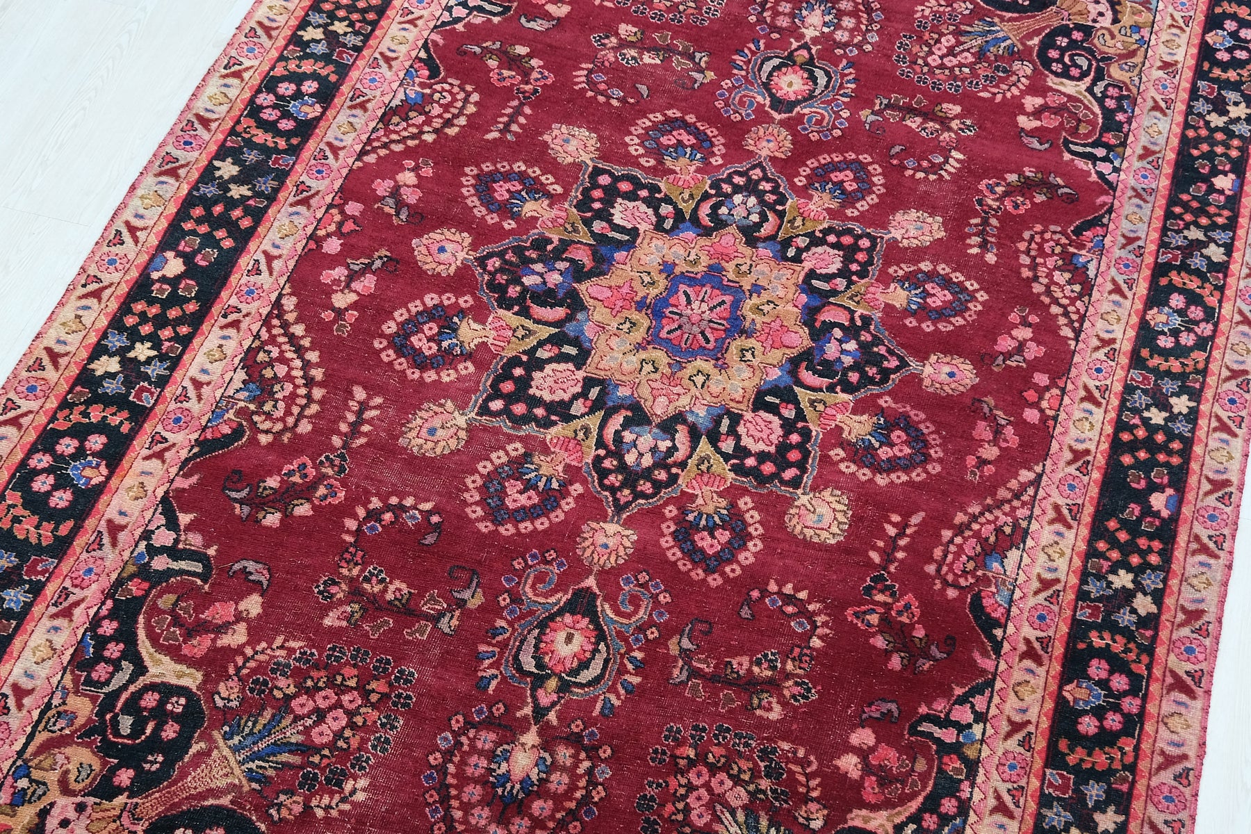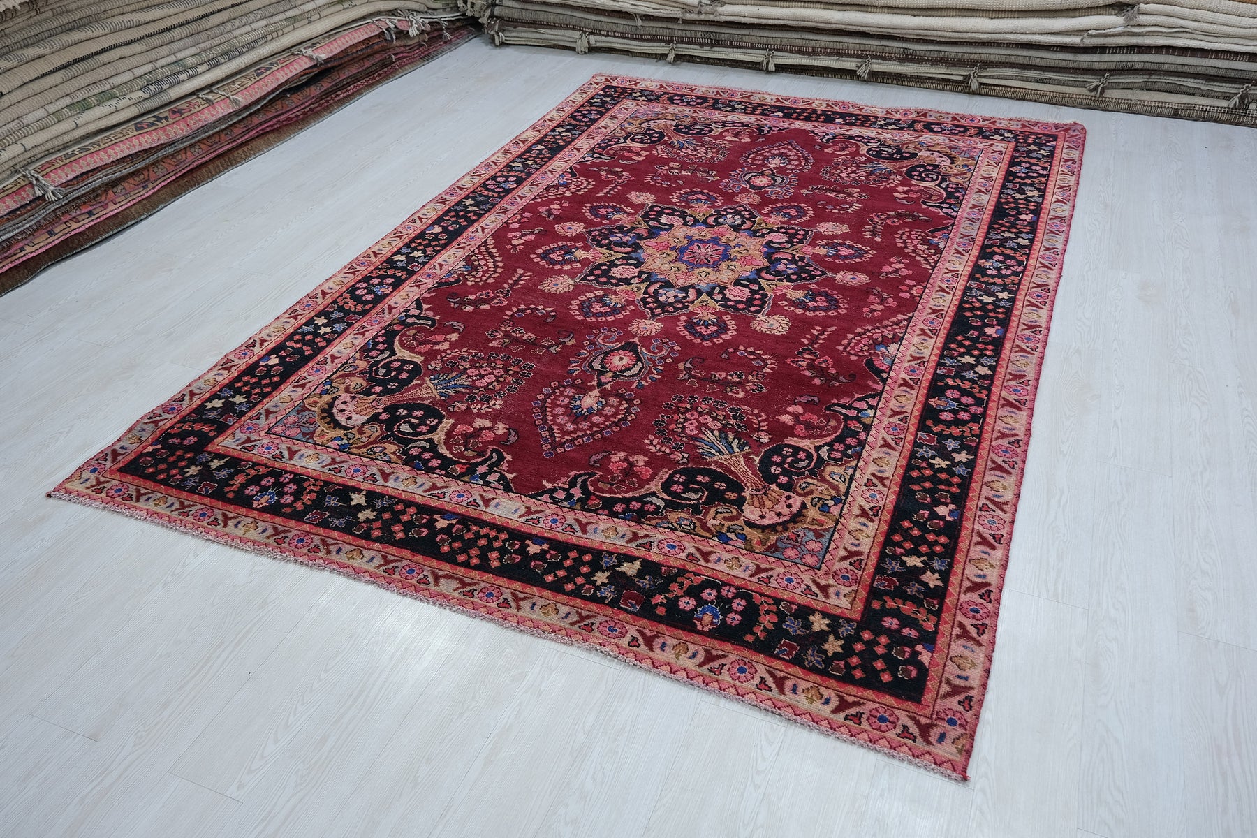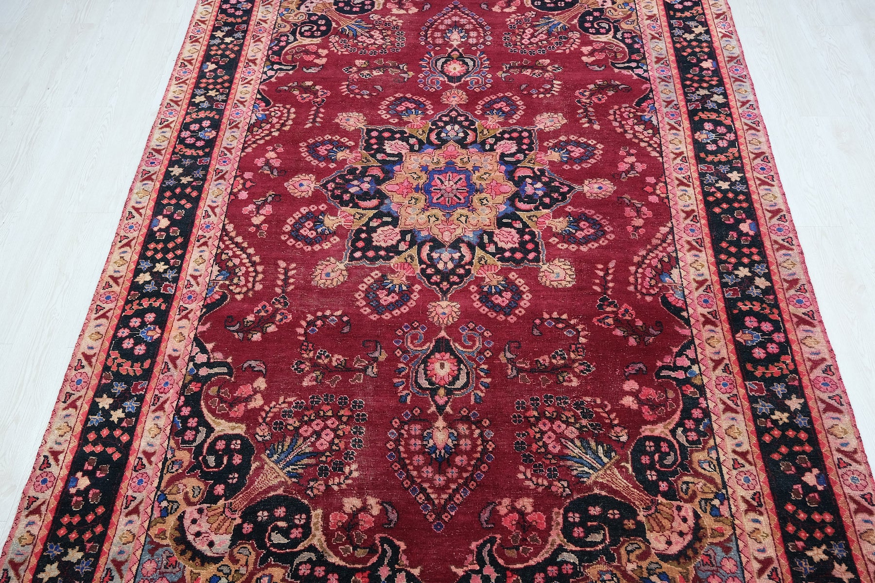 This is a hand-knotted, one-of-a-kind vintage rug. Due to the nature of this piece, there may be slight imperfections in its wear, shape, dimensions, and color. All of our rugs are professionally cleaned and repaired.