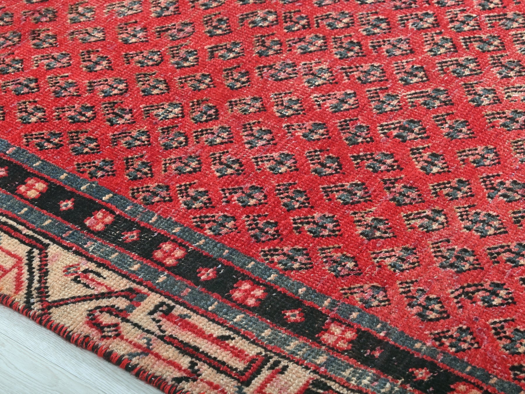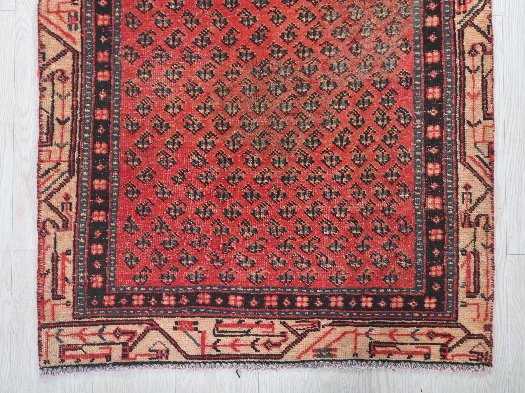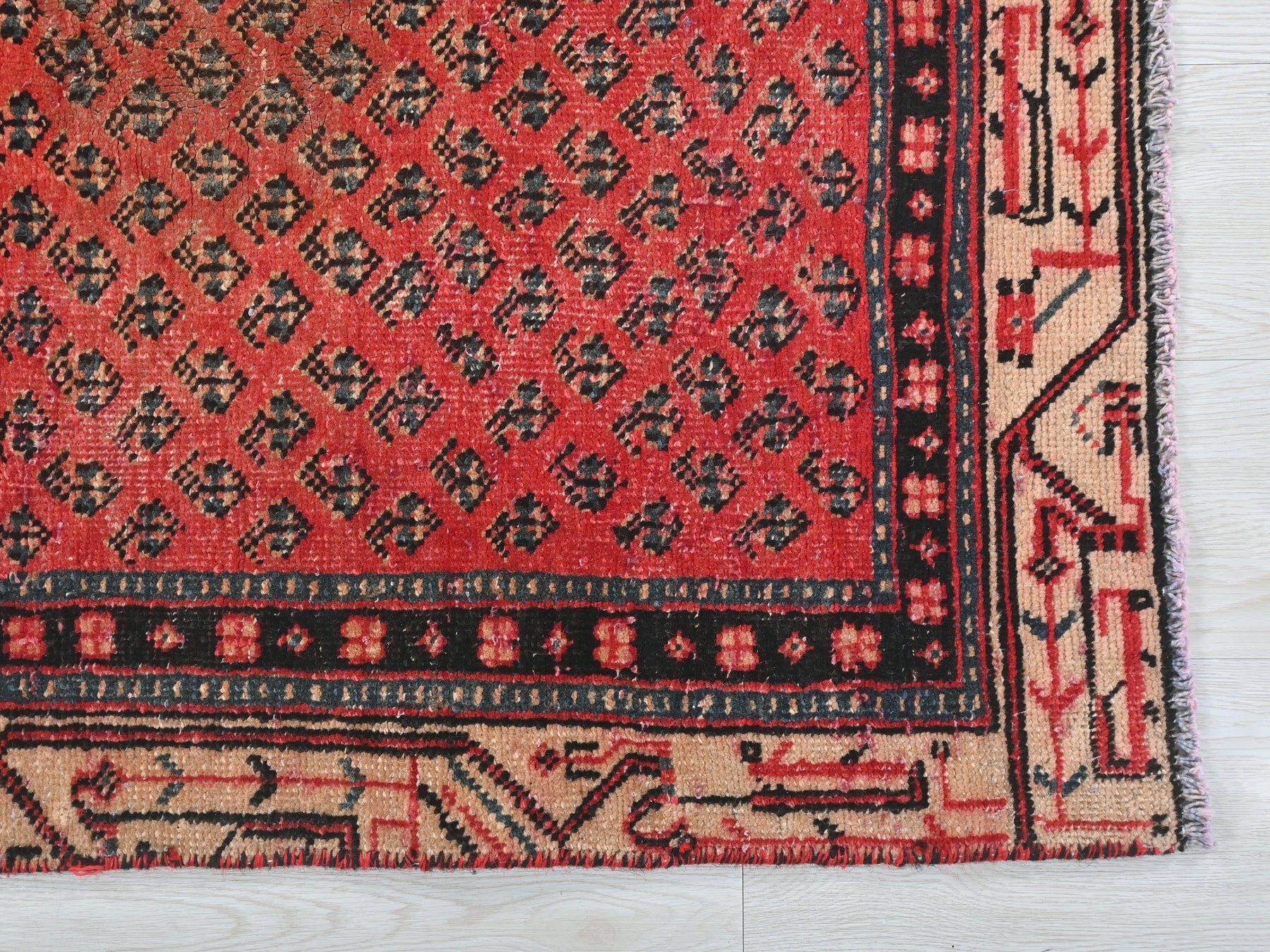 This is a hand-knotted, one-of-a-kind vintage rug. Due to the nature of this piece, there may be slight imperfections in its wear, shape, dimensions, and color. All of our rugs are professionally cleaned and repaired.