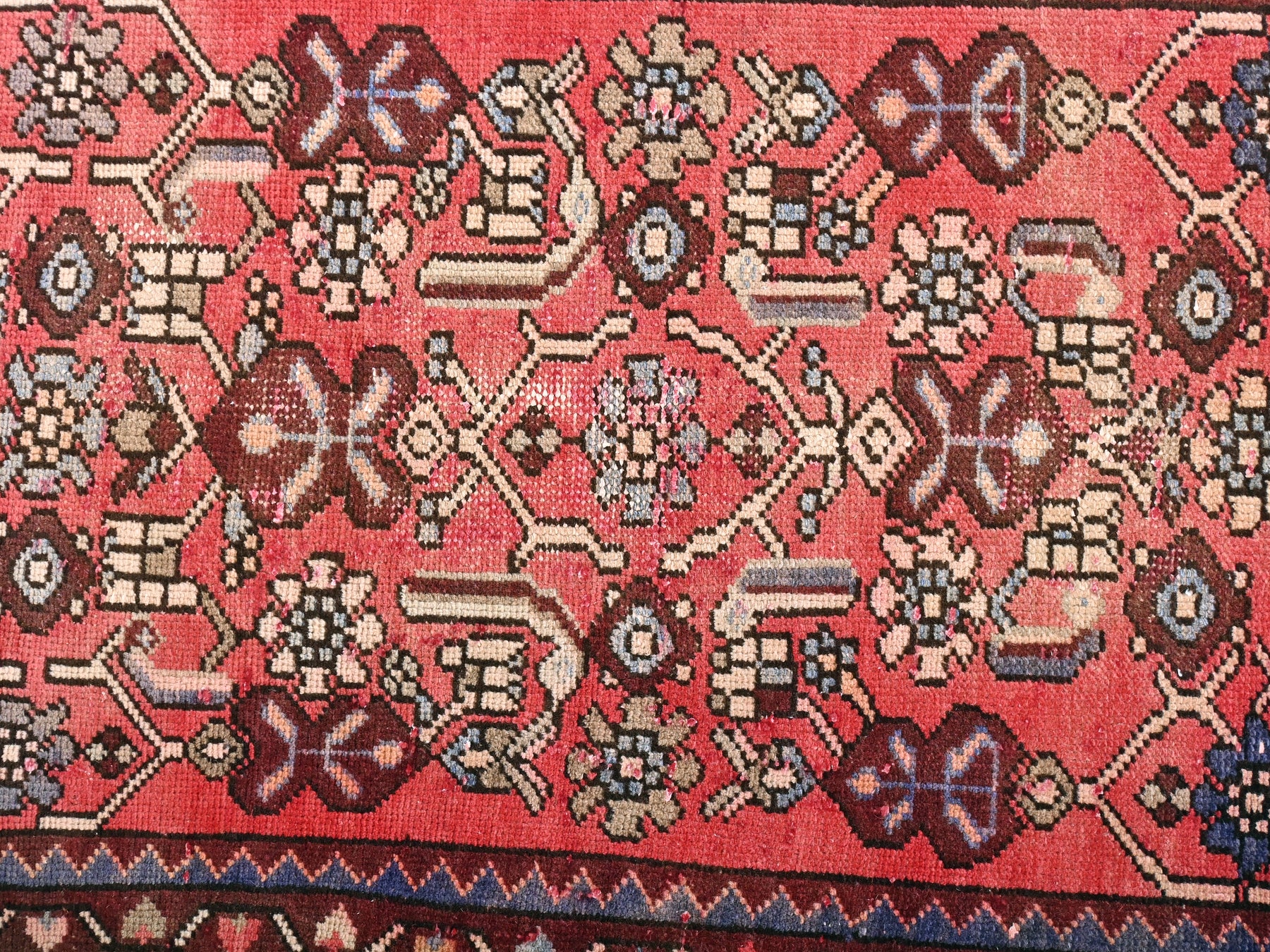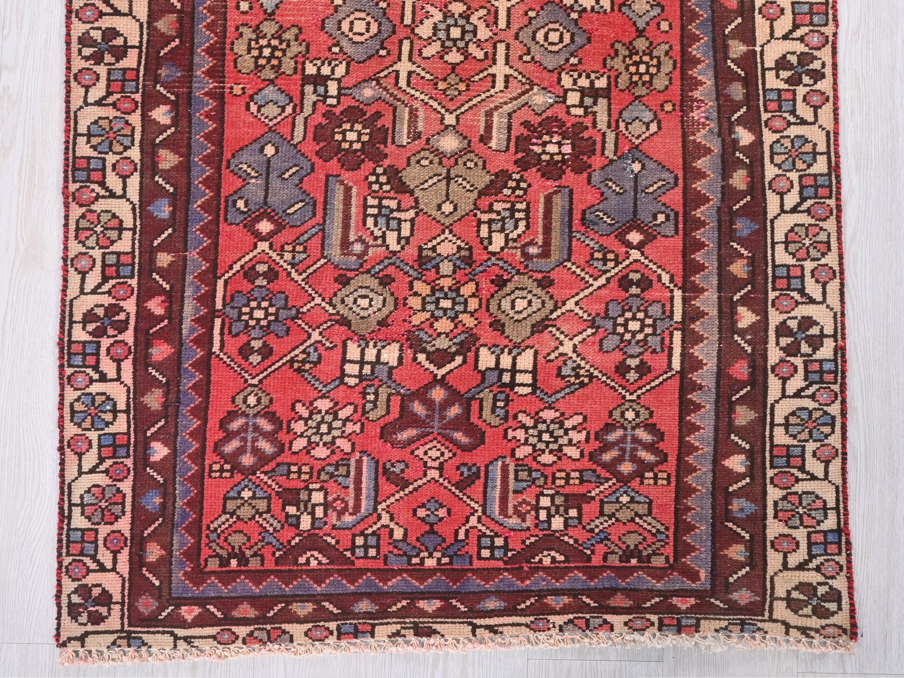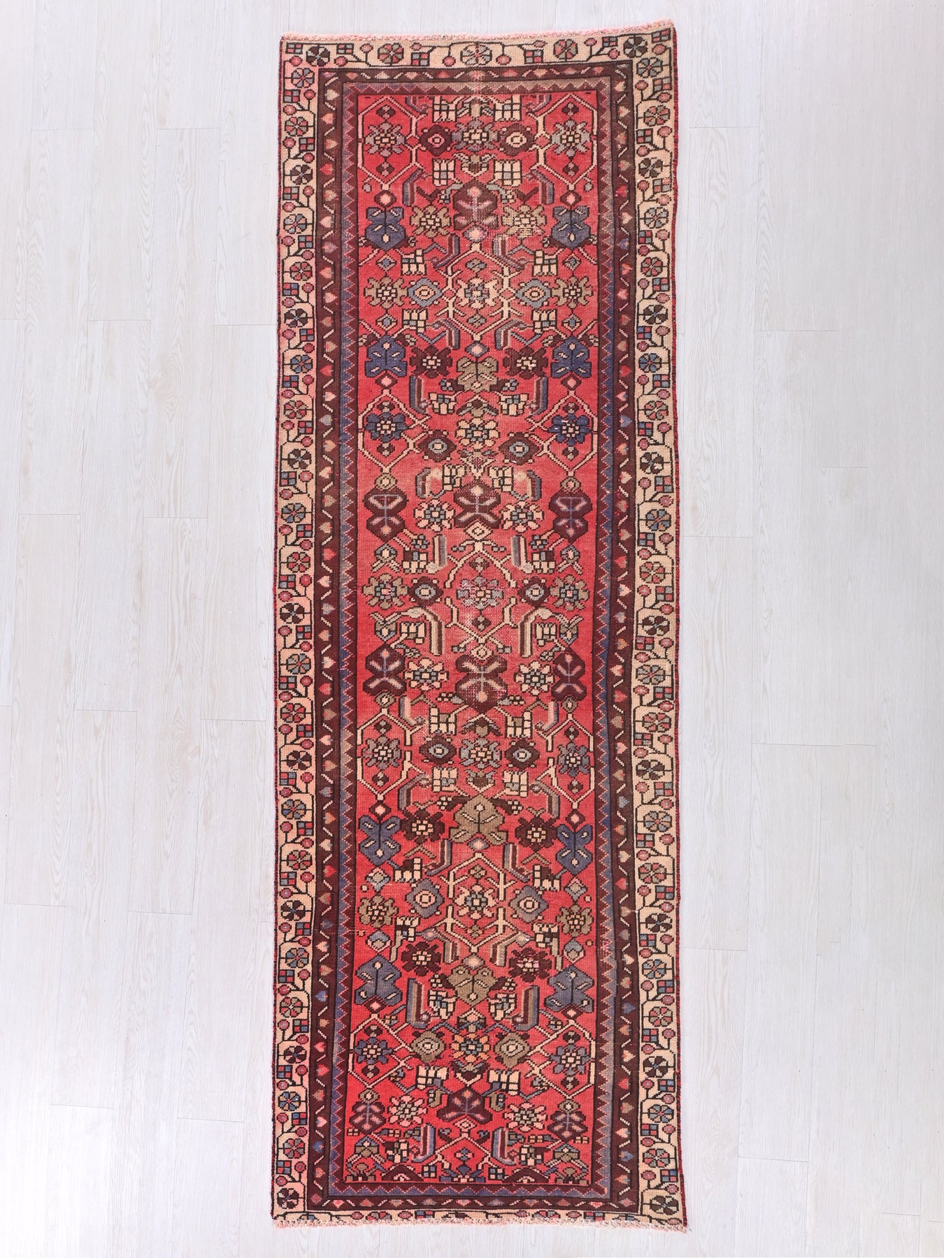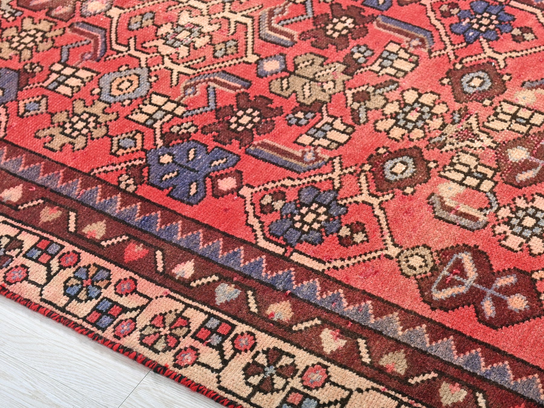 This is a hand-knotted, one-of-a-kind vintage rug. Due to the nature of this piece, there may be slight imperfections in its wear, shape, dimensions, and color. All of our rugs are professionally cleaned and repaired.