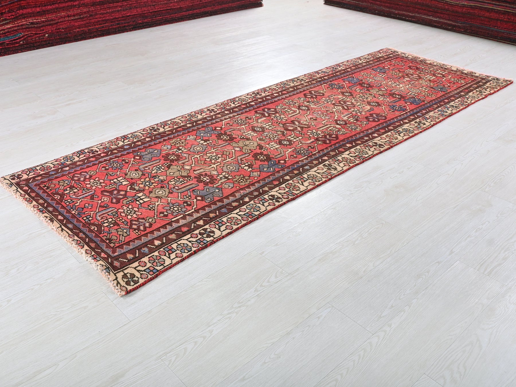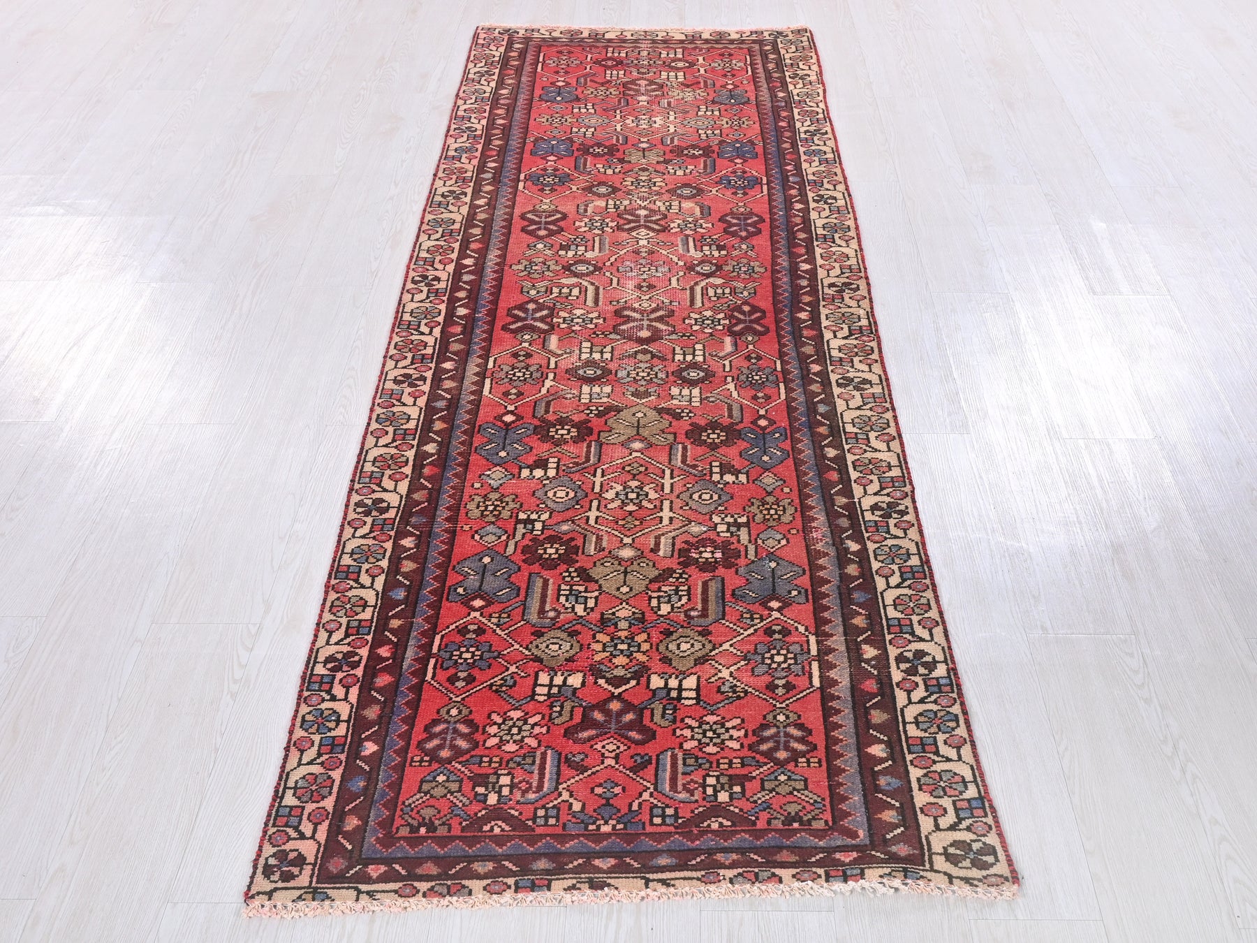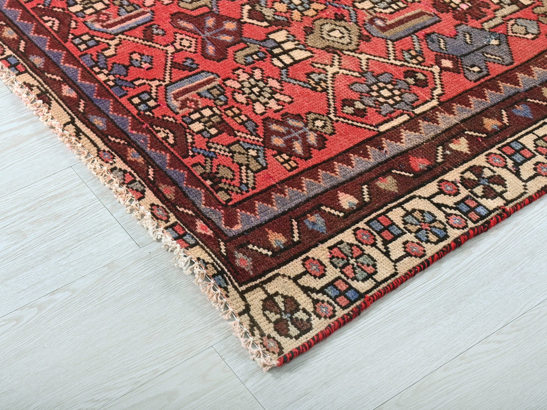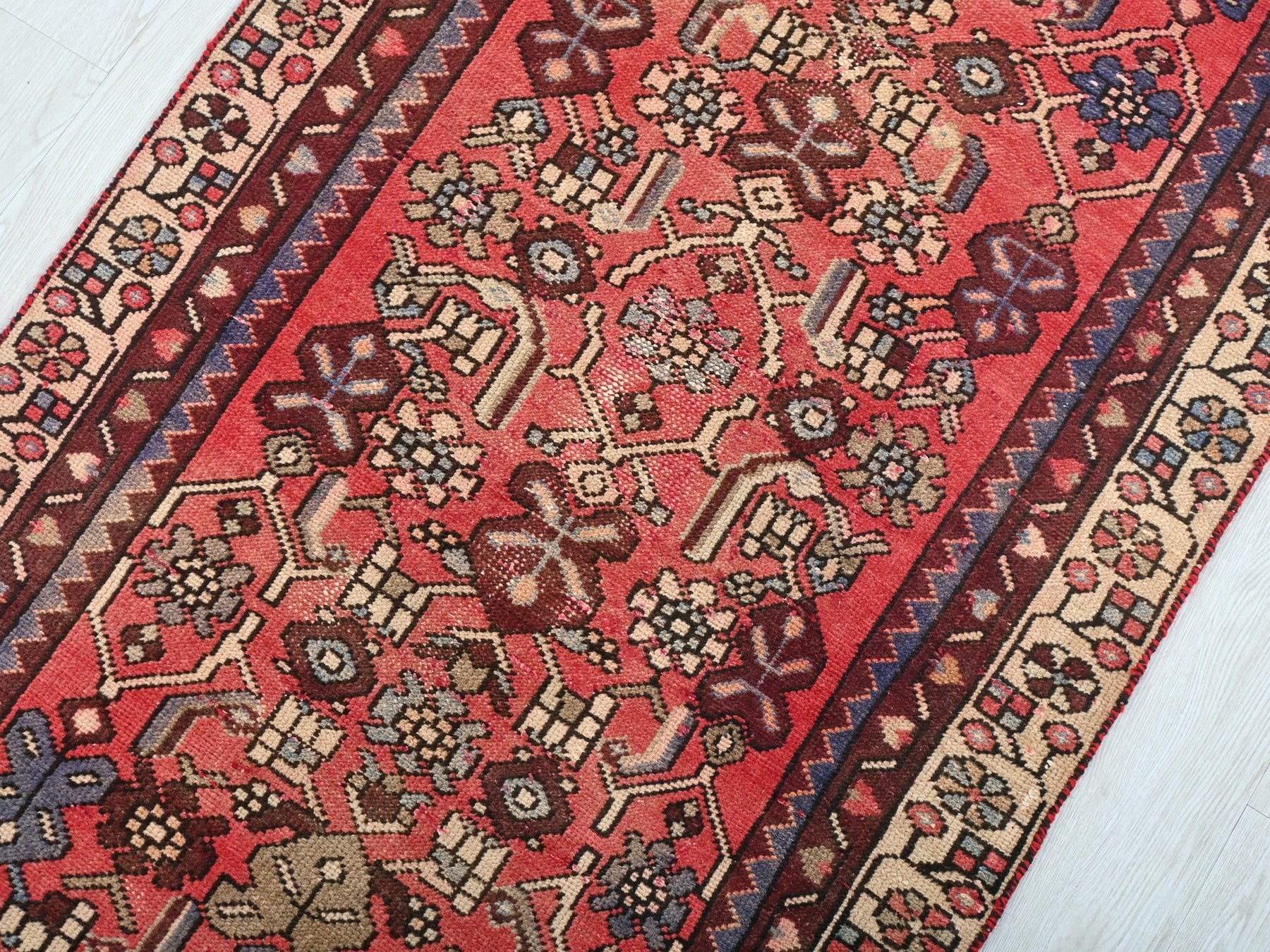 This is a hand-knotted, one-of-a-kind vintage rug. Due to the nature of this piece, there may be slight imperfections in its wear, shape, dimensions, and color. All of our rugs are professionally cleaned and repaired.