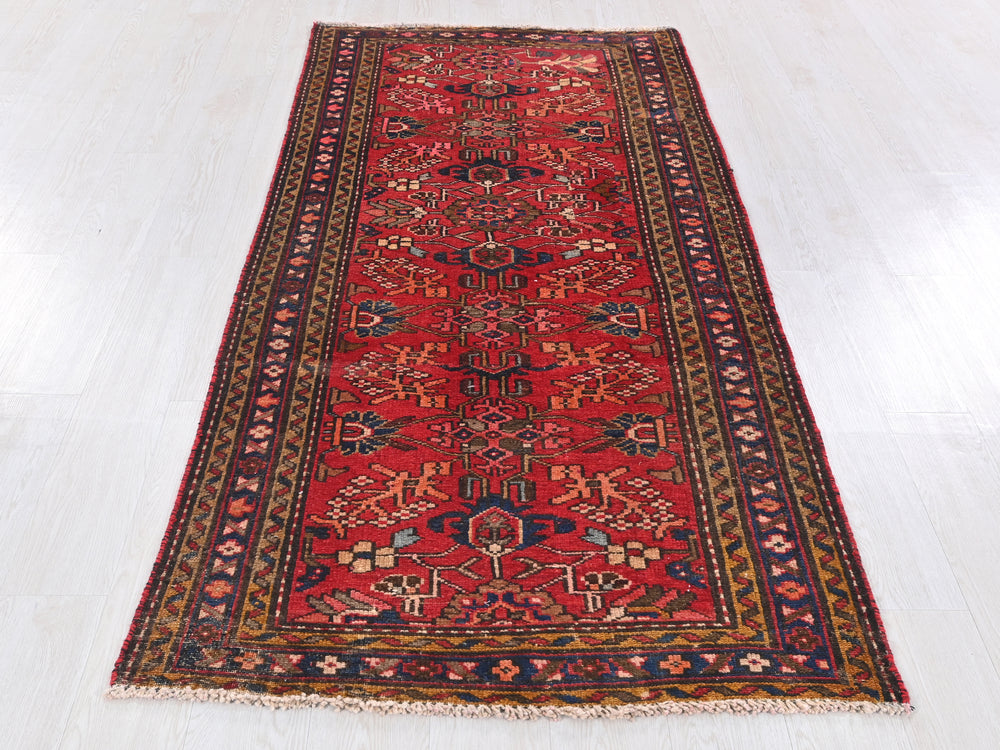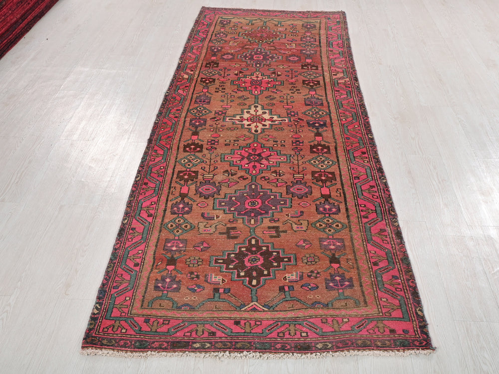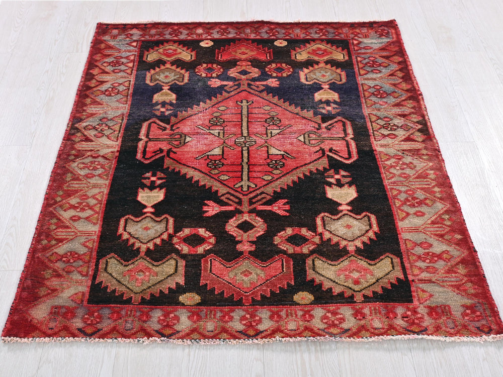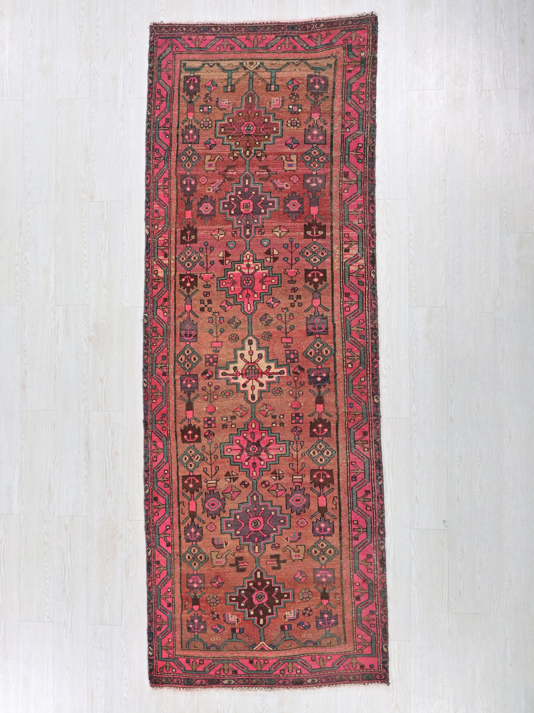 Vintage, hand‑knotted, repaired/restored wear