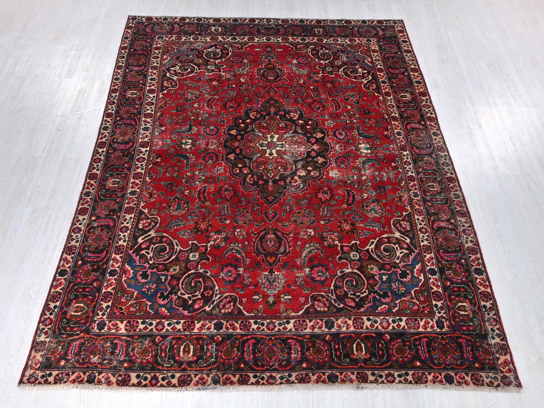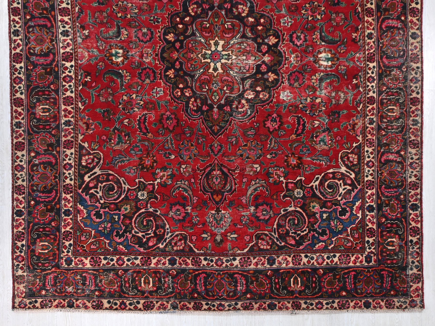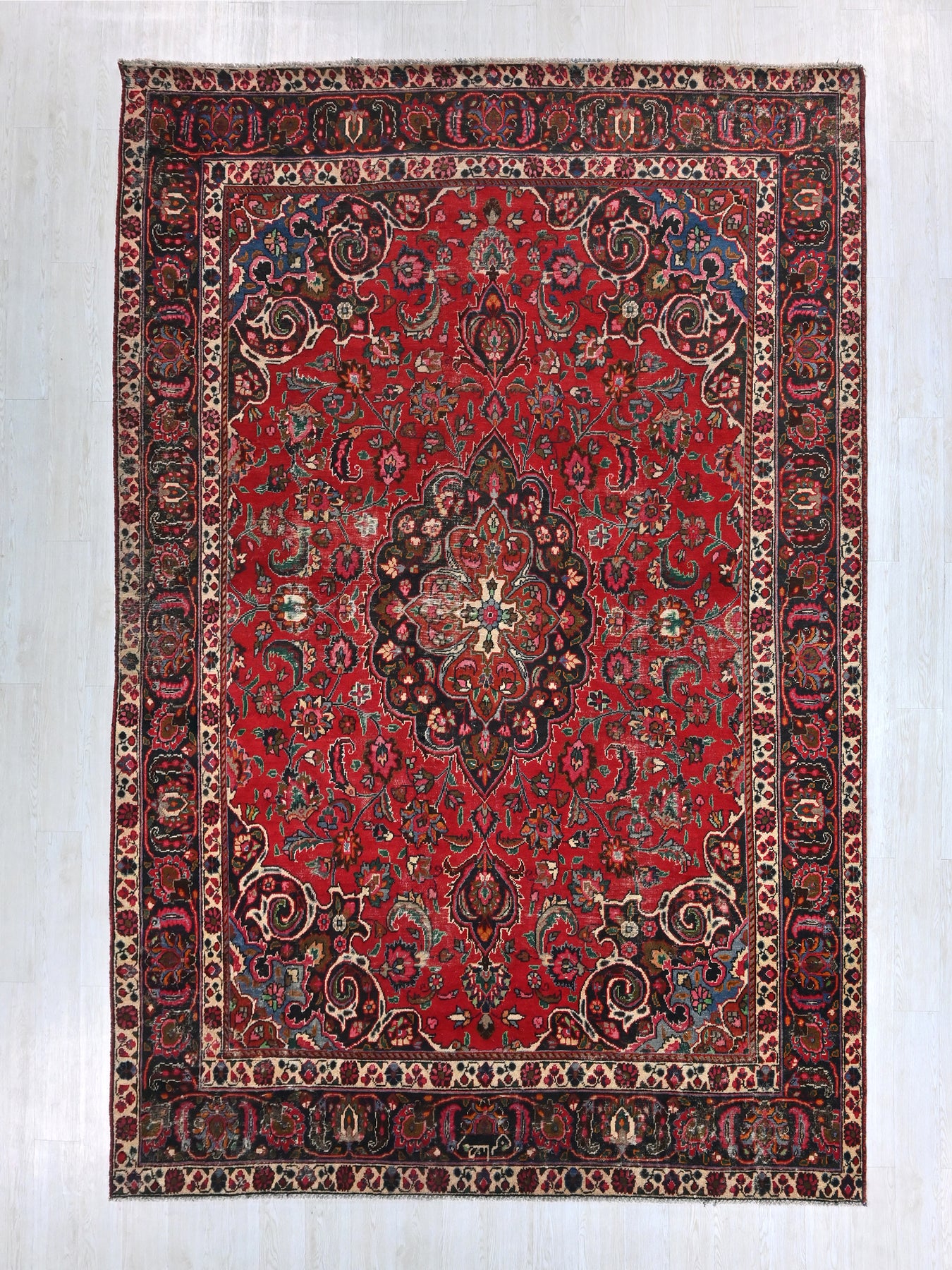 This is a hand-knotted, one-of-a-kind vintage rug. Due to the nature of this piece, there may be slight imperfections in its wear, shape, dimensions, and color. All of our rugs are professionally cleaned and repaired.