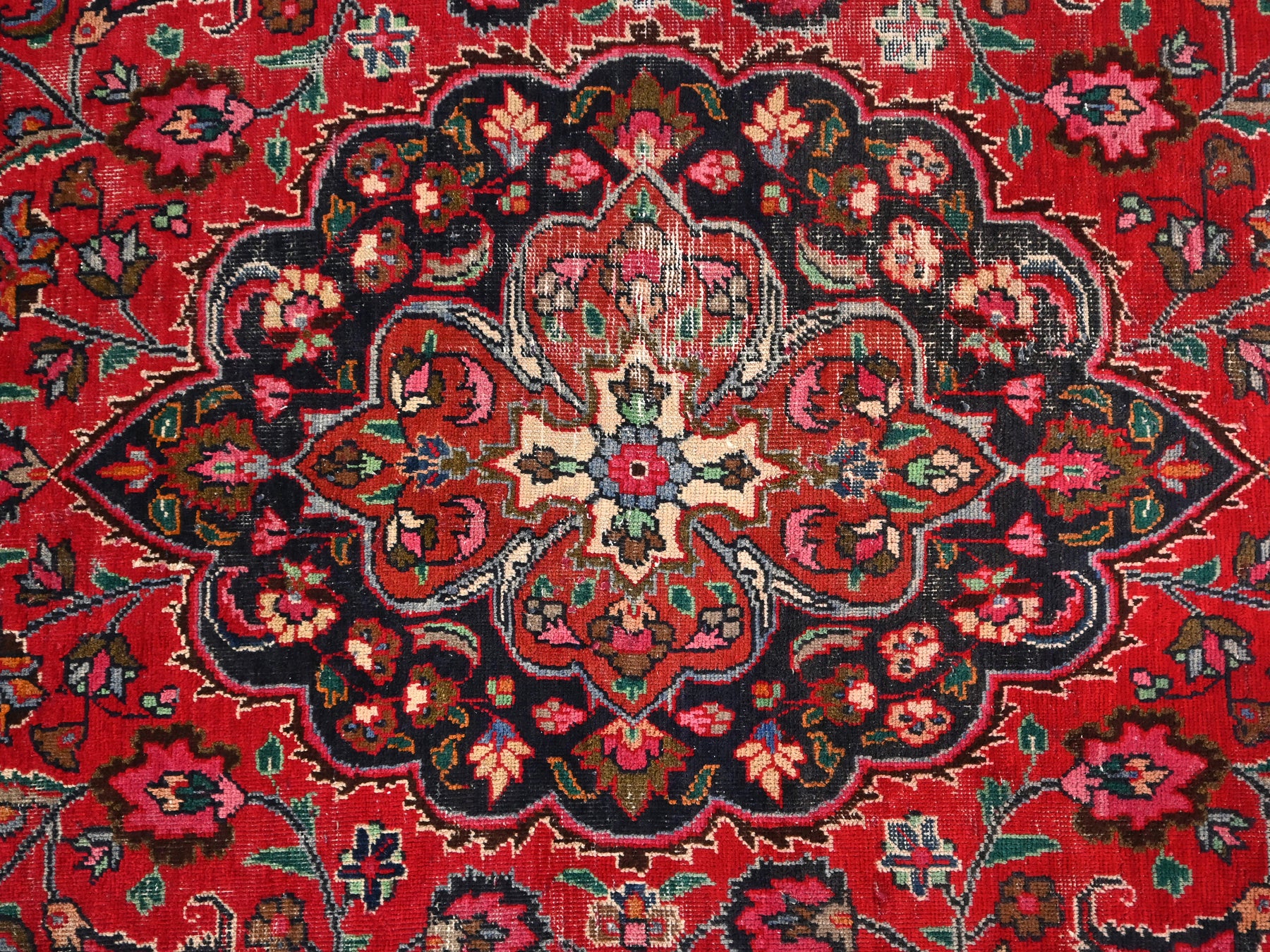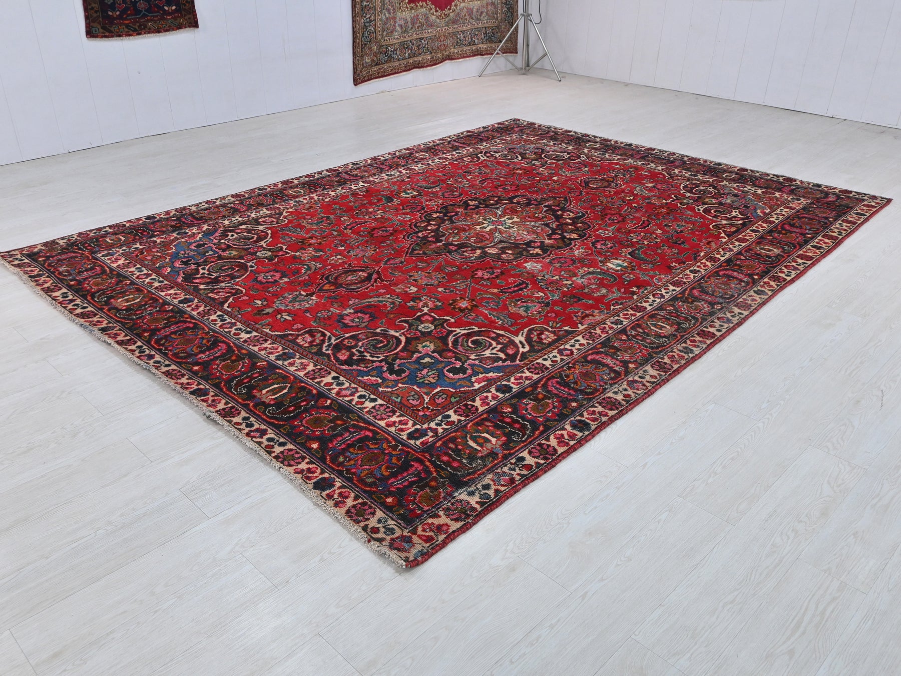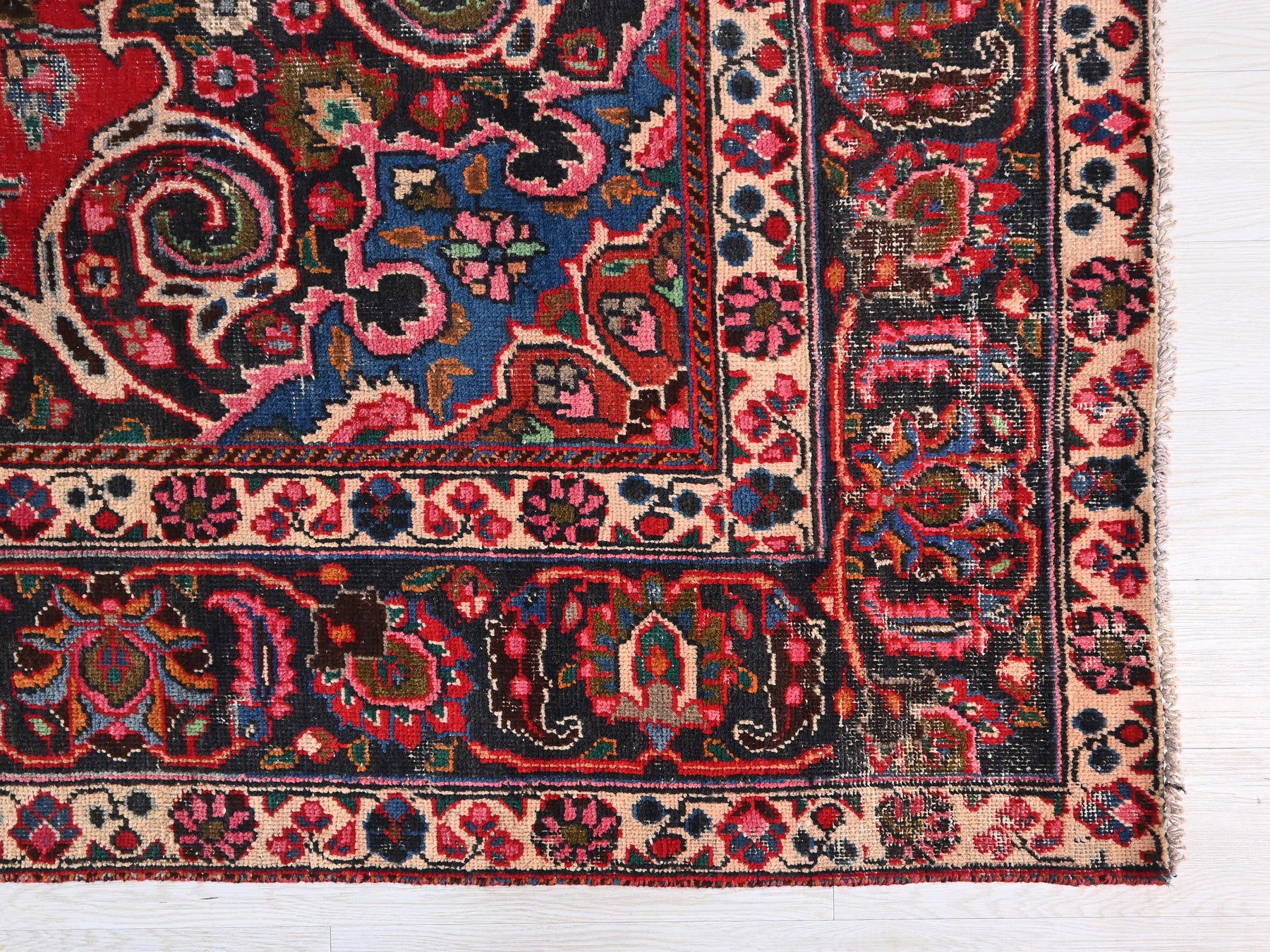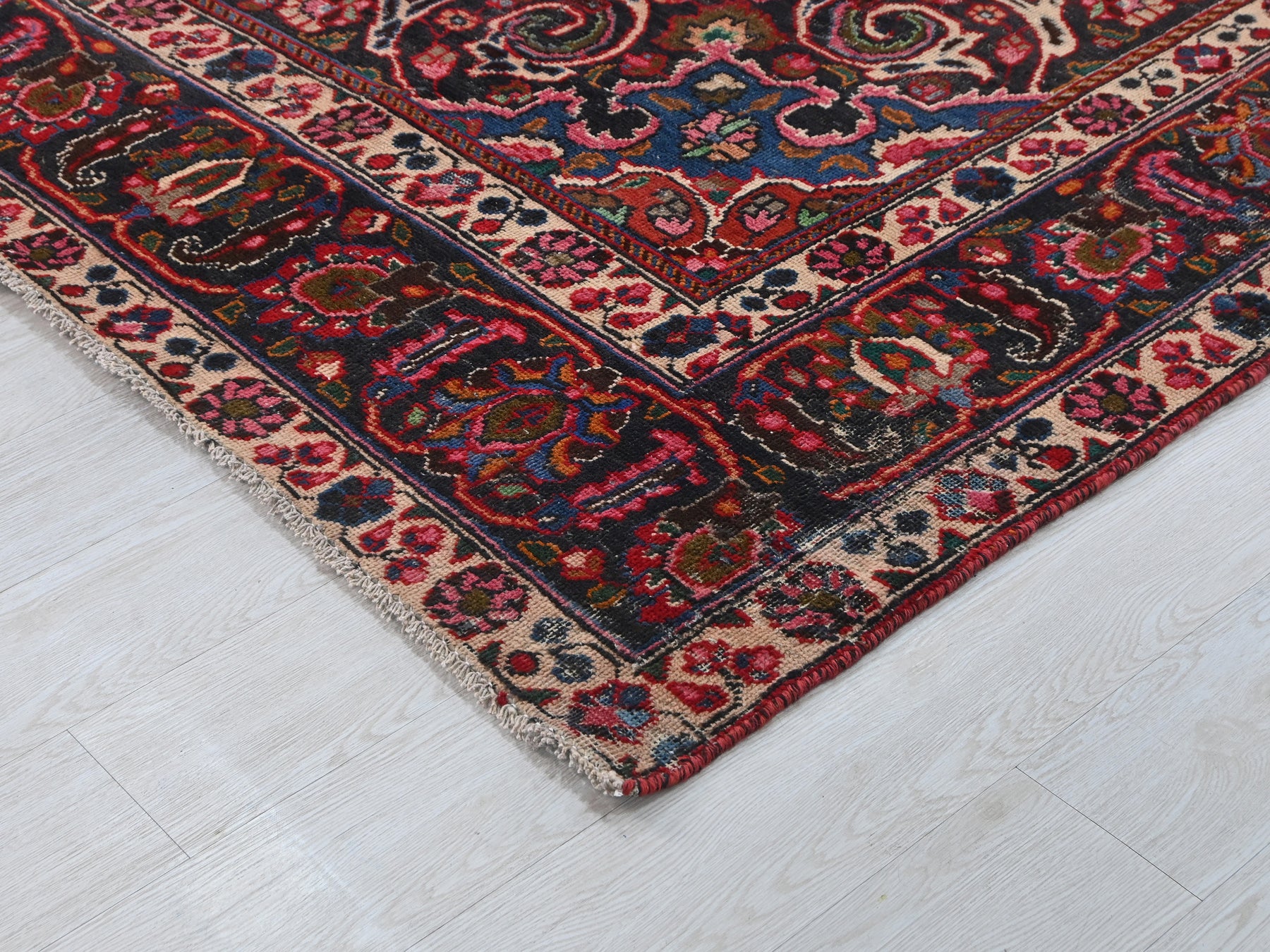 This is a hand-knotted, one-of-a-kind vintage rug. Due to the nature of this piece, there may be slight imperfections in its wear, shape, dimensions, and color. All of our rugs are professionally cleaned and repaired.