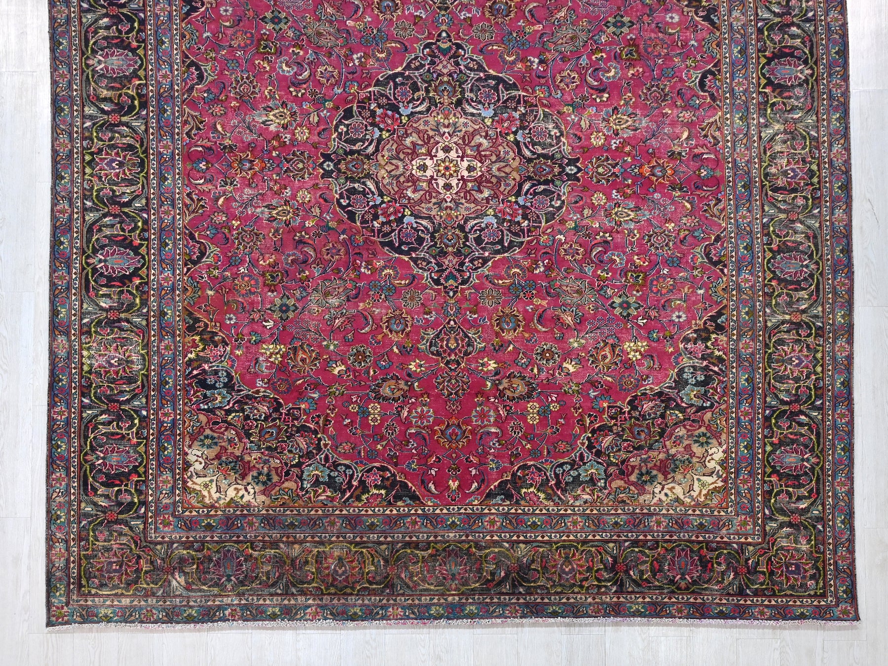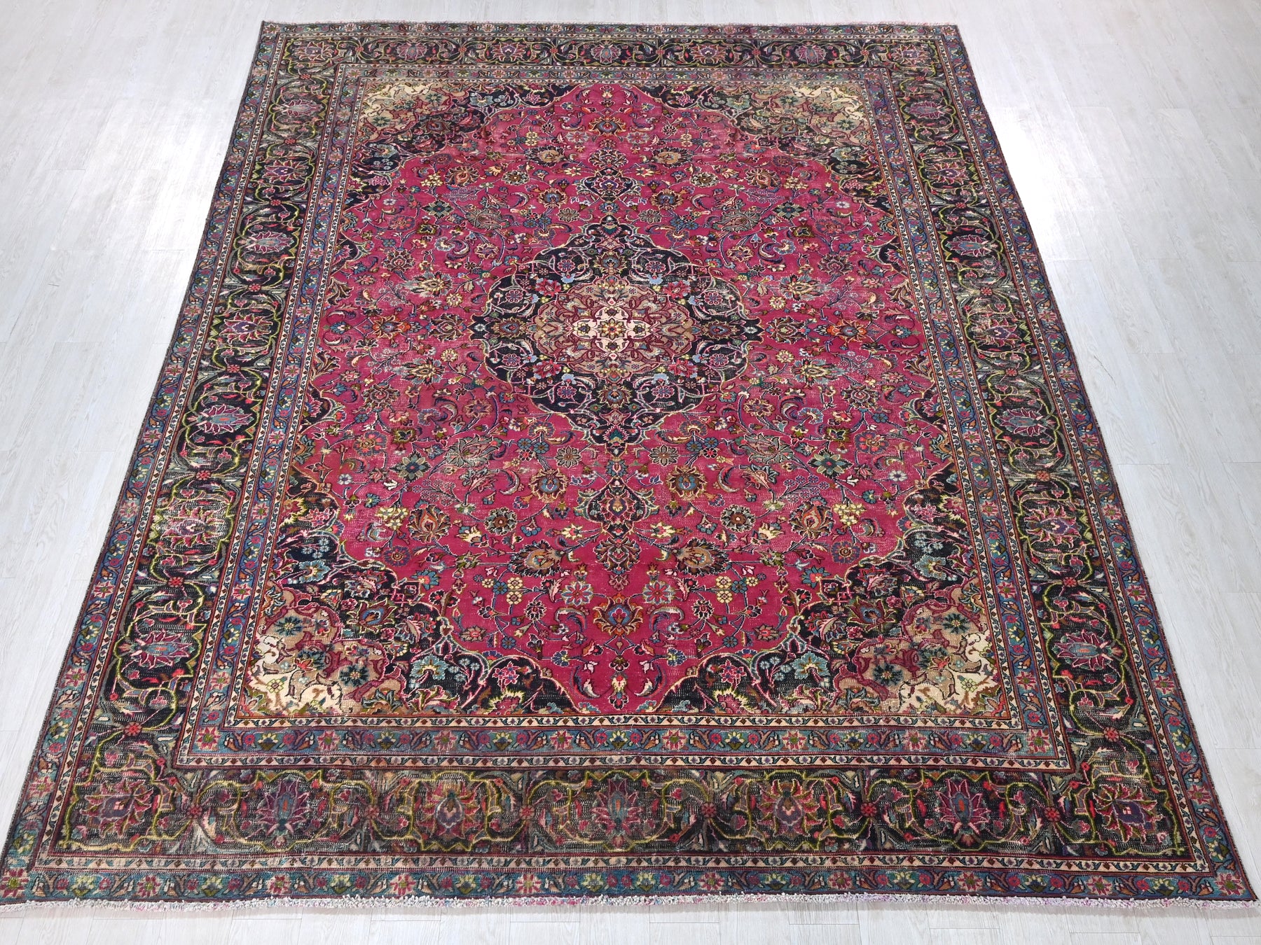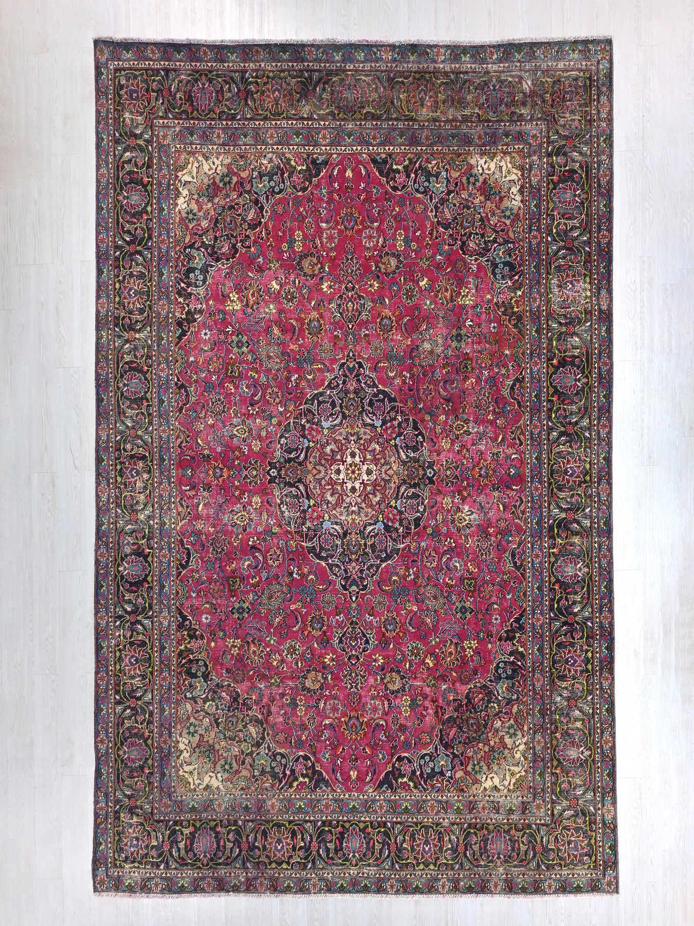 This is a hand-knotted, one-of-a-kind vintage rug. Due to the nature of this piece, there may be slight imperfections in its wear, shape, dimensions, and color. All of our rugs are professionally cleaned and repaired.