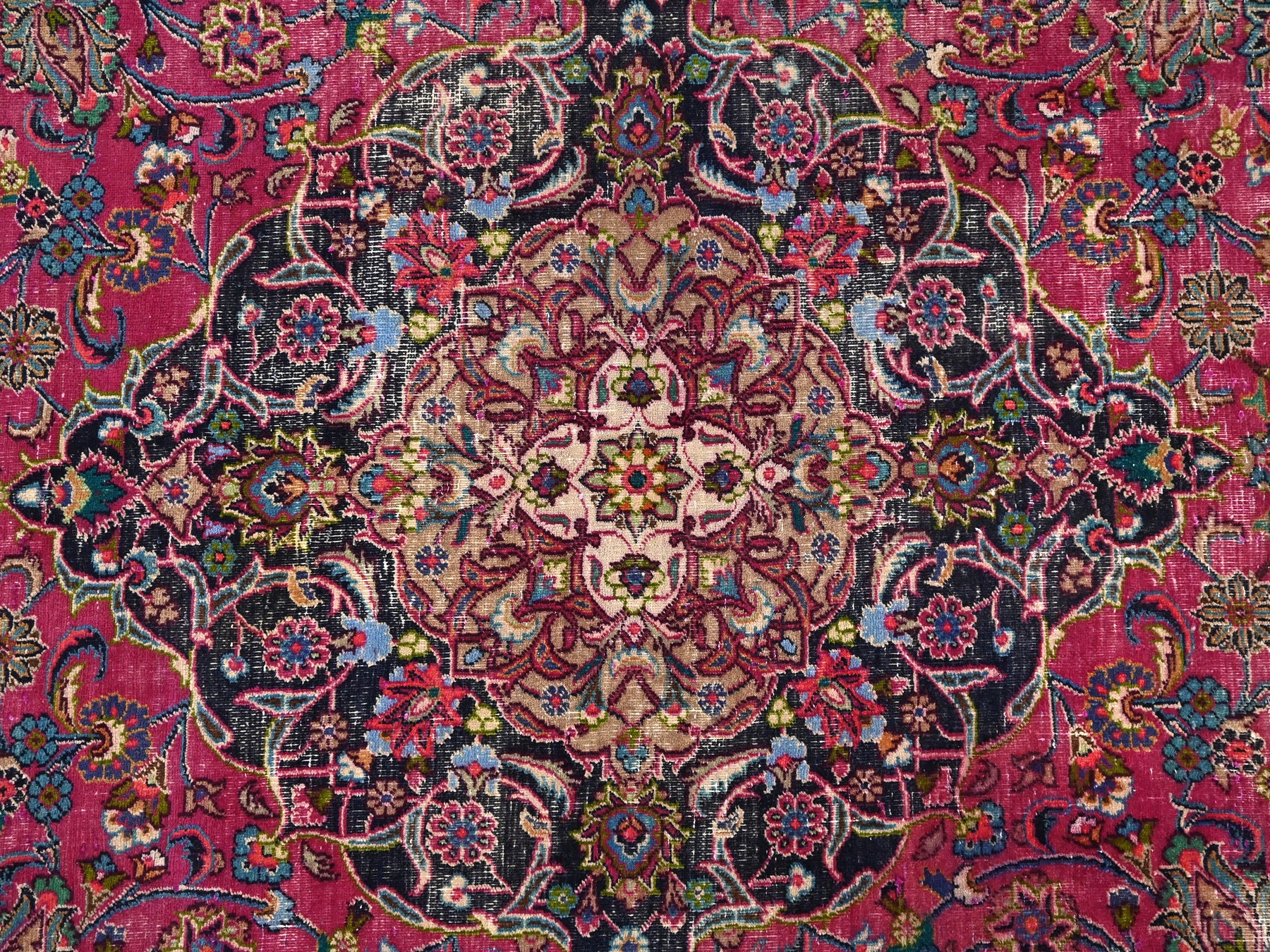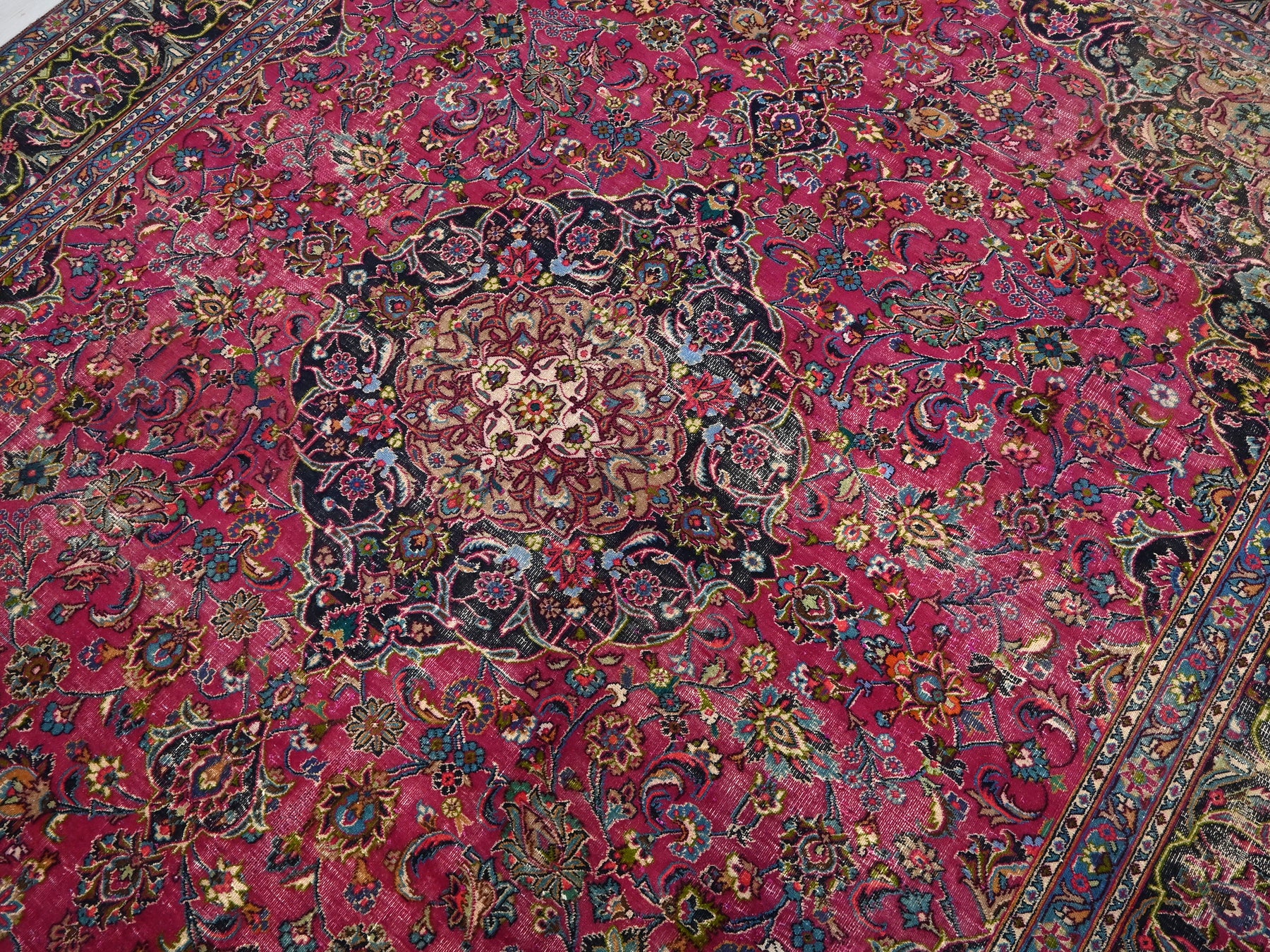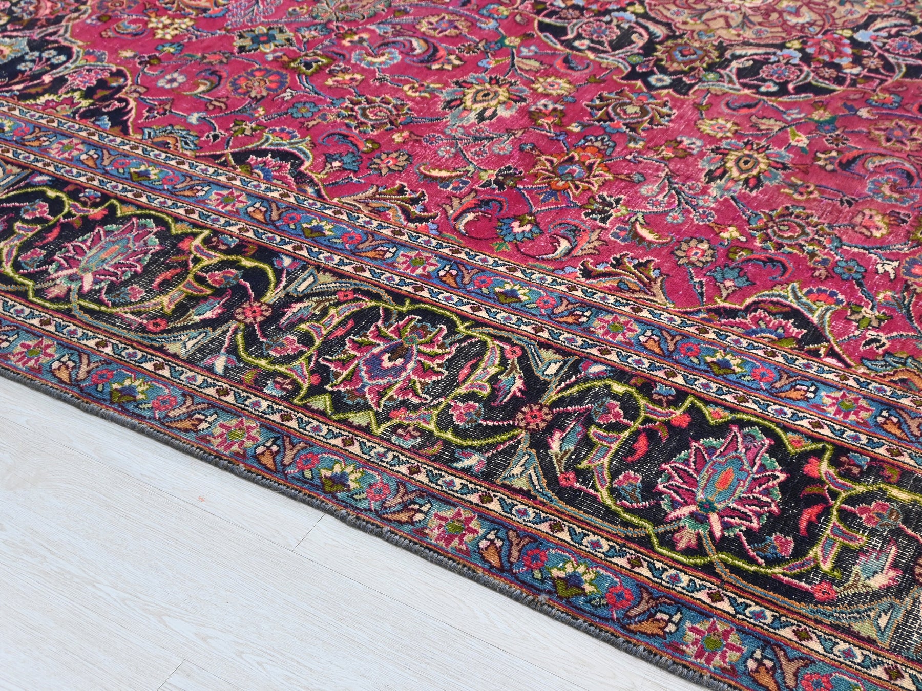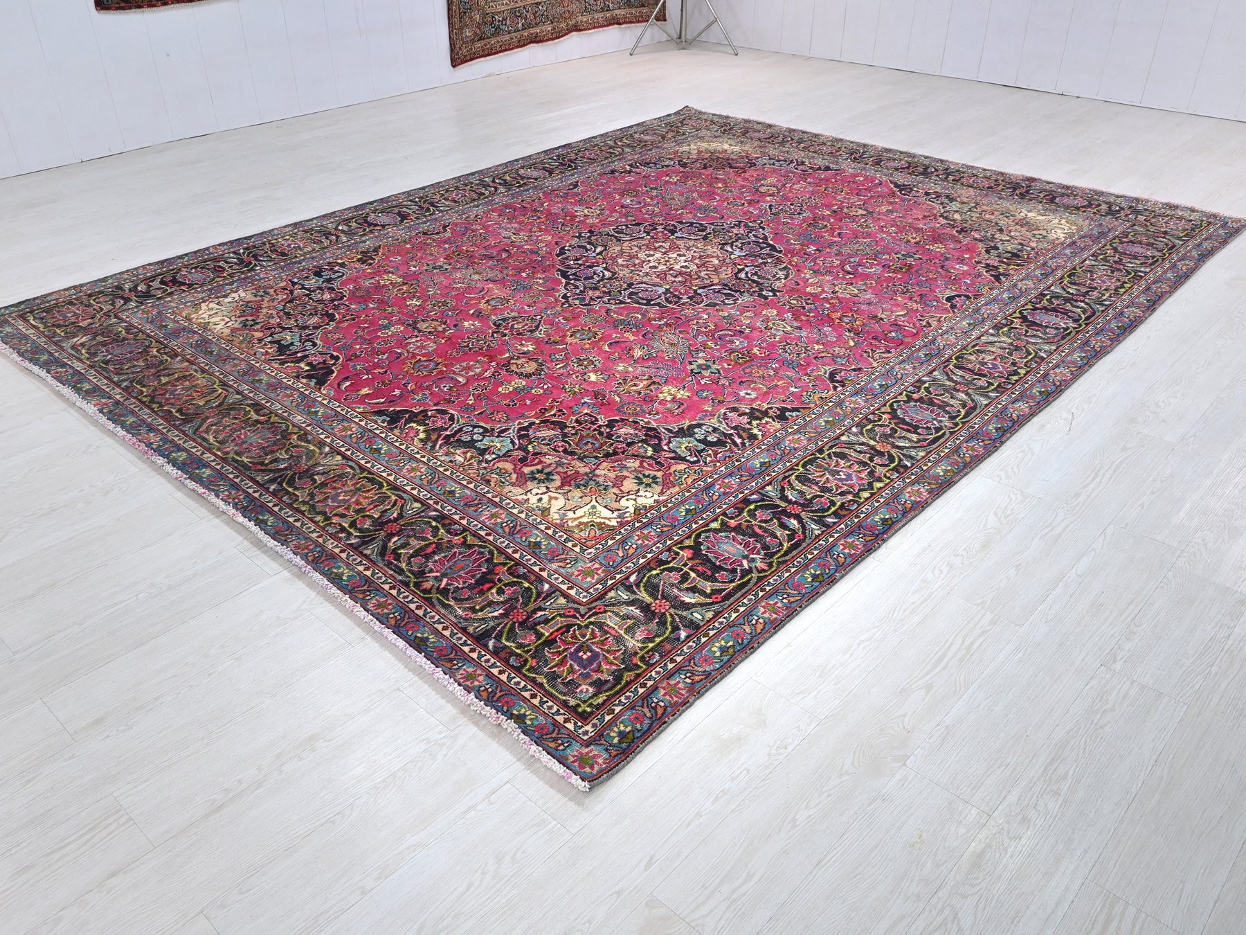 This is a hand-knotted, one-of-a-kind vintage rug. Due to the nature of this piece, there may be slight imperfections in its wear, shape, dimensions, and color. All of our rugs are professionally cleaned and repaired.