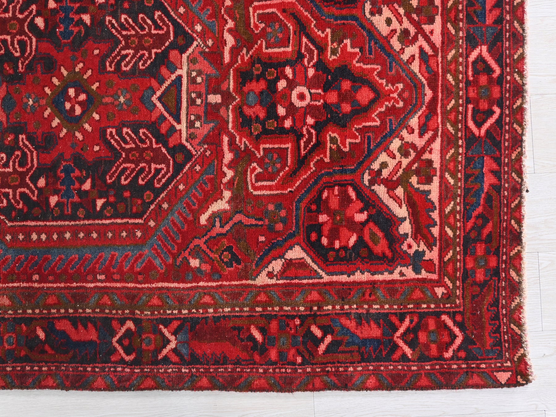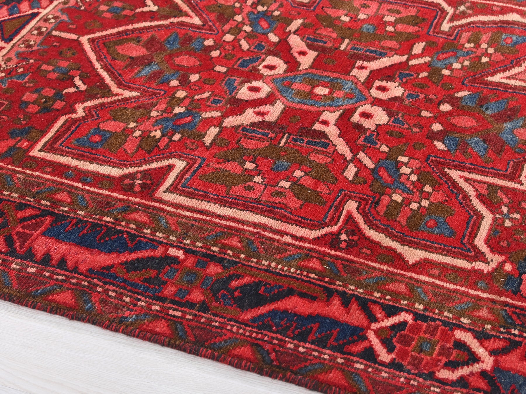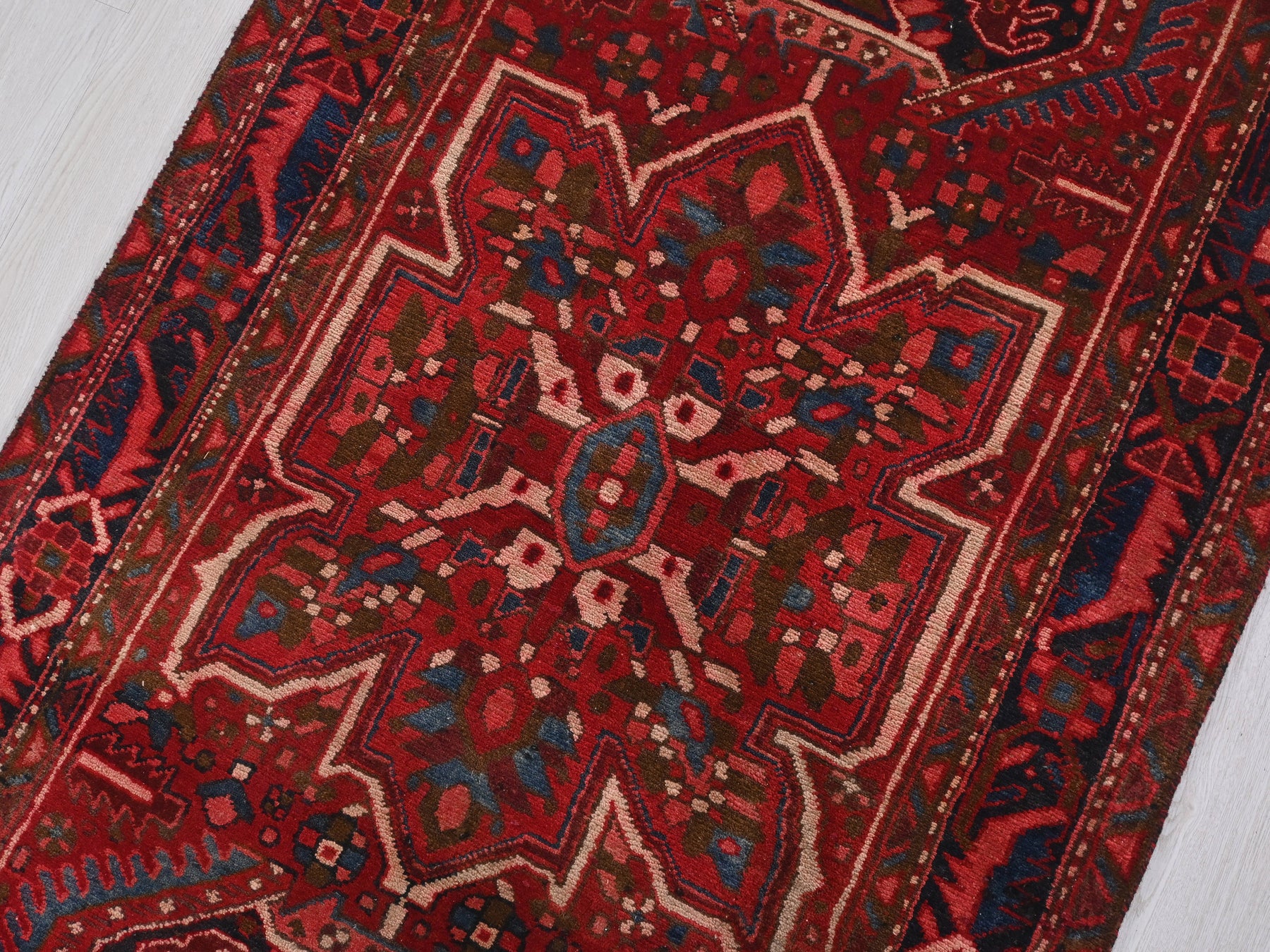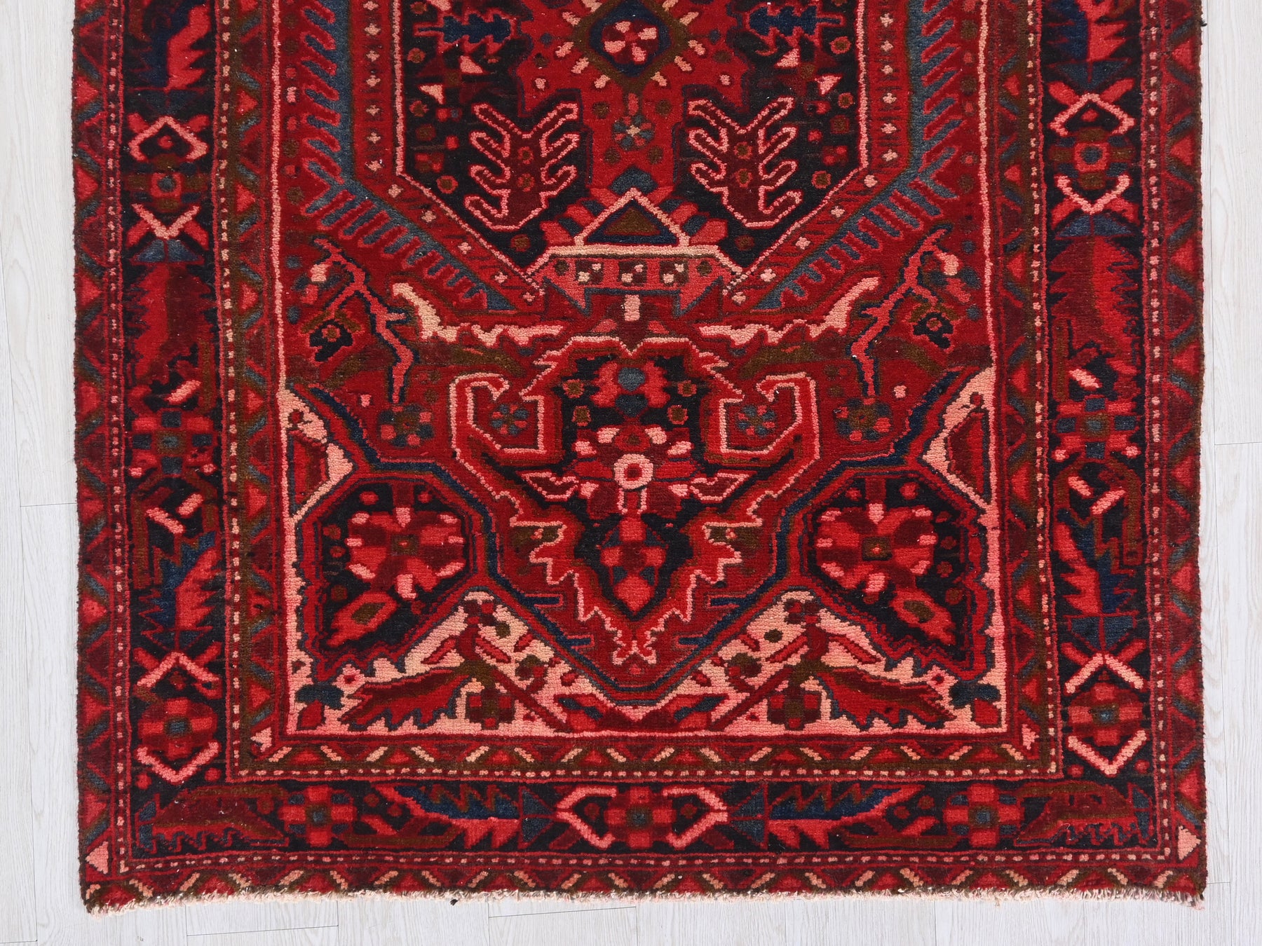 This is a hand-knotted, one-of-a-kind vintage rug. Due to the nature of this piece, there may be slight imperfections in its wear, shape, dimensions, and color. All of our rugs are professionally cleaned and repaired.